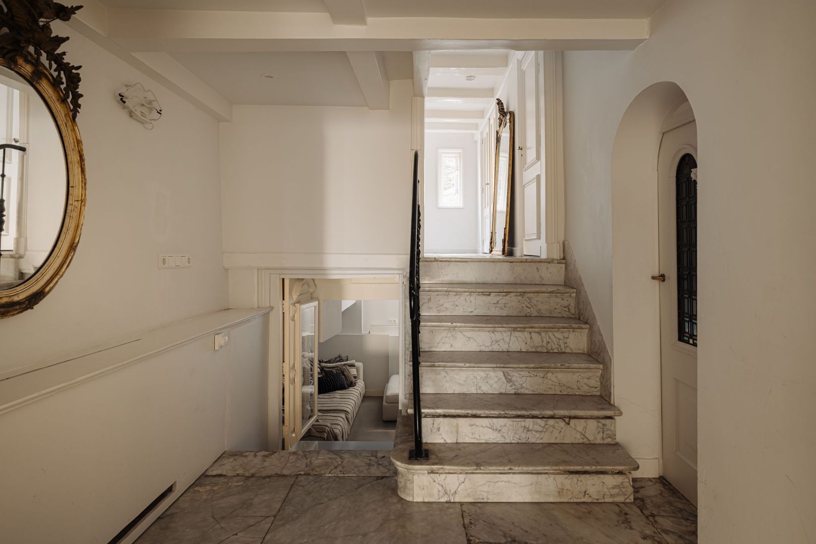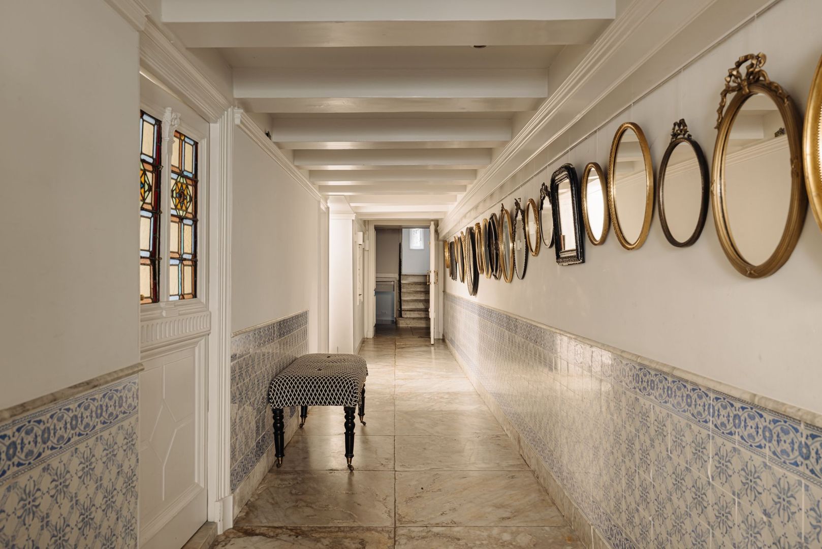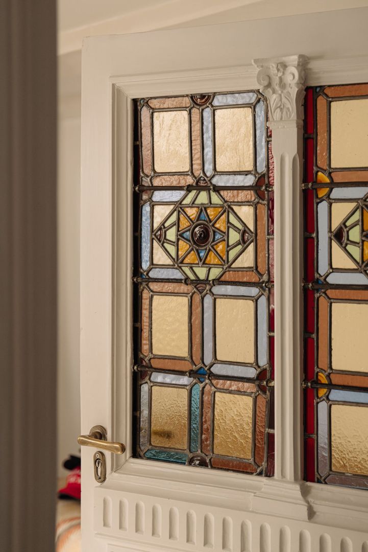 De fraaie glas in lood tussendeur leidt naar een tweede hal met toegang tot de volgende twee (slaap)kamers. De eerste kamer is thans in gebruik als chill/loungekamer. De tweede kamer beslaat een volwaardige slaapkamer en is tevens prettig van formaat. Een klein venster aan de tuinzijde voorziet deze kamer van daglicht. De fraai vormgegeven marmeren trap brengt u naar de tussenverdieping geheel aan de achterzijde gelegen. Vanuit de ruime hal, met prachtige originele en kleurrijke tegelvloer, zijn de overige twee slaapkamers toegankelijk evenals het separate toilet.