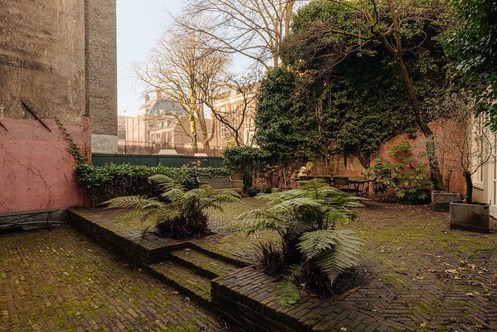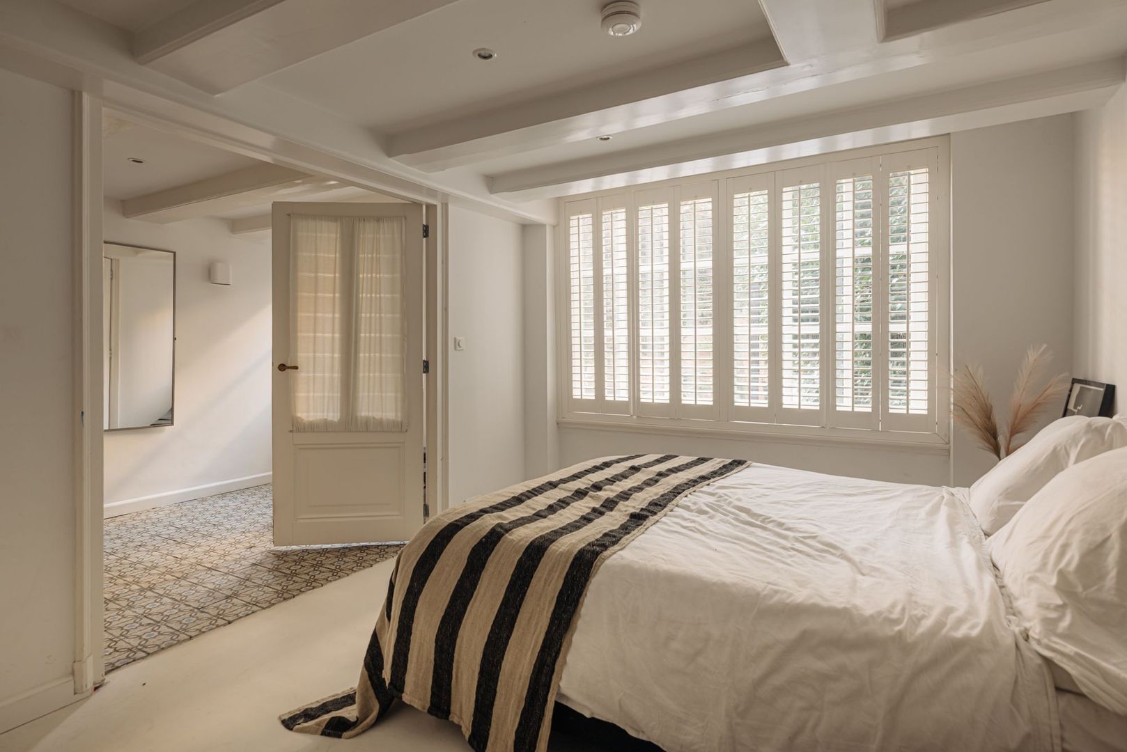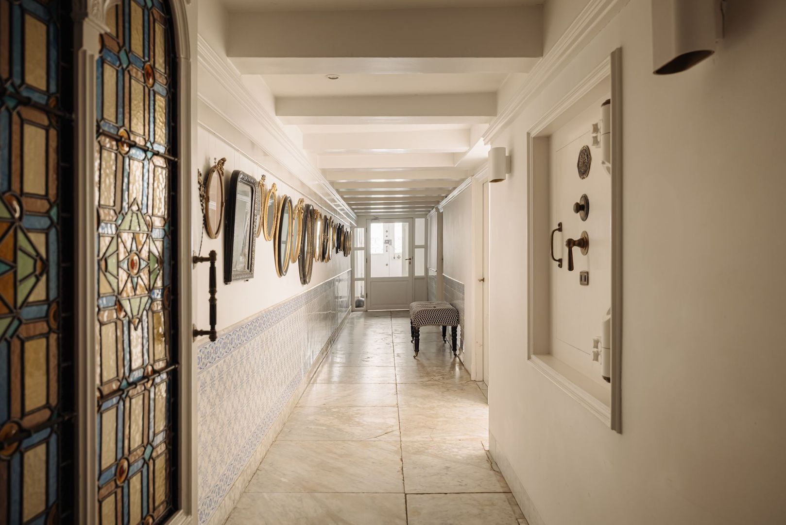 De fraaie glas in lood tussendeur leidt naar een tweede hal met toegang tot de volgende twee (slaap)kamers. De eerste kamer is thans in gebruik als chill/loungekamer. De tweede kamer beslaat een volwaardige slaapkamer en is tevens prettig van formaat. Een klein venster aan de tuinzijde voorziet deze kamer van daglicht. De fraai vormgegeven marmeren trap brengt u naar de tussenverdieping geheel aan de achterzijde gelegen. Vanuit de ruime hal, met prachtige originele en kleurrijke tegelvloer, zijn de overige twee slaapkamers toegankelijk evenals het separate toilet.