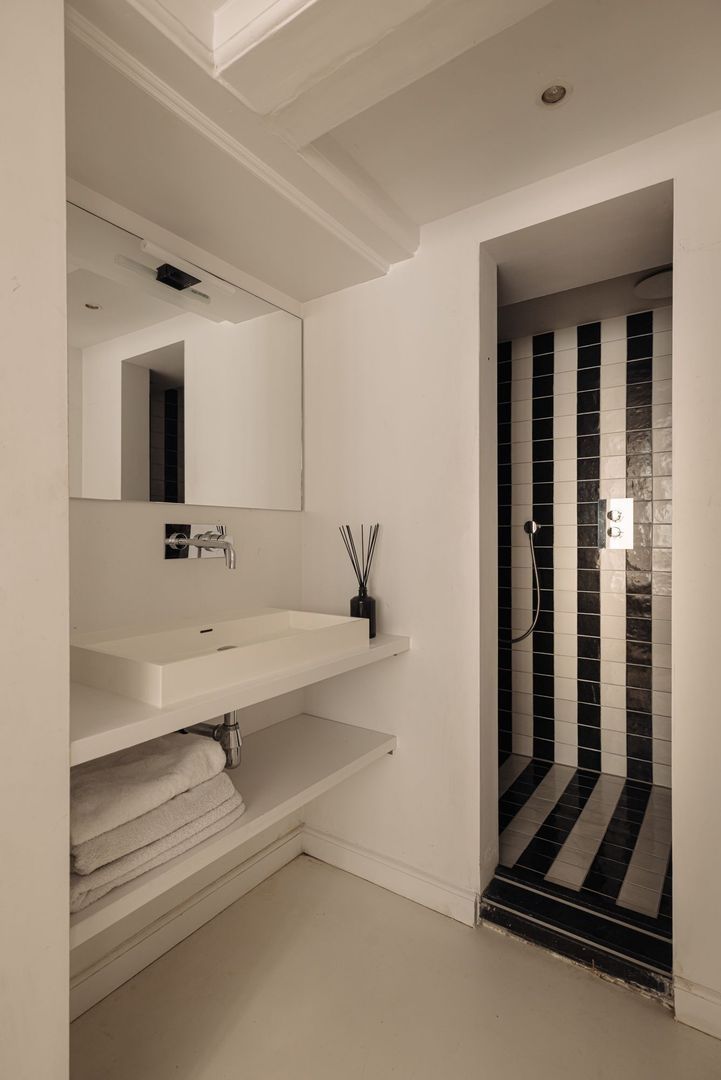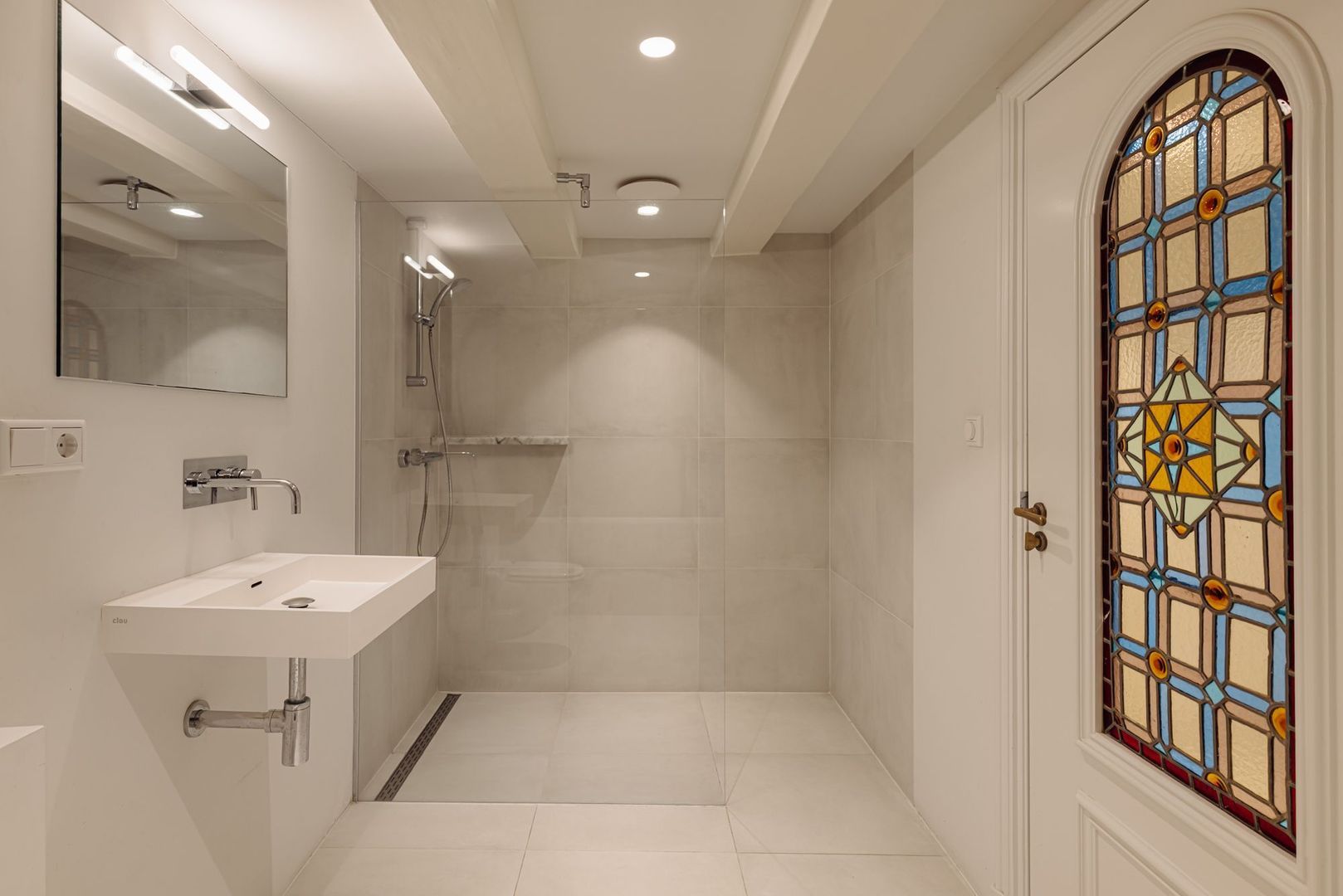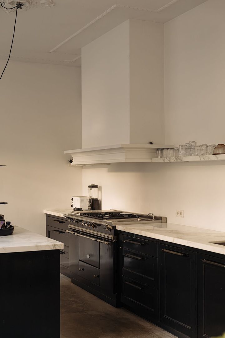 De woning is tweemaal toegankelijk; de hoofdentree bevindt zich op de bel-etage, bereikbaar via het charmante bordes. Vanuit hier leidt de lange gang naar de entree tot het appartement. De eigen hal, voorzien van het separate toilet, biedt een elegante glas in staal tussendeur naar de leefverdieping waar men direct de woonkeuken betreedt, gelegen aan de achterzijde van het pand en voorzien van een gietvloer met vloerverwarming. Deze omvangrijke woonkeuken is strak vormgegeven en voorzien van een kasteneiland waartegenover de brede apparatuurswand is gesitueerd. Beide delen zijn uitgevoerd met zwarte kasten/lades en een breed marmeren werkblad. Voorts is de keuken luxe geoutilleerd met als eye-catcher het brede fornuis met maar liefst drie ovens, een teppanyaki plaat en ingebouwde stoomfunctie. Bijzonder te vermelden zijn de massieve kastdeuren evenals de drie omvangrijke ramen met zicht op eigen tuin.