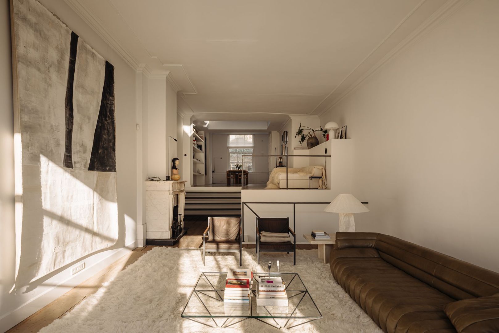 Aansluitend op de woonkeuken met ruime eetgelegenheid is een knusse loungehoek gerealiseerd vanwaar de donkere trap naar ondergelegen zitkamer leidt. Deze immens grote ruimte biedt plaats voor een geweldige zithoek evenals een extra eet- of werkruimte. De originele werkende open haard geeft deze ruimte een bijzonder sfeervolle uitstraling. De vaste witte trap leidt naar ondergelegen souterrain; tevens bereikbaar vanaf de straatzijde vanwaar het tochtportaal met garderobeplaats toegang biedt tot de indrukwekkende lange gang. Deze gang is aan weerszijde voorzien van een authentiek betegelde wand in een blauw/witte kleurstelling. Opmerkenswaardig is de ingebouwde, grote kluis met goede bergruimte.