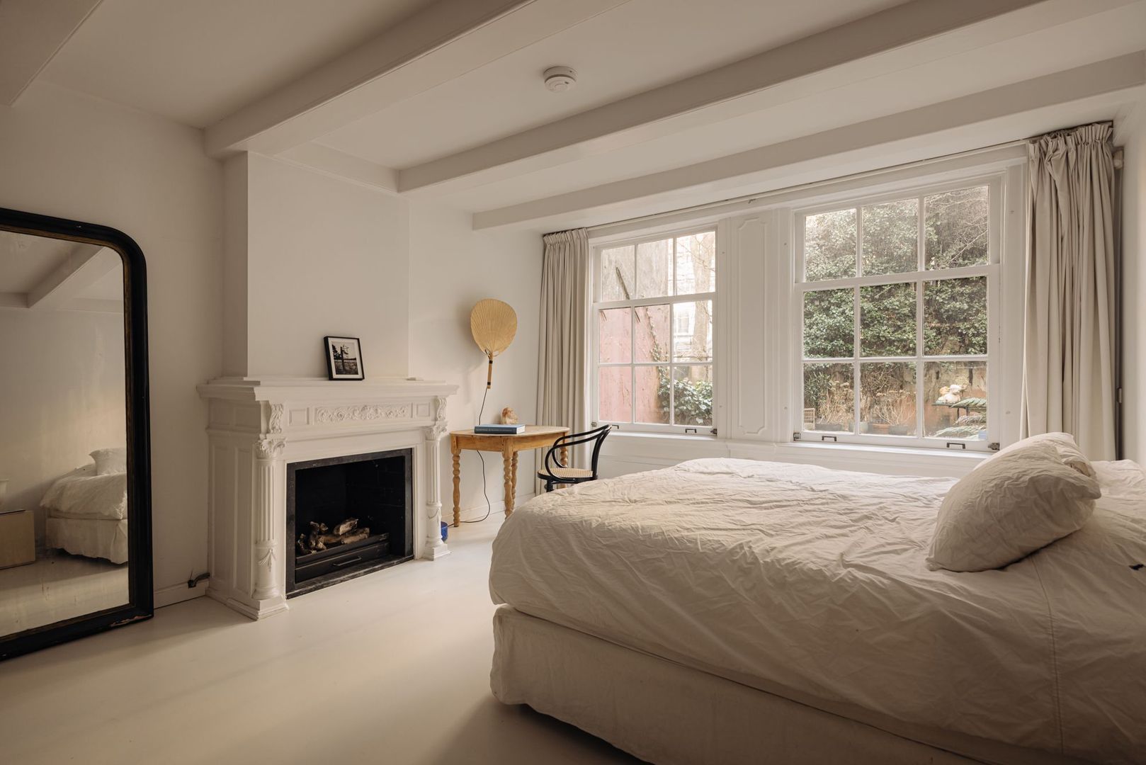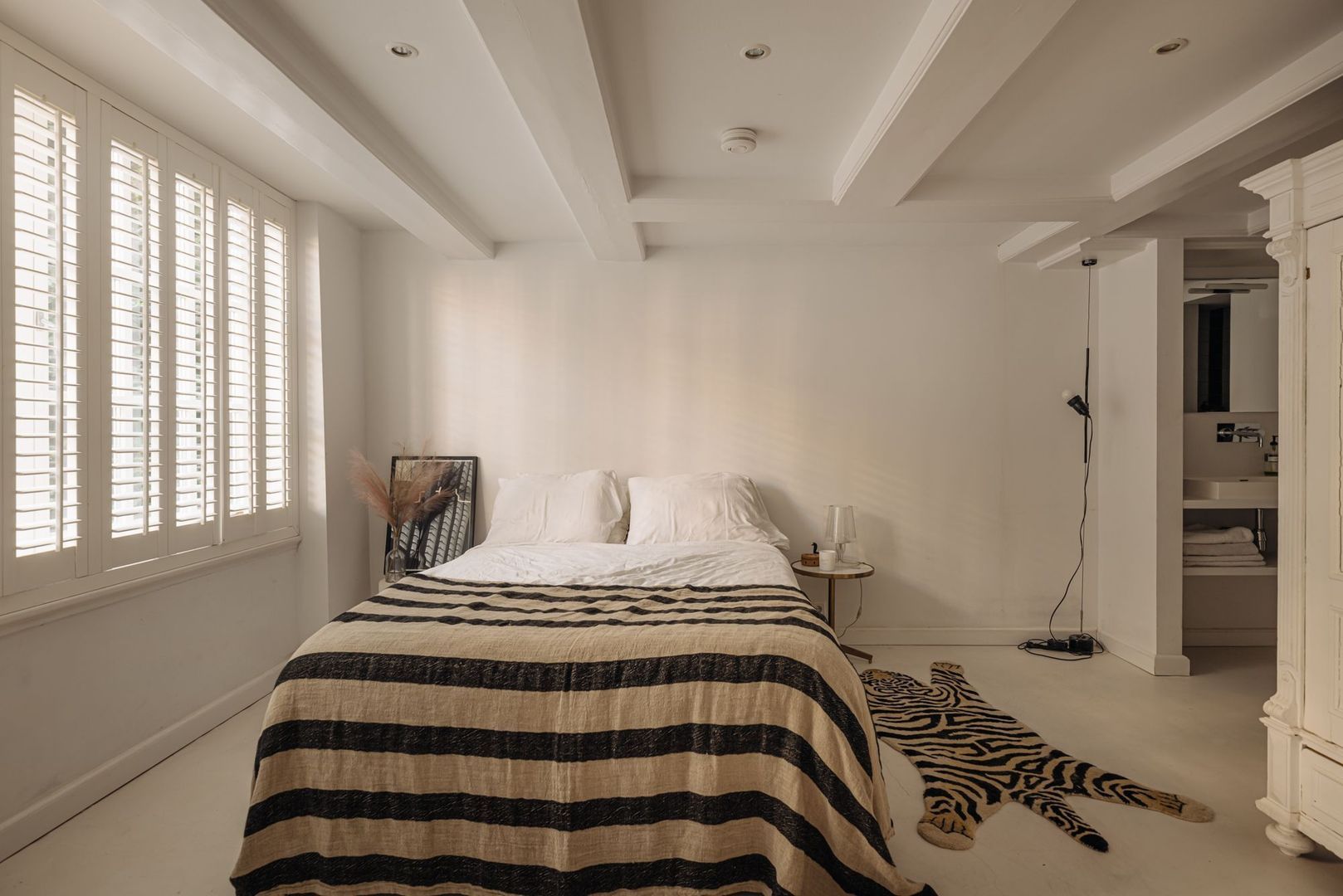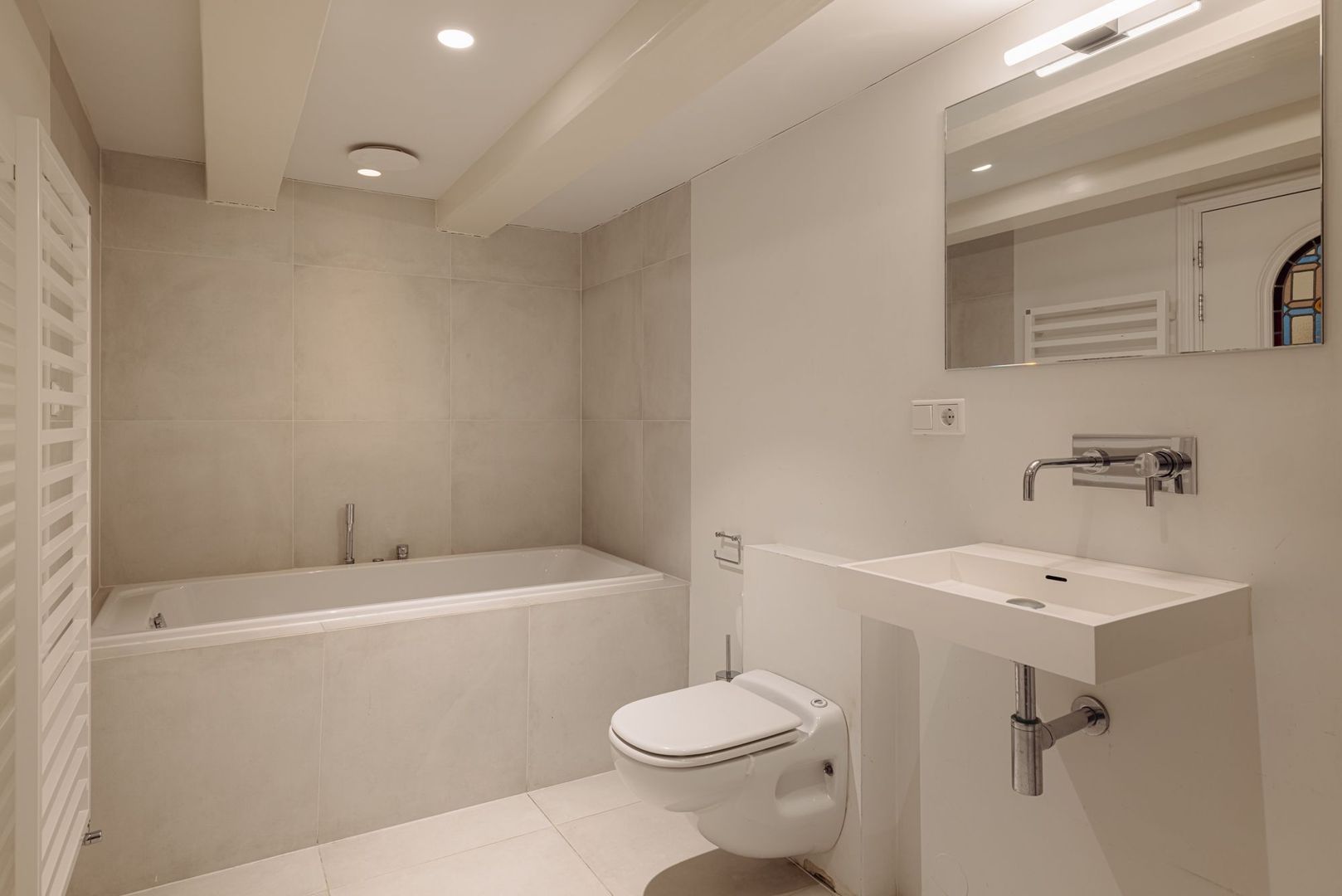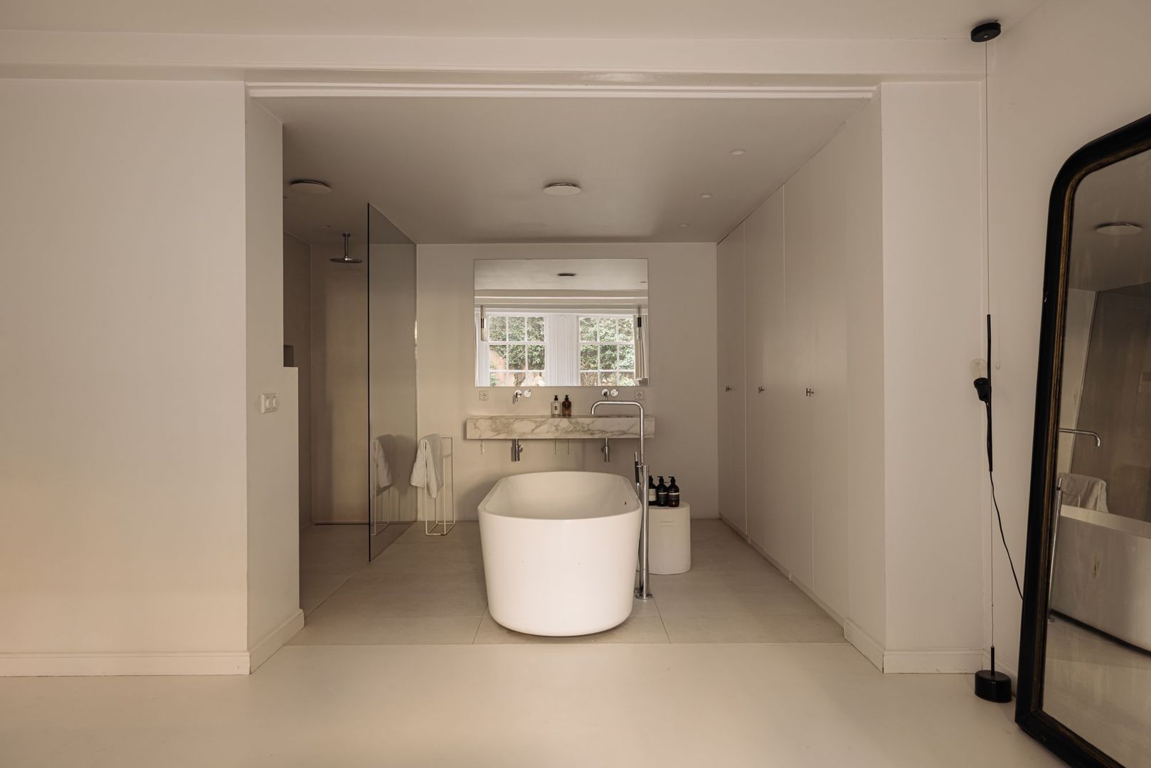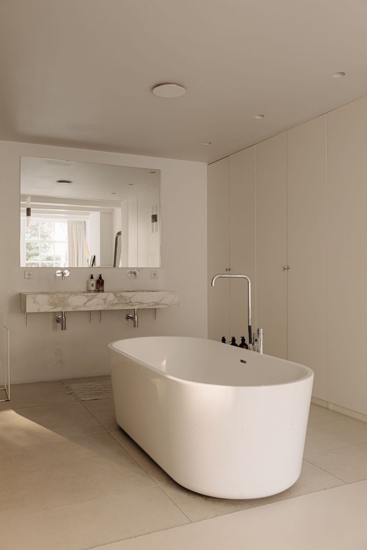 De hoofdslaapkamer is aan de linkerzijde gelegen en kijkt geweldig uit over eigen tuin (zonder inkijk). Geheel licht van uitvoering en voorzien van een mooie schouw beschikt deze kamer over een serene uitstraling. De ruime en-suite badkamer sluit naadloos aan op het slaapgedeelte en is tevens geheel licht uitgevoerd en voorzien van een ovaal losstaand bad, een ruime inloopdouche met stort/handdouche, zwevend toilet en een breed marmeren wastafel met dubbele ingebouwde kraan. Prettige bijkomstigheid is de brede inbouwkastenwand aan de rechterzijde.