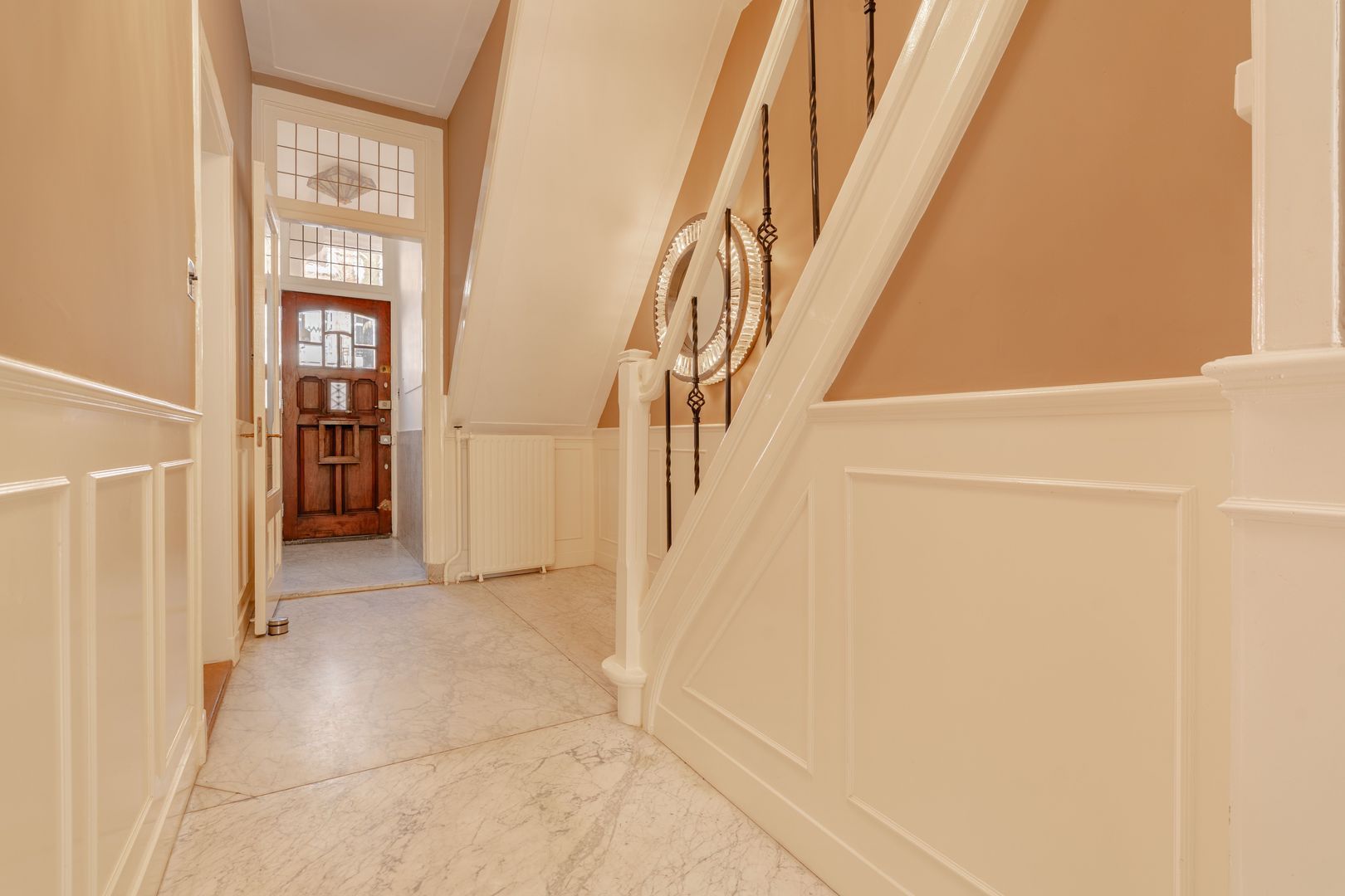 Direct in het oog springen de vele originele elementen die door de gehele woning zorgvuldig bewaard zijn gebleven, waaronder glas-in-loodramen, en-suite deuren, een prachtige erker, klassieke paneeldeuren, sierlijke ornamentenplafonds, authentieke schouwen en een indrukwekkend marmeren tochtportaal met originele tegelvloer. De woning strekt zich uit over twee royale woonlagen en beschikt daarnaast over een ruime kelder met natuurlijke lichtinval. Indien gewenst zou men deze kelder kunnen uitbreiden tot een volwaardig souterrain om een drielaags benedenhuis te realiseren.