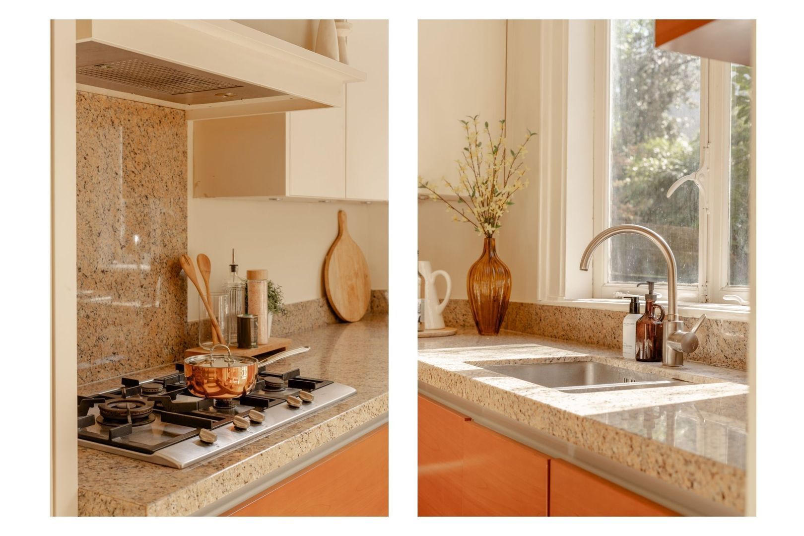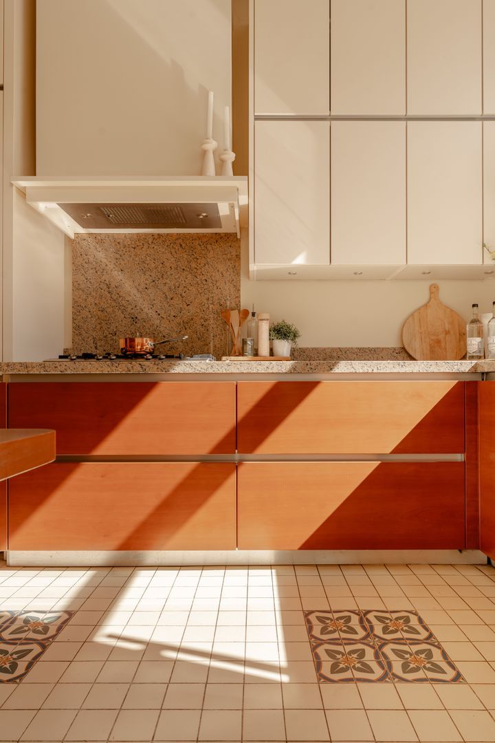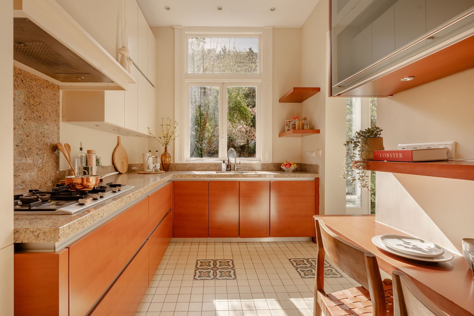 De ruime keuken bevindt zich naast de serre, heeft een L-opstelling en is uitgevoerd met greeploze houten kasten en lades in combinatie met een naturel gemêleerd natuurstenen werkblad. Voorts is de keuken voorzien van diverse inbouwapparatuur. Prettig detail is het venster met zicht op eigen tuin.
