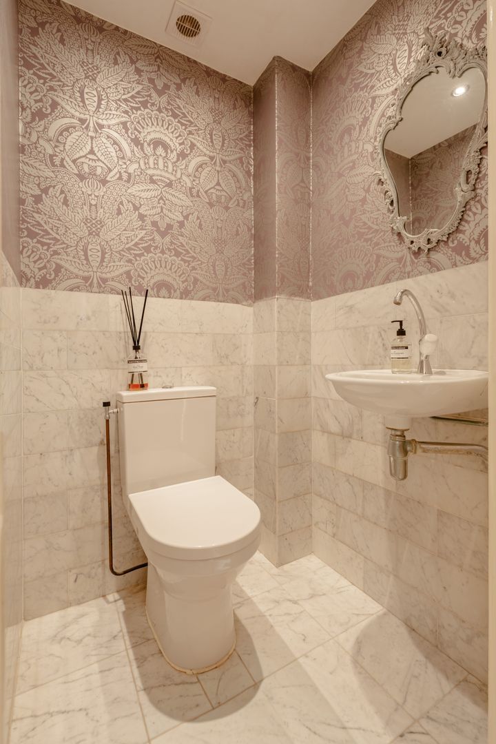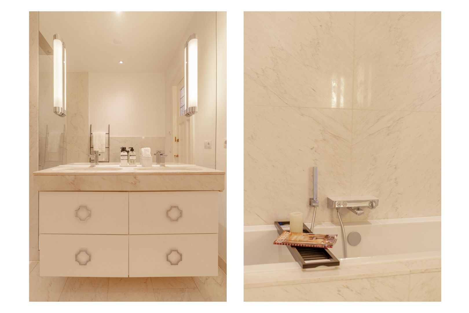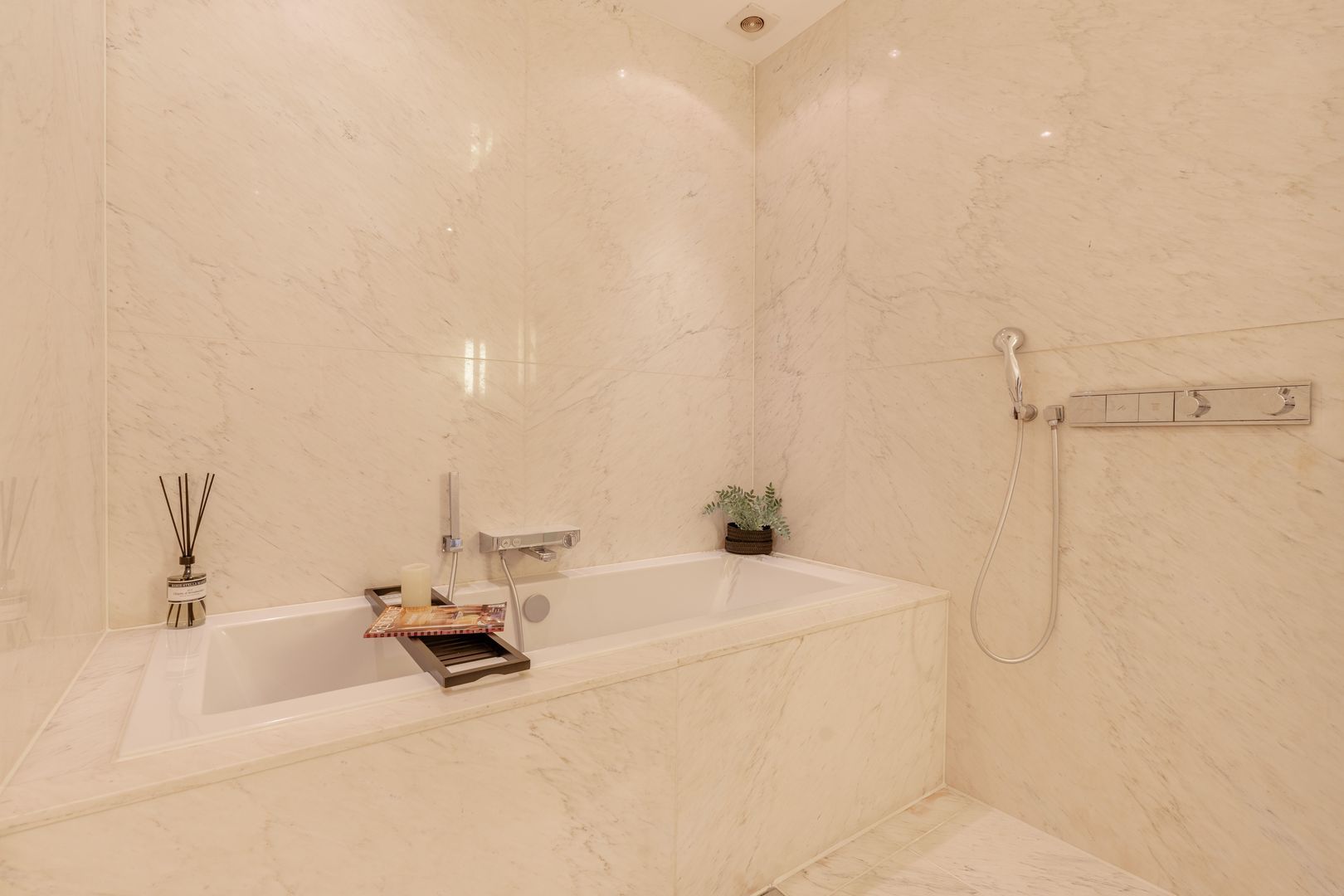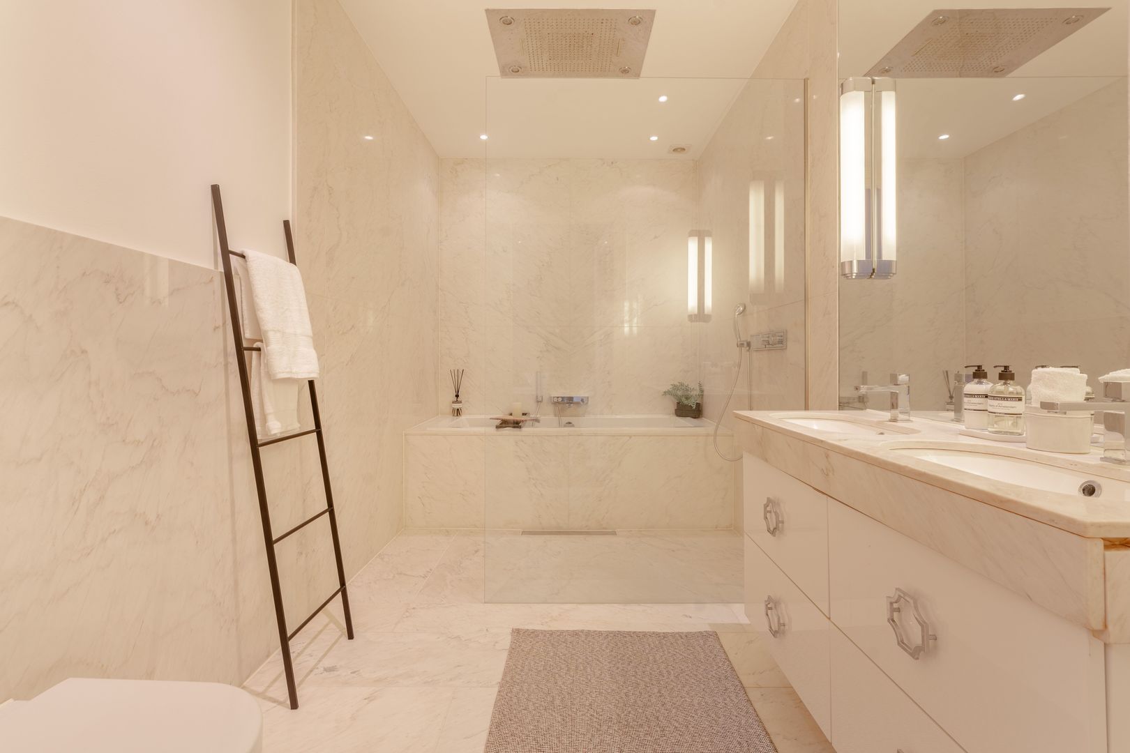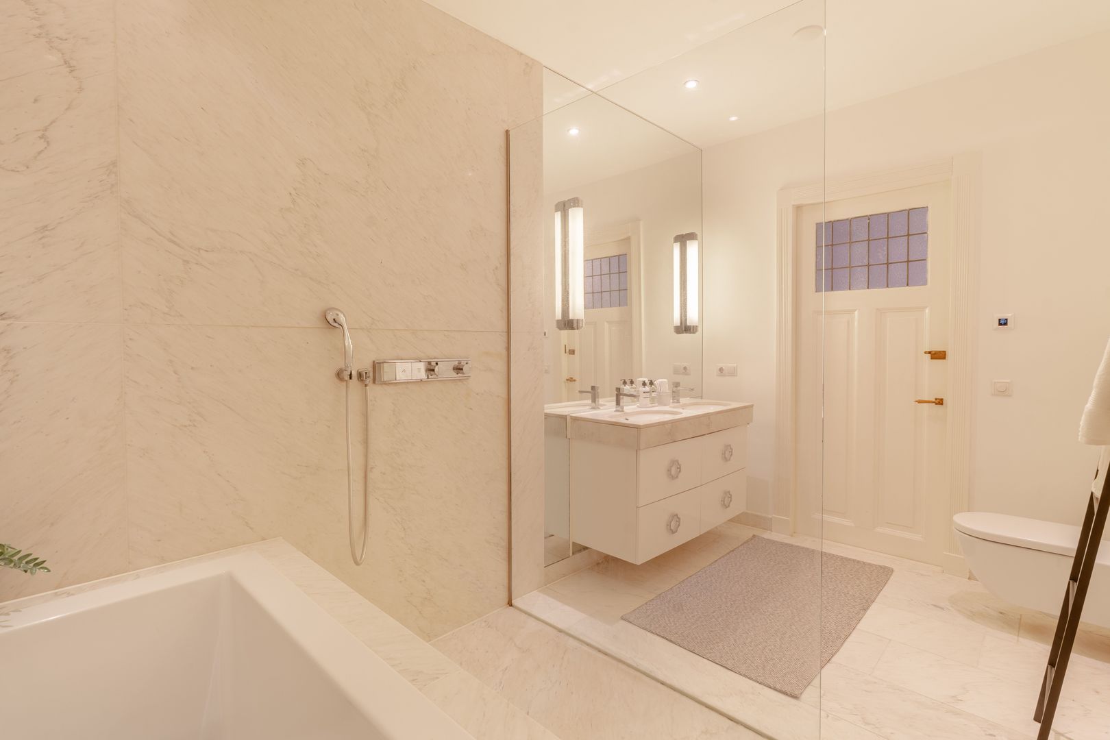 In het midden van deze woonlaag is de badkamer gesitueerd, deze is geheel uitgevoerd met marmer en is bijzonder ruim te noemen. De badkamer voorziet in een ligbad, plafond regendouche met bijbehorende handdouche, wit wastafelmeubel met zandkleurig natuurstenen blad en een zwevend toilet.