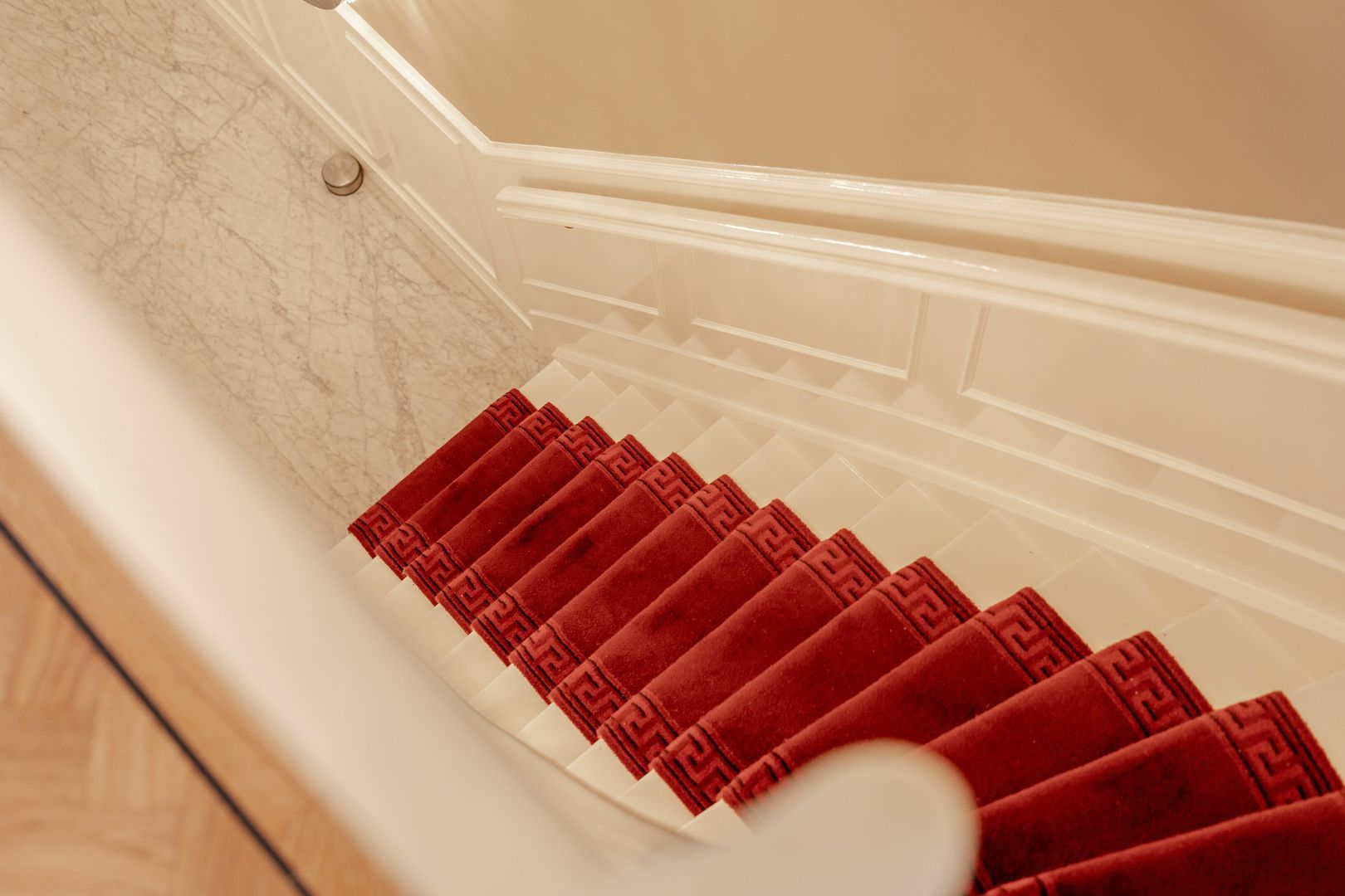 De woonverdieping is, op de hal, keuken en serre na, uitgevoerd met een kwalitatieve Tapis parketvloer met zwarte bies.