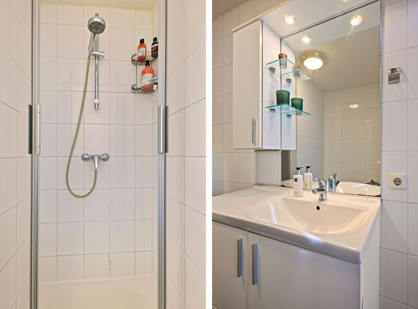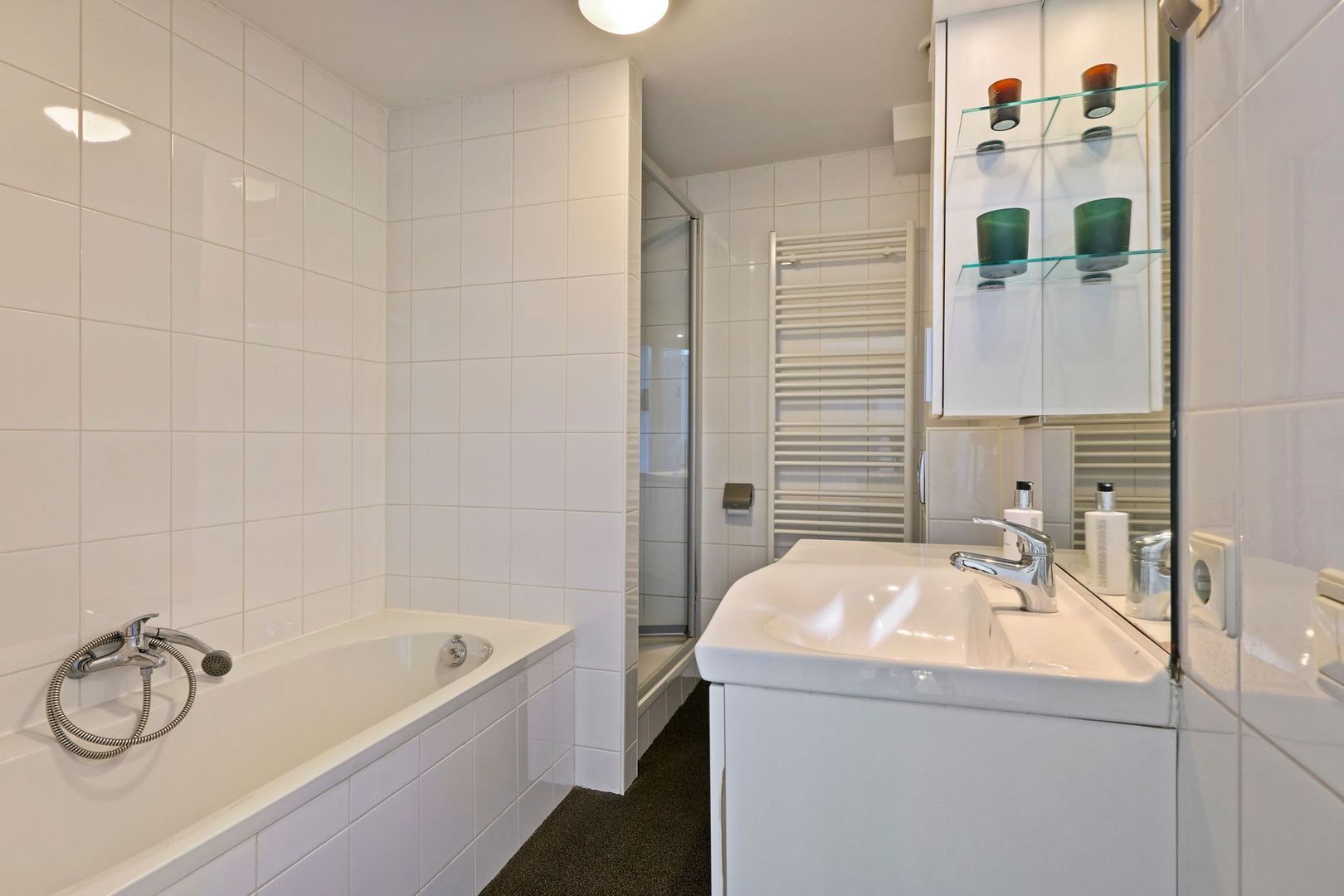 In het midden van de woning is de badkamer gesitueerd. Deze is ruim te noemen en is uitgevoerd met een donkere vloer en een geheel wit betegelde wand. Voorts is de badkamer voorzien van een ligbad, zwevend toilet, douchecabine, handdoekradiator en een wastafelmeubel.