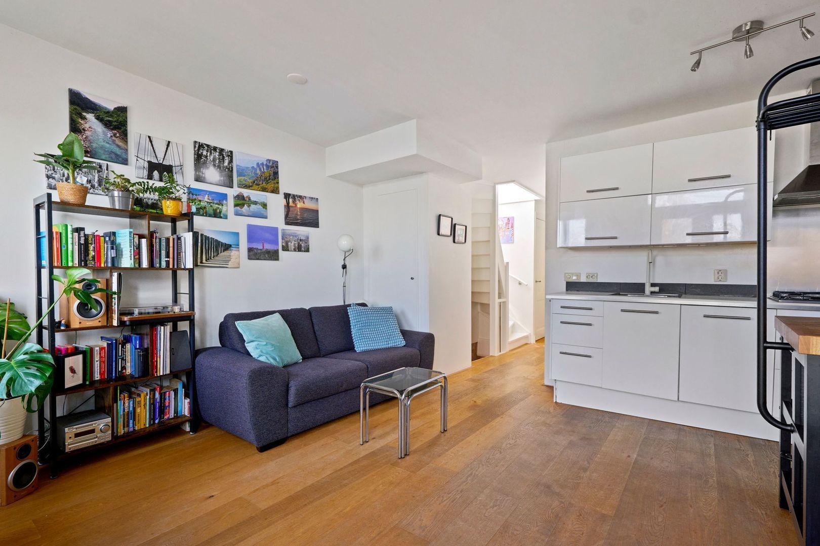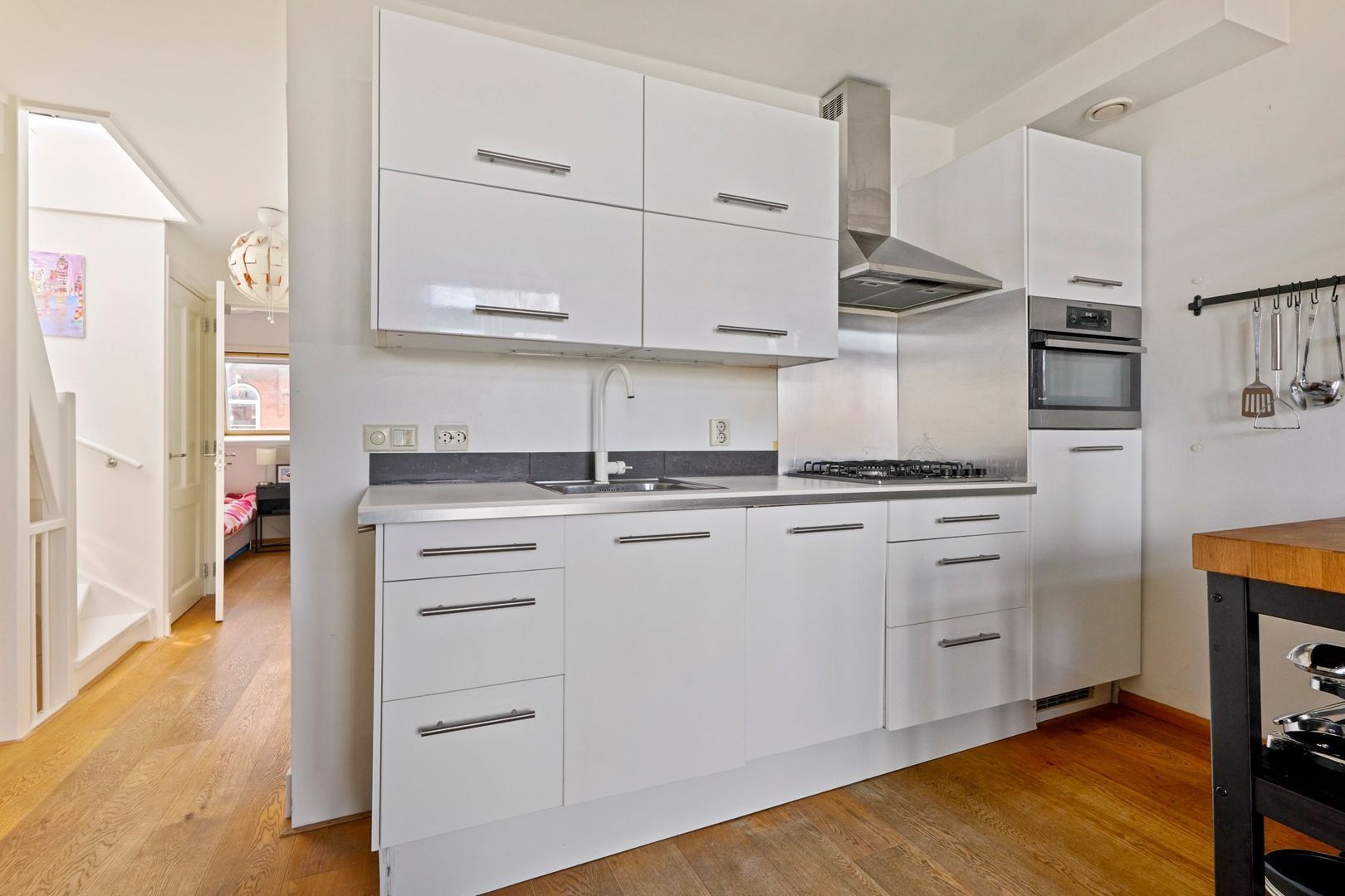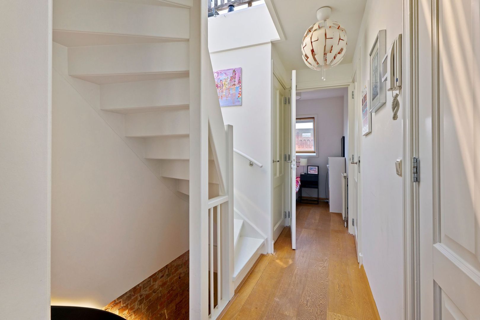 Via de gemeenschappelijke entree met een verzorgd trappenhuis bereik je de derde verdieping waar zich de toegang tot deze bovenwoning bevindt. De overloop, voorzien van meterkast en garderobe, heeft een houten trap naar de vierde verdieping. Leuk detail is de robuuste stenen wand langs de trap met verlichting achter de trapleuning. Op de vierde verdieping kom je direct uit in de lichte living aan de achterzijde. Deze gezellige ruimte biedt plaats voor zowel een zithoek als een eetgedeelte en beschikt over een open keuken.