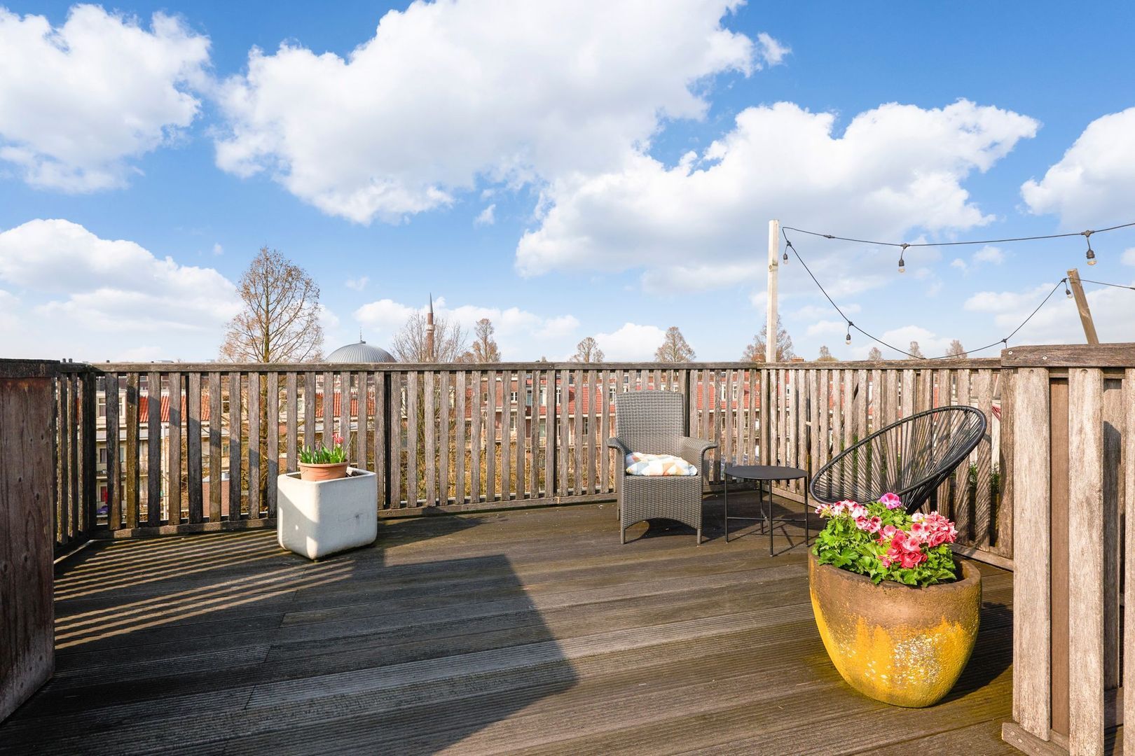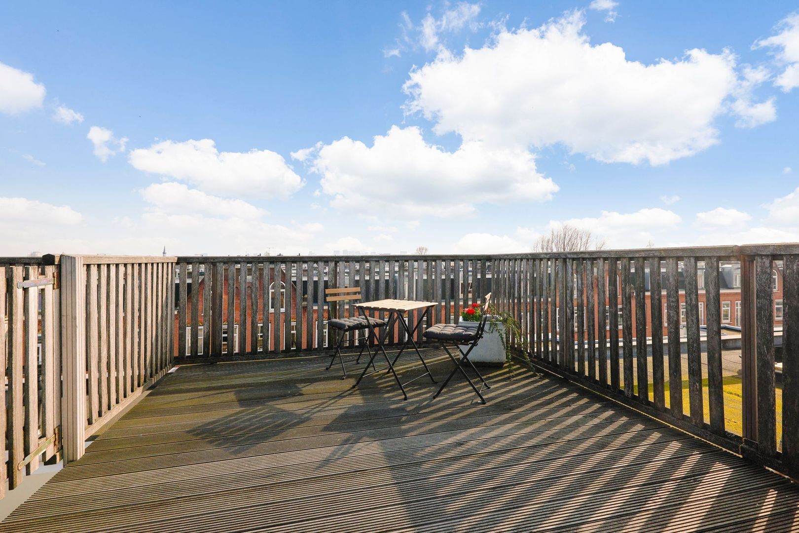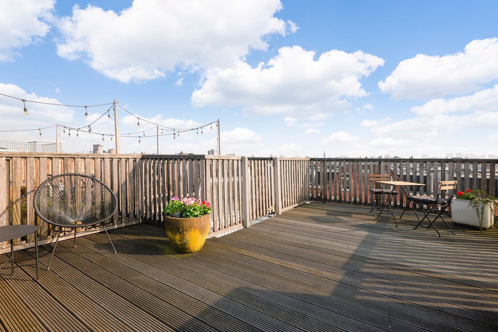 Via de vaste houten trap geeft de lichtkoepel toegang tot het aangename dakterras van 32m². Met de geboden oppervlakte is er voldoende ruimte voor zowel een loungegedeelte als een eethoek. Vanuit hier is er weids zicht over de stad.