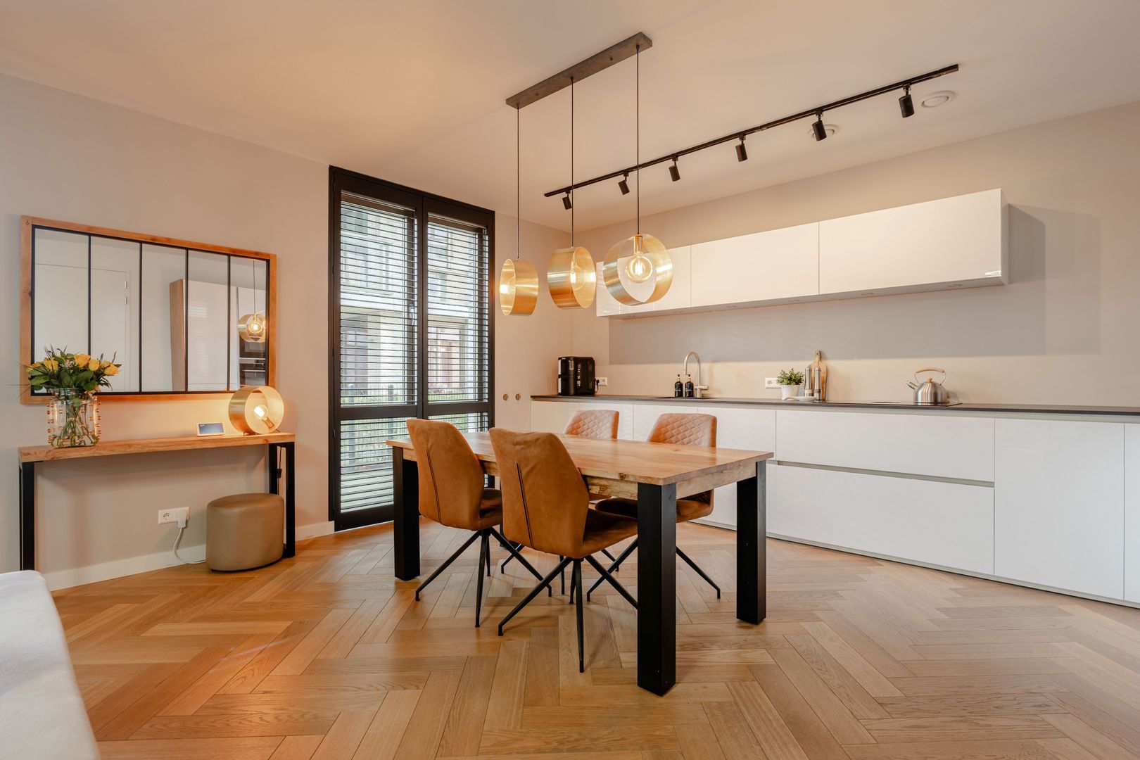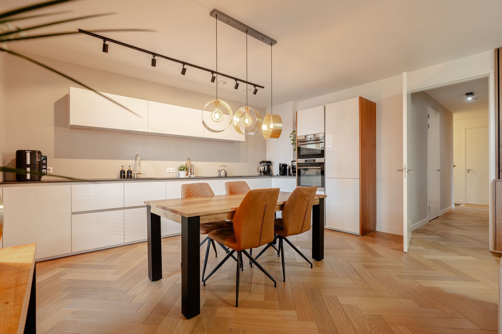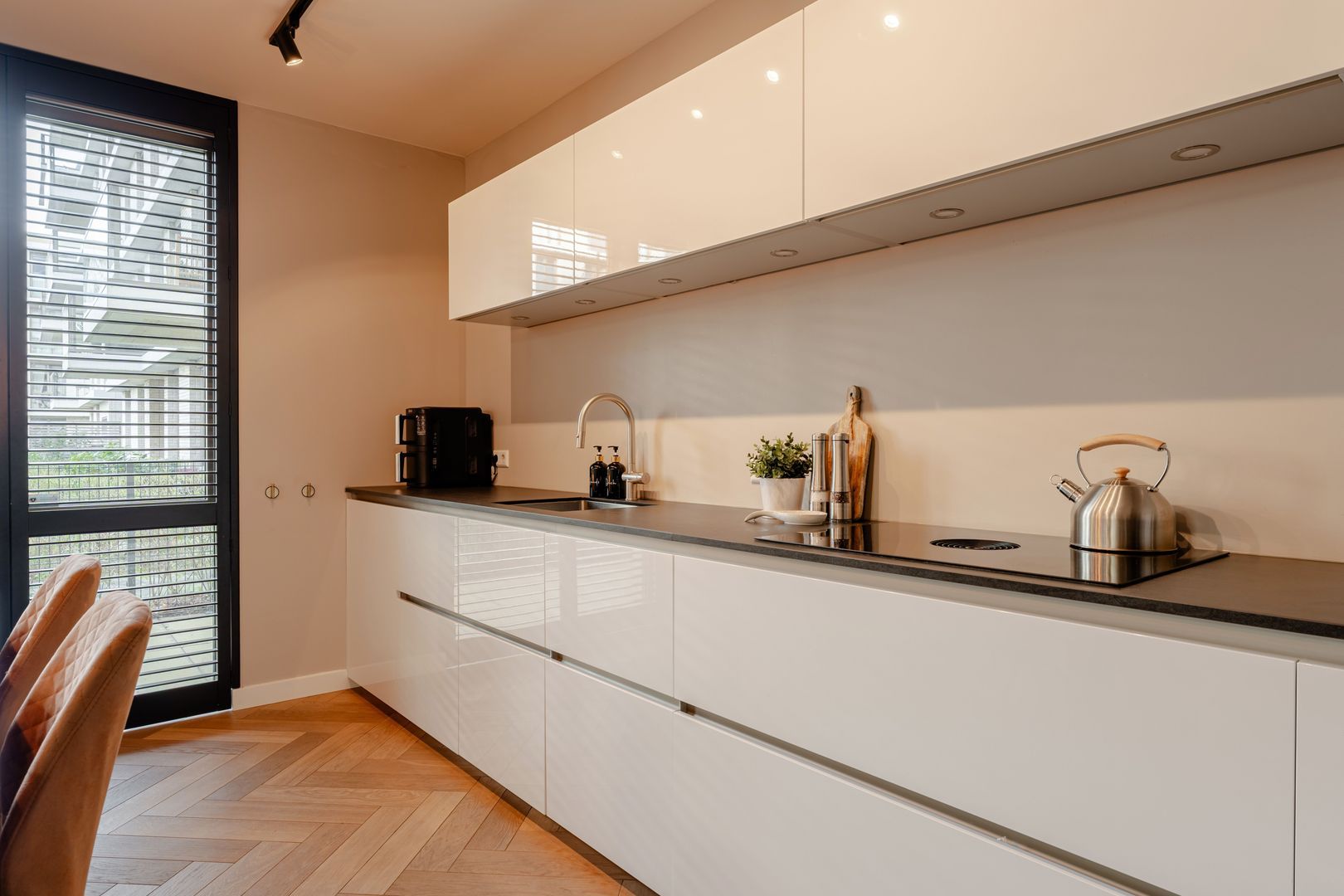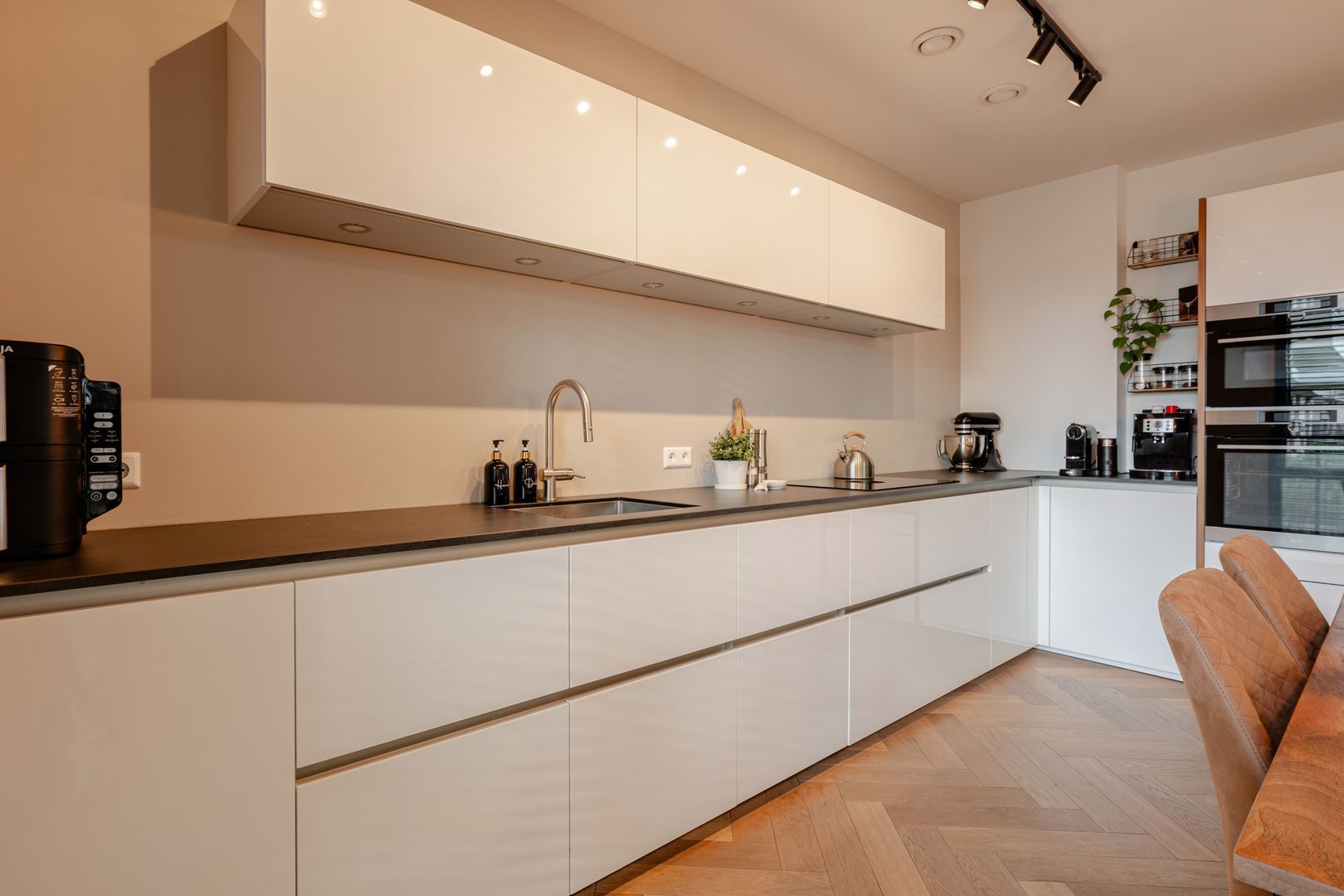 De open keuken is uitgevoerd in een witte kleurstelling en is van alle gemakken voorzien. De keuken beschikt over diverse inbouwapparatuur, waaronder een 4-pits inductiekookplaat met geïntegreerd afzuigsysteem, een koel-/vriescombinatie, oven en magnetron. Daarnaast is er volop werkblad en kastruimte aanwezig.