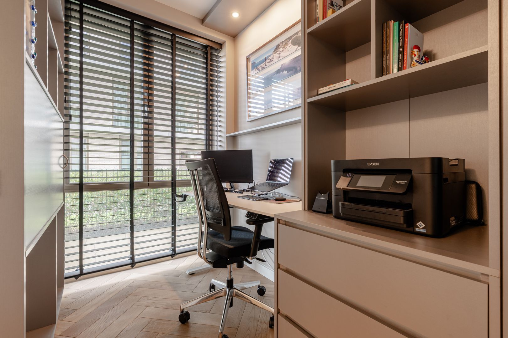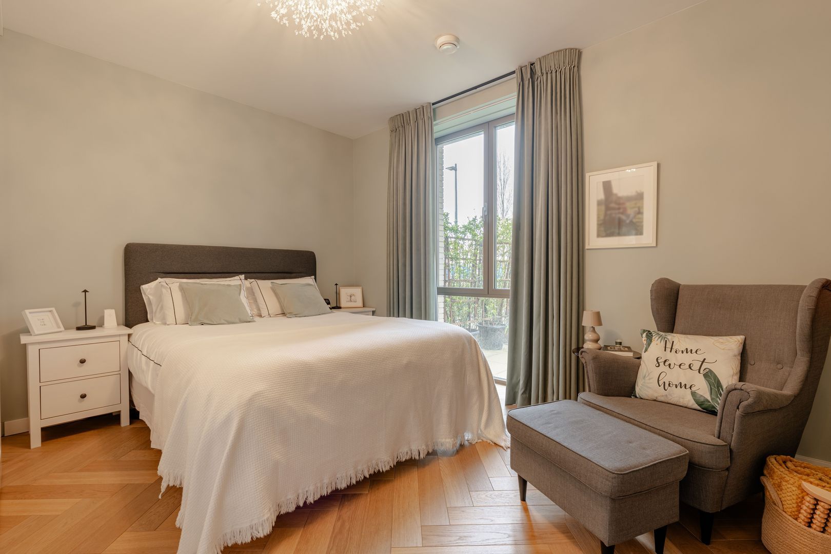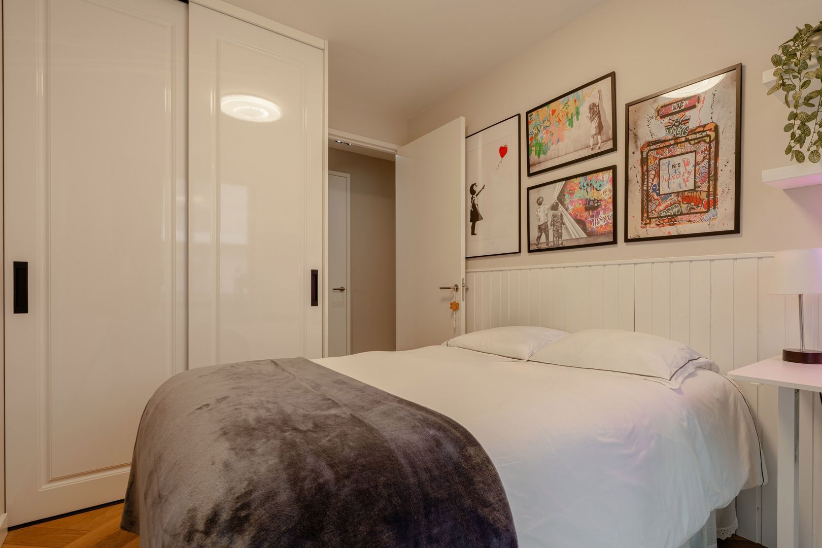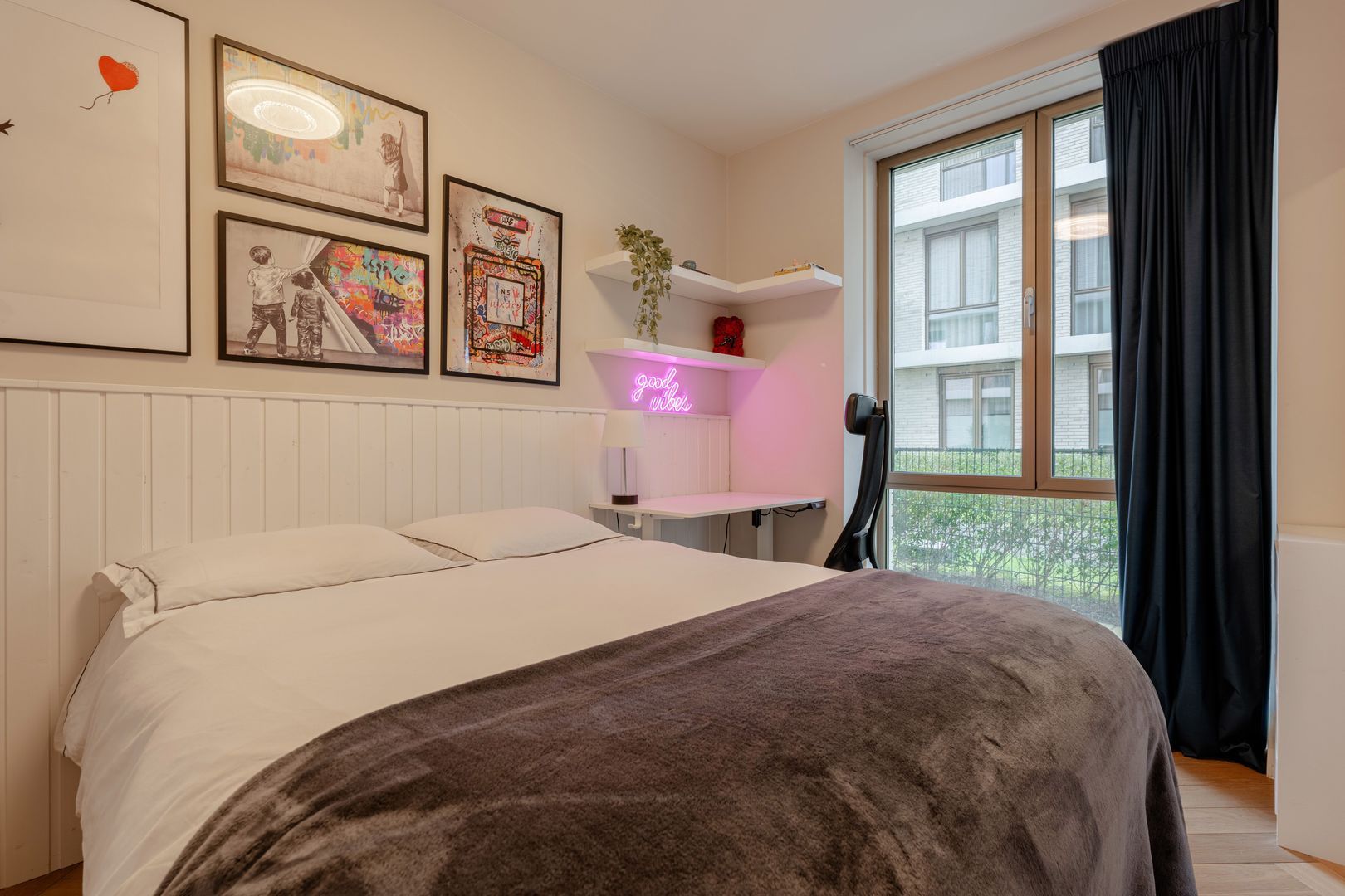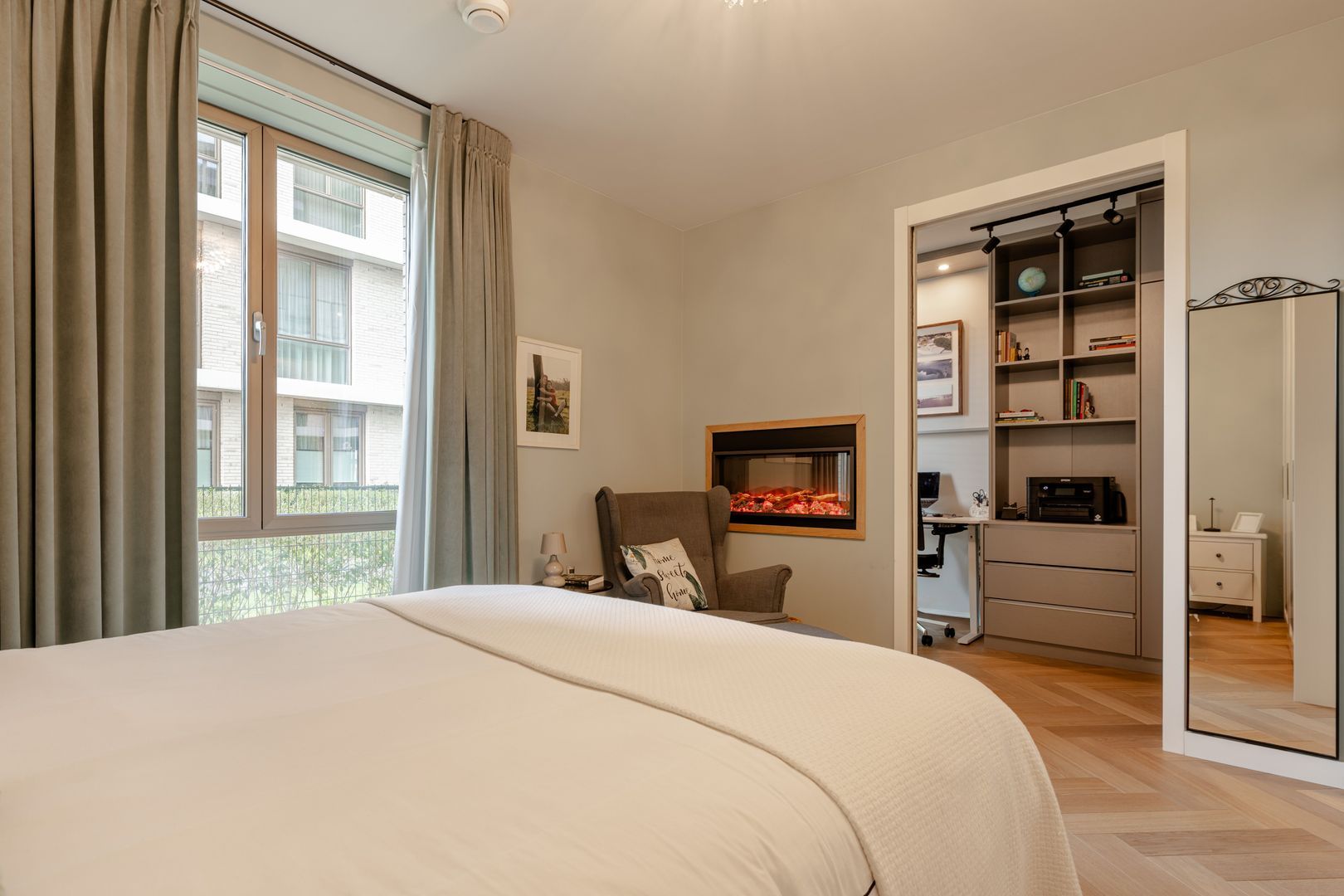 Het appartement beschikt over twee ruime slaapkamers. De hoofdslaapkamer is voorzien van inbouwkasten en een sfeervolle elektrische haard. De naastgelegen zijkamer leent zich met de ingebouwde werkplek en kastruimte uitstekend als werkruimte en/of inloopkast en is efficiënt en praktisch ingedeeld. Ook de tweede slaapkamer is voorzien van een inbouwkast en biedt zicht op het terras.