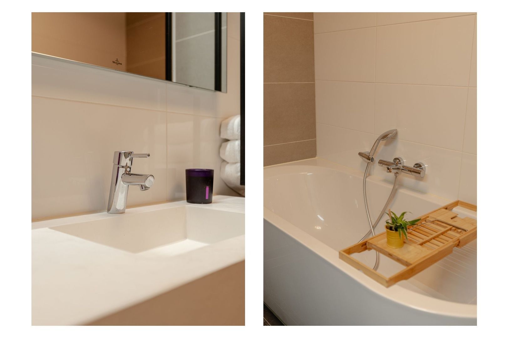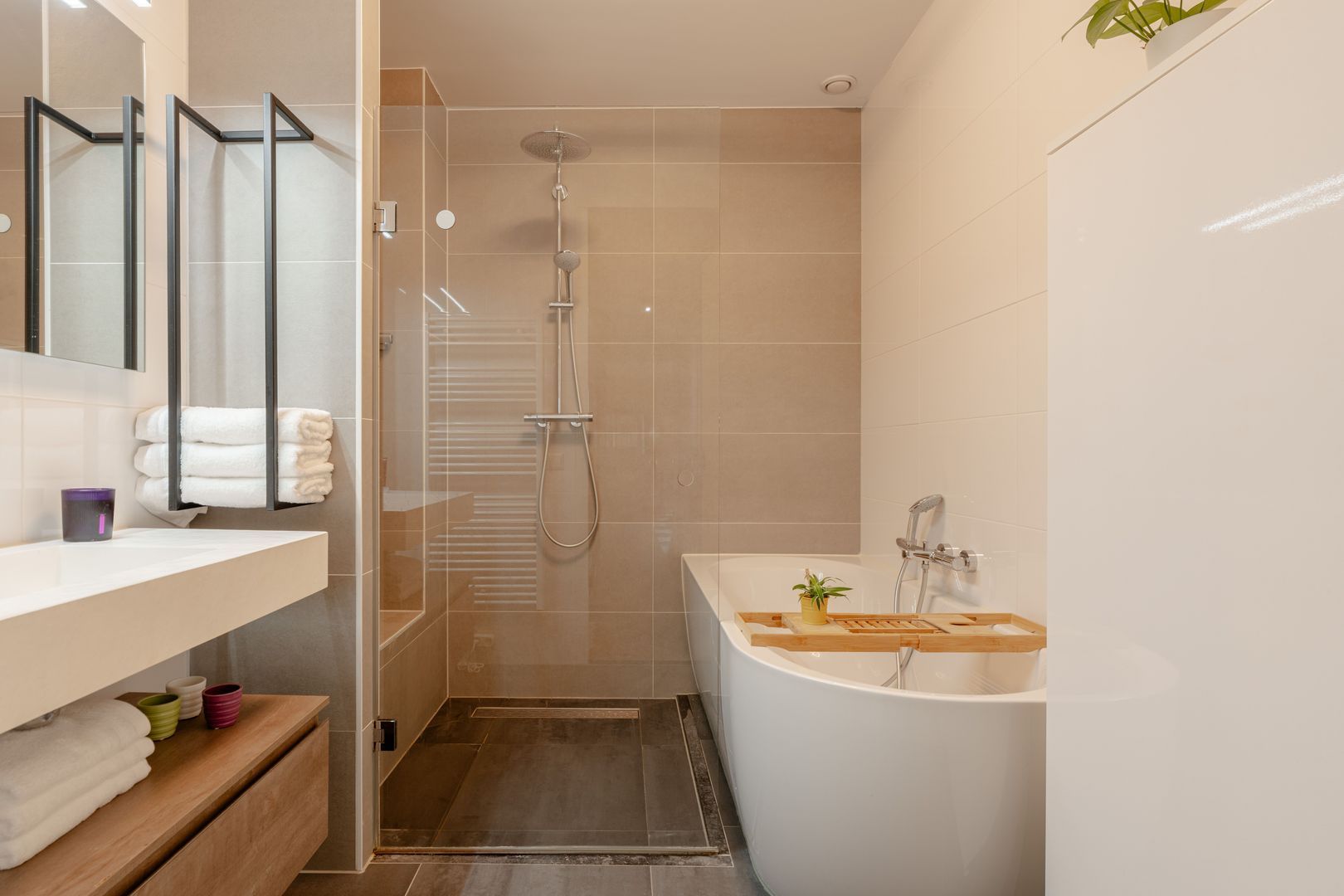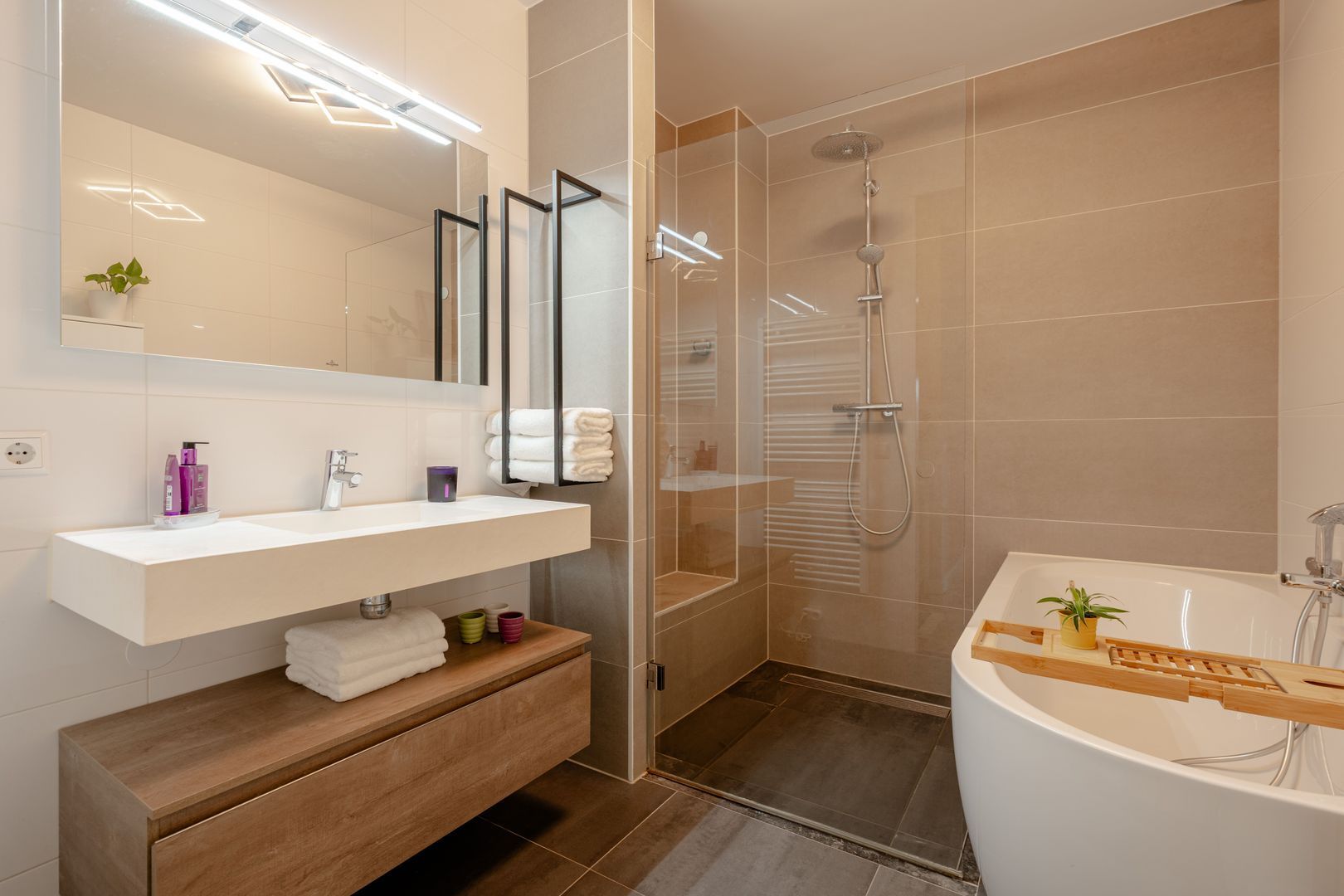 De royale badkamer is luxe uitgevoerd en beschikt over een brede wastafel met verlichte spiegel, een ruime inloopdouche met zitbankje en een comfortabel ligbad. De afwerking bestaat uit een stijlvolle combinatie van beige en witte wandtegels i.c.m. een antracietkleurige vloertegel.