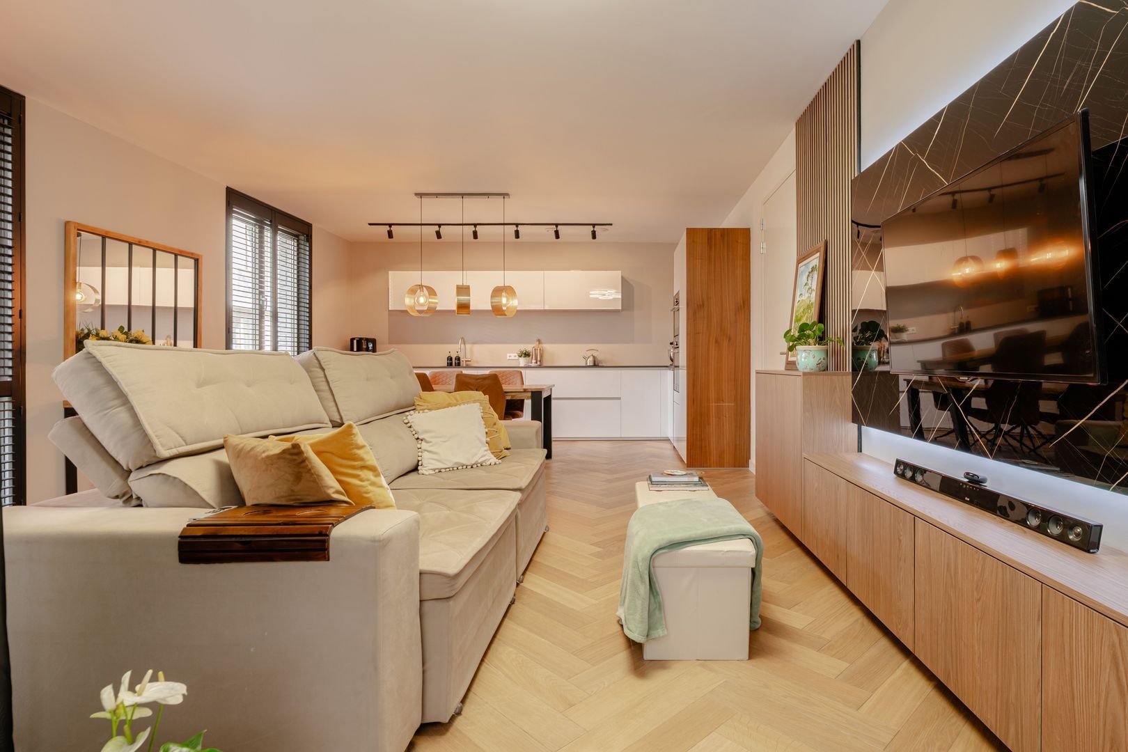 De woonkamer met open keuken beschikt over vloer-tot-plafond puien die zorgen mooi een ruimtelijk effect. De luxe zwarte lamellen geven deze ruimte een stijlvolle uitstraling. De schuifpui biedt toegang tot het royale terras. Een echte eyecatcher in de woonkamer is het op maat gemaakte houten televisiewandmeubel.