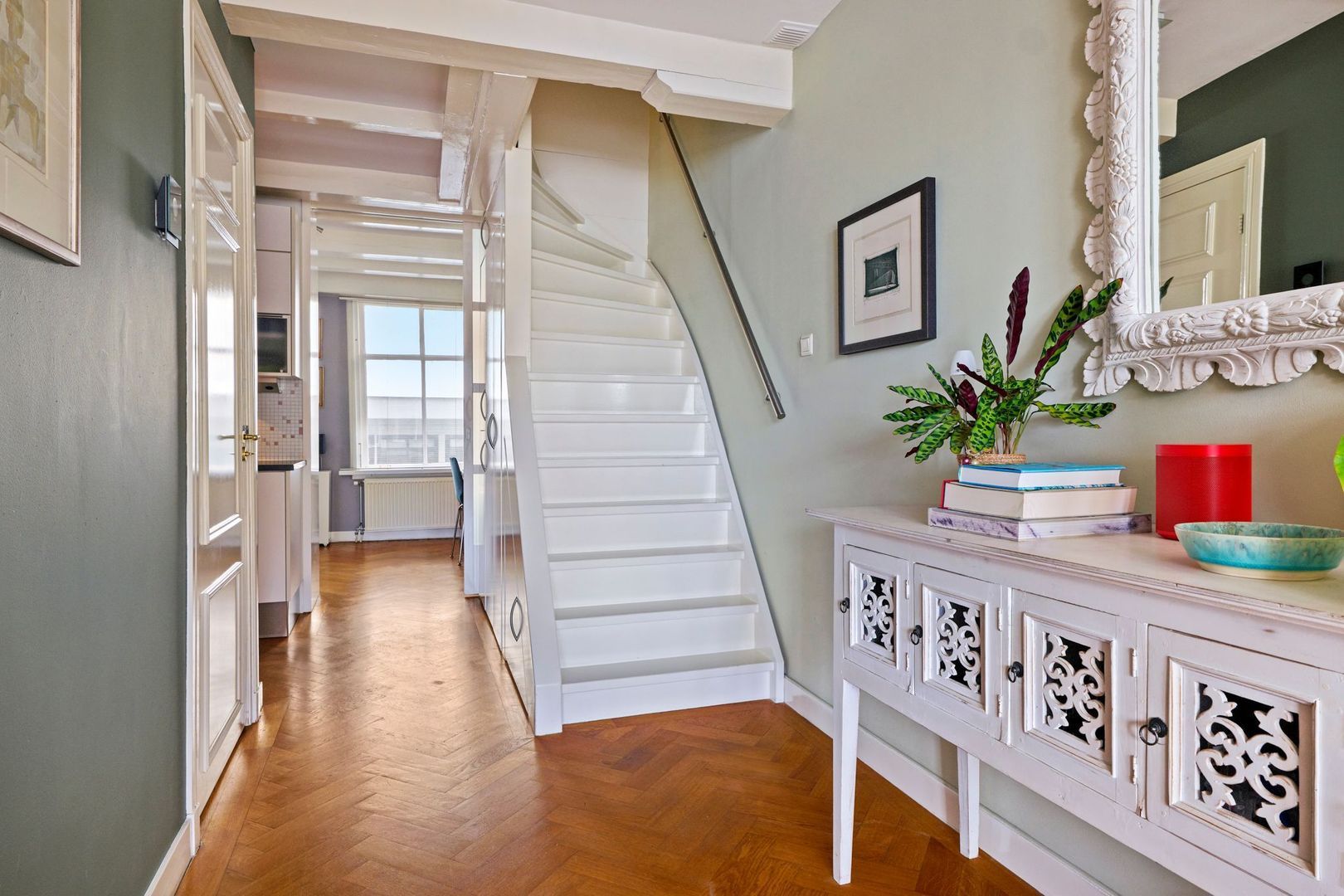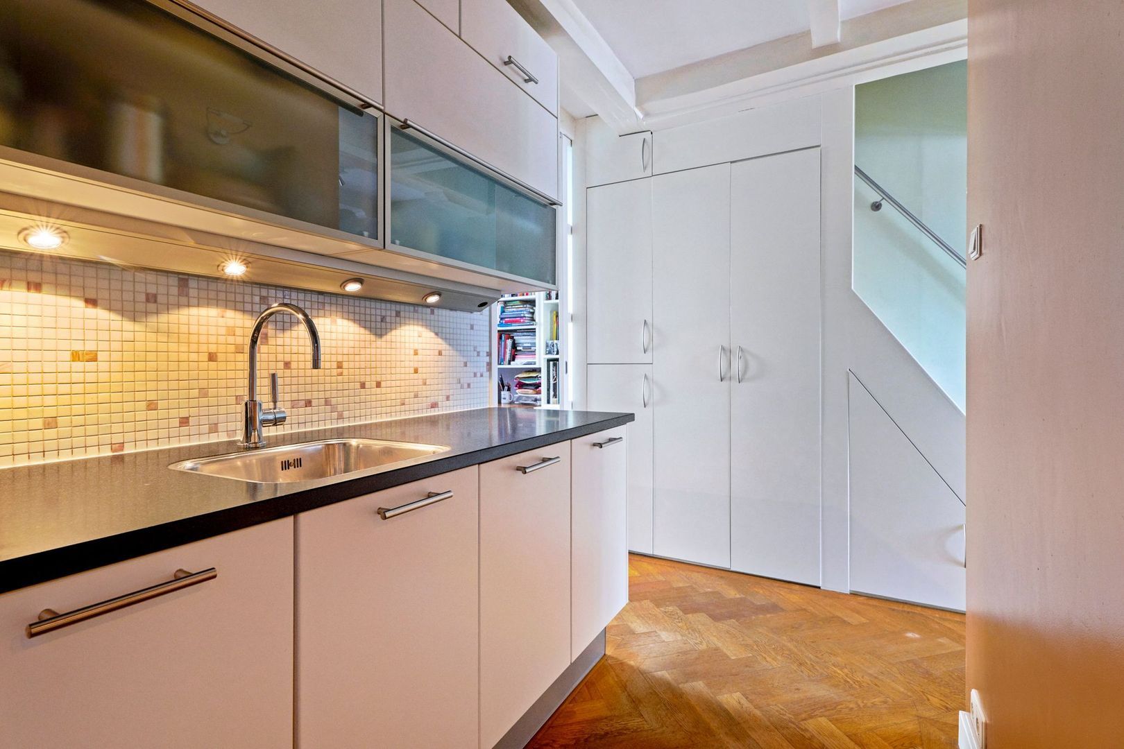 De hal is voorzien van een wasmachine/drogerkast waar tegenover meerdere praktische inbouwkasten zijn gerealiseerd onder de trap.