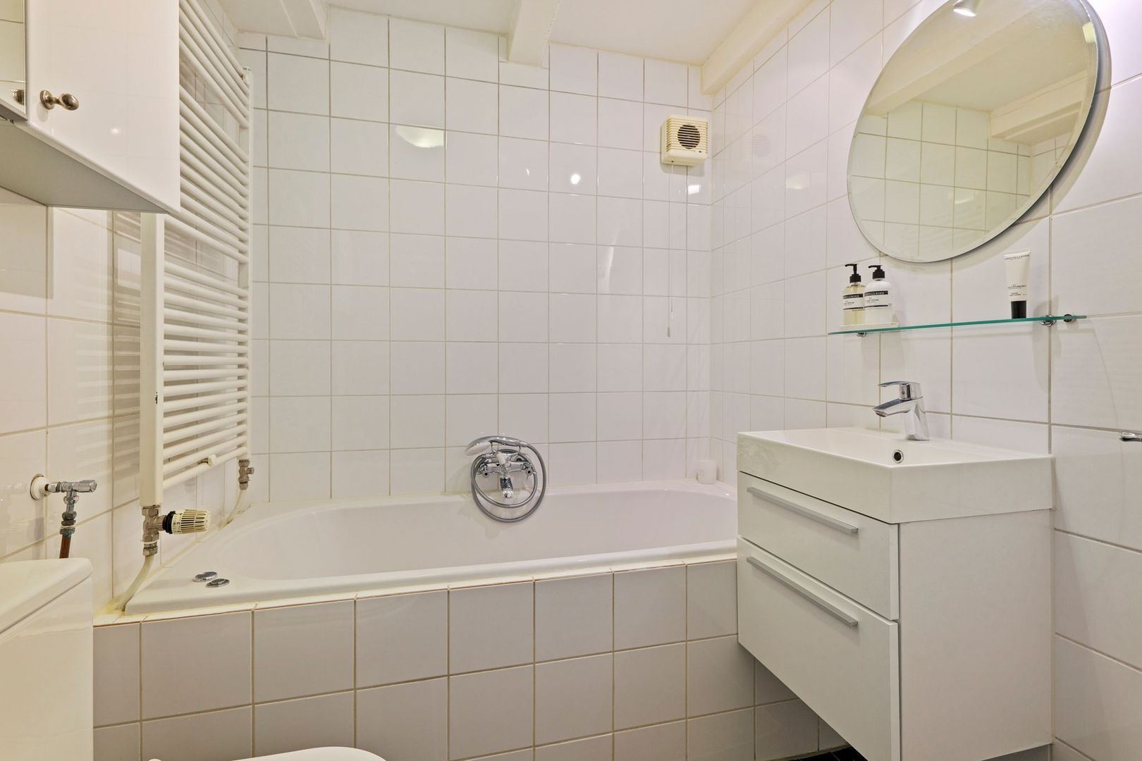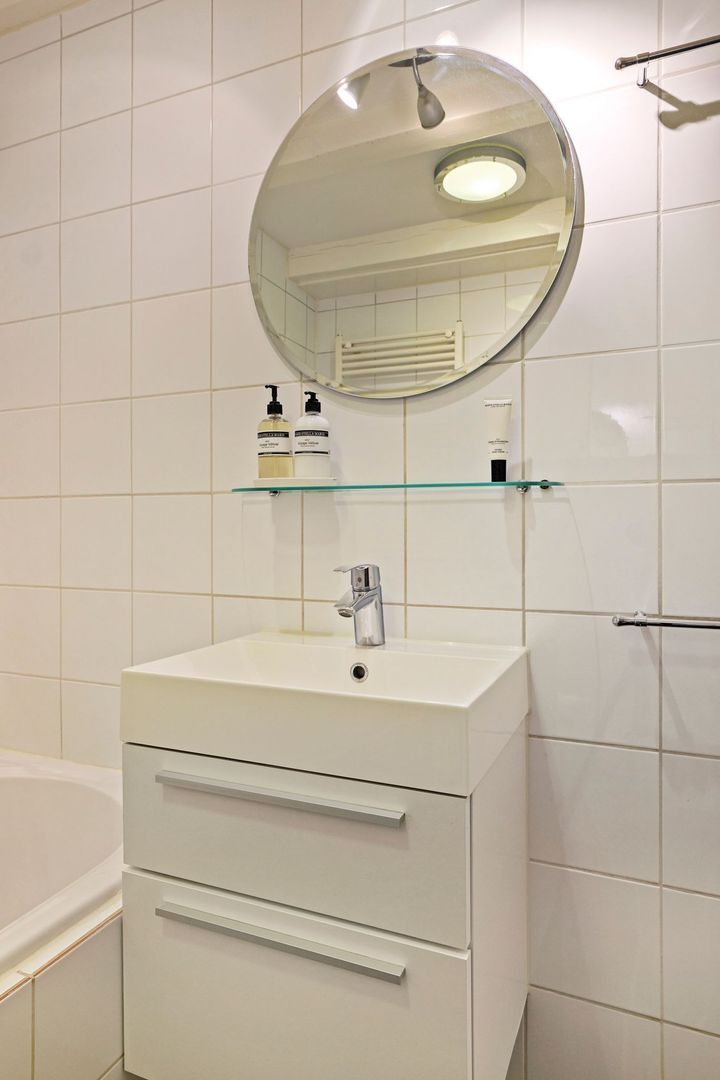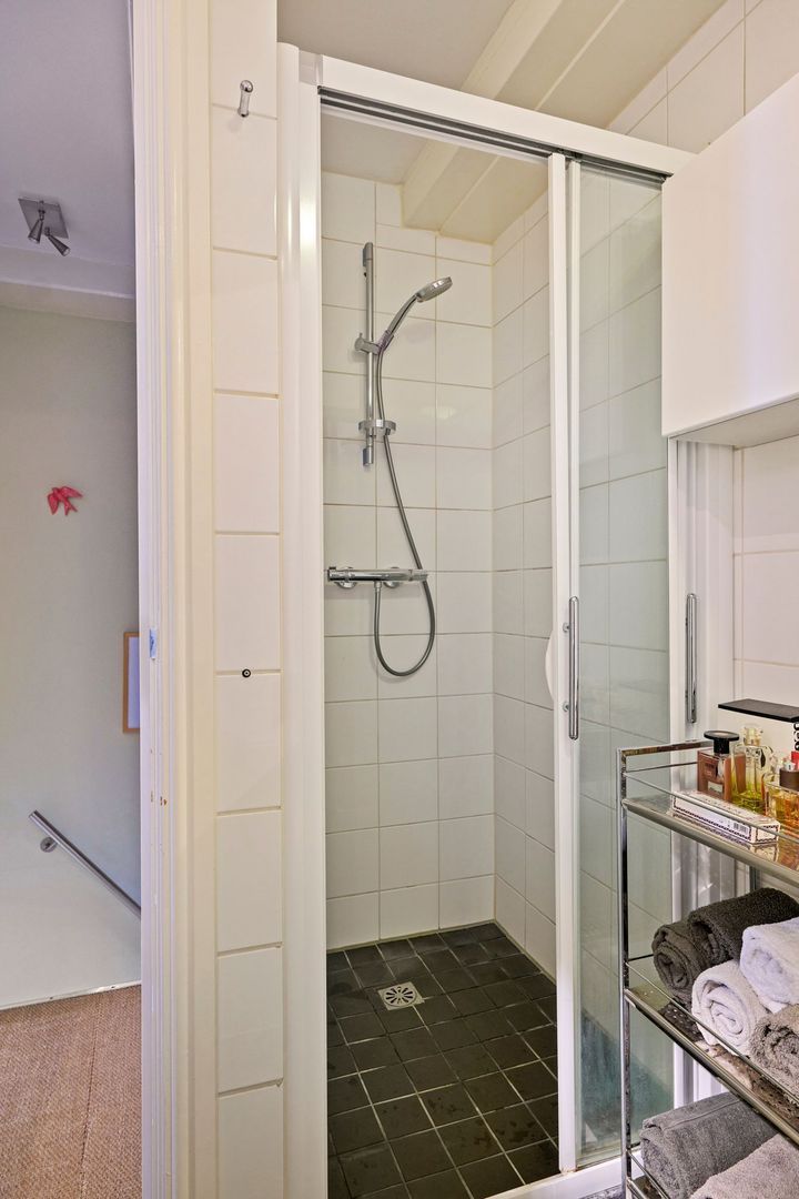 De badkamer is uitgevoerd met een zwarte vloertegel en een geheel wit betegelde witte wand. Voorts is de badkamer voorzien van een jacuzzi, toilet, separate douche, wastafelmeubel en een handdoekradiator.