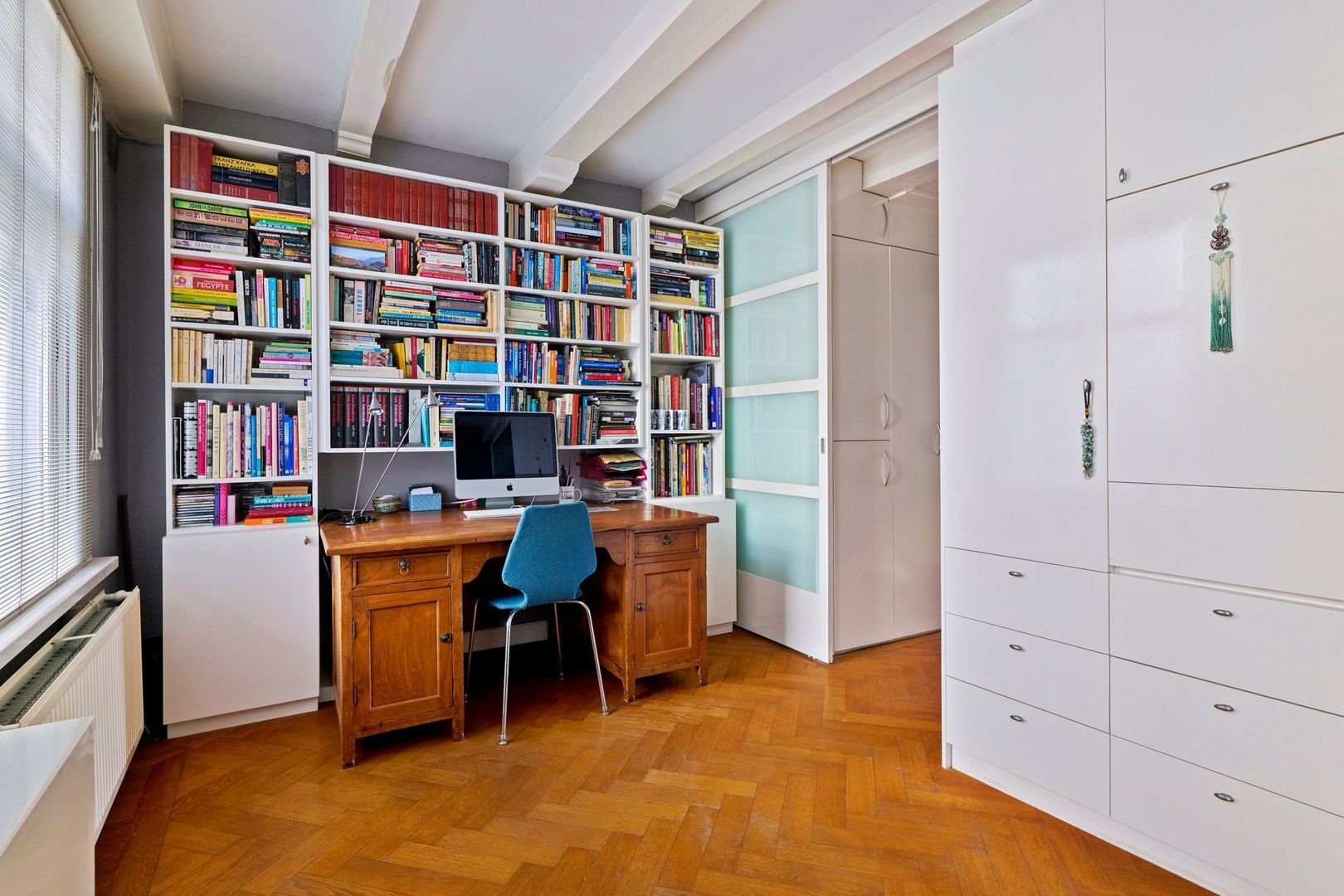 Geheel aan de achterzijde ligt de eerste, ruime slaapkamer. Deze kamer is uitgevoerd met een op maat gemaakte plafondhoge inbouwkast en is momenteel in gebruik als kantoorruimte danwel logeerkamer.