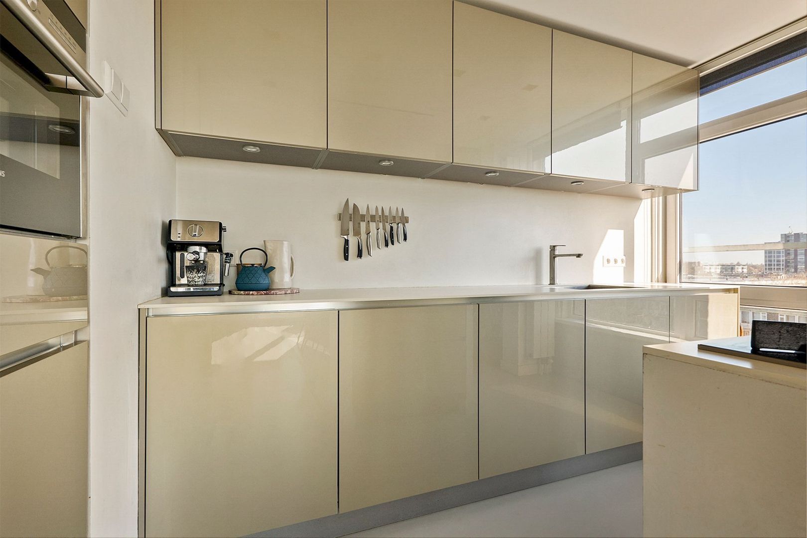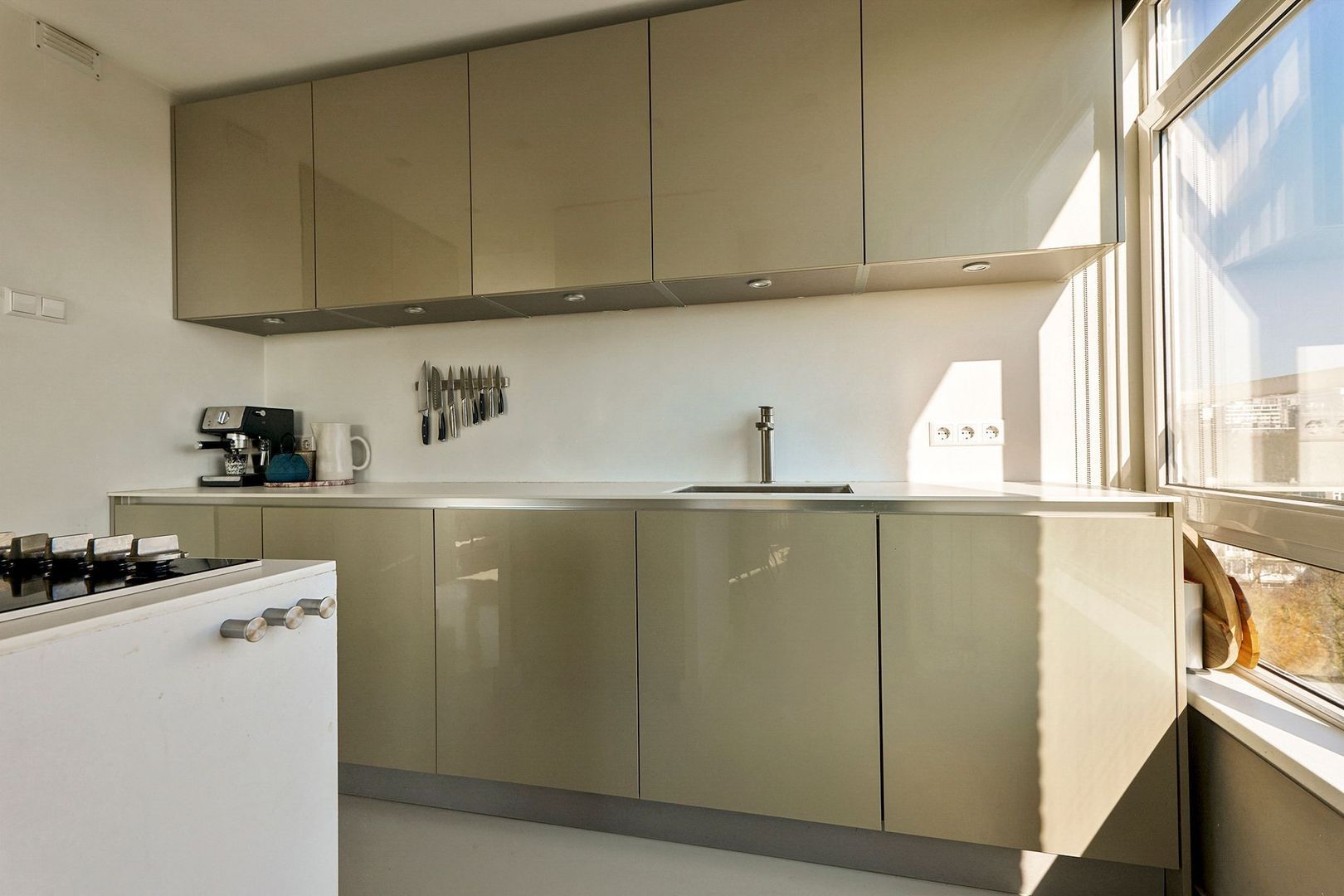 De open keuken is via twee zijdes toegankelijk en is modern uitgevoerd met hoogglans champagne kleur kasten en lades (greep loos) en een wit aanrechtblad. De keuken is voorzien van diverse inbouwapparatuur van A-merken.
