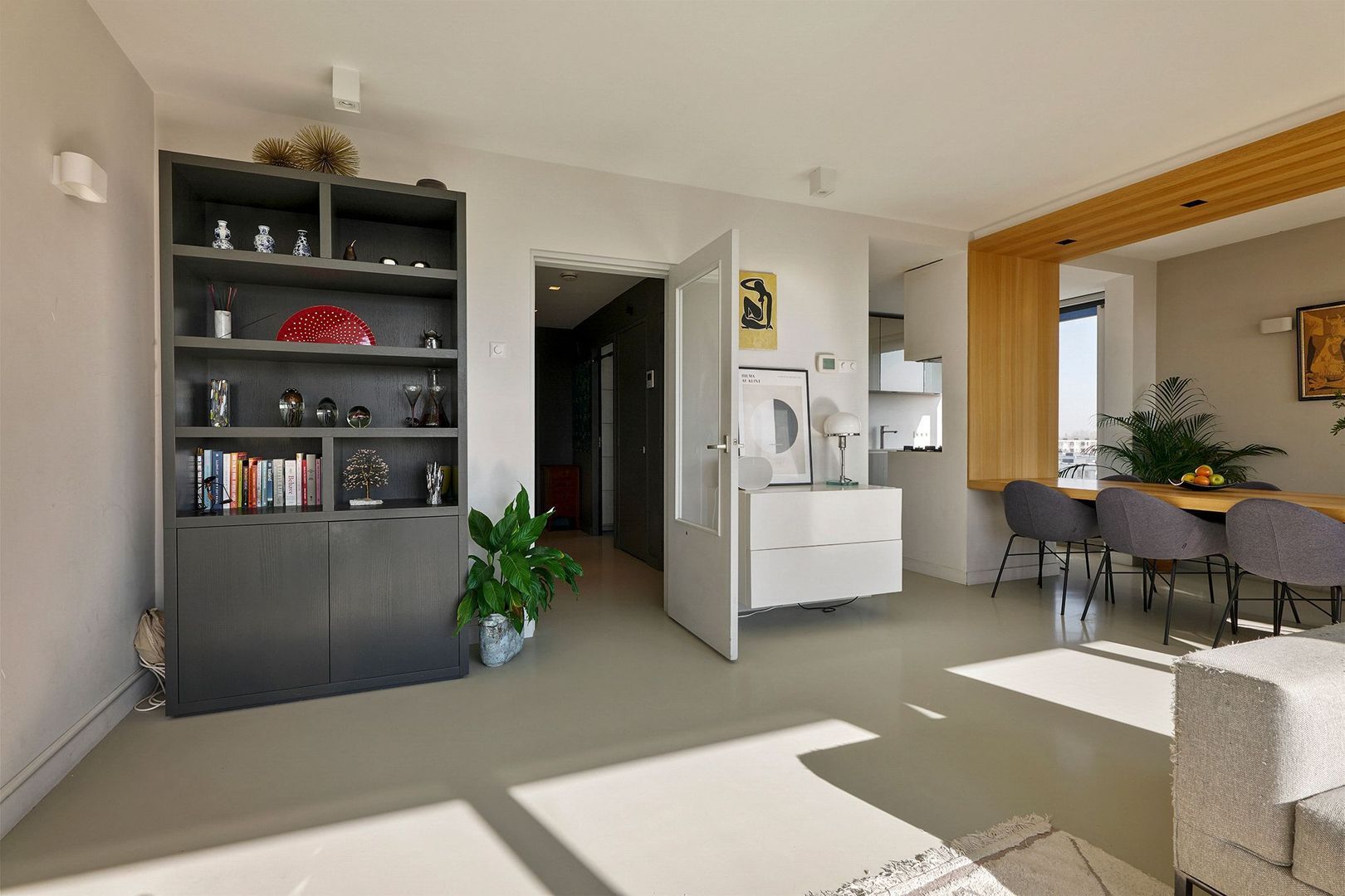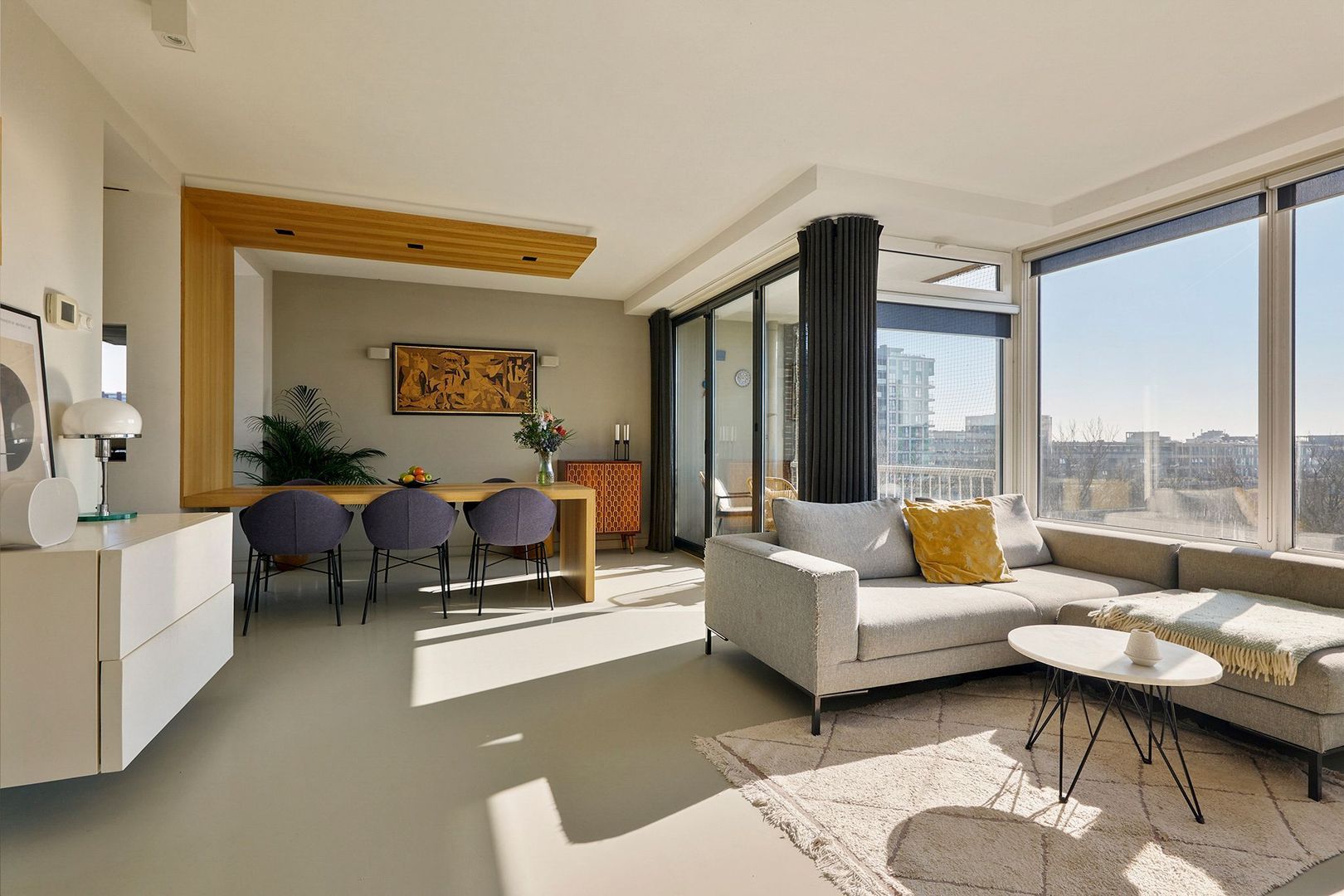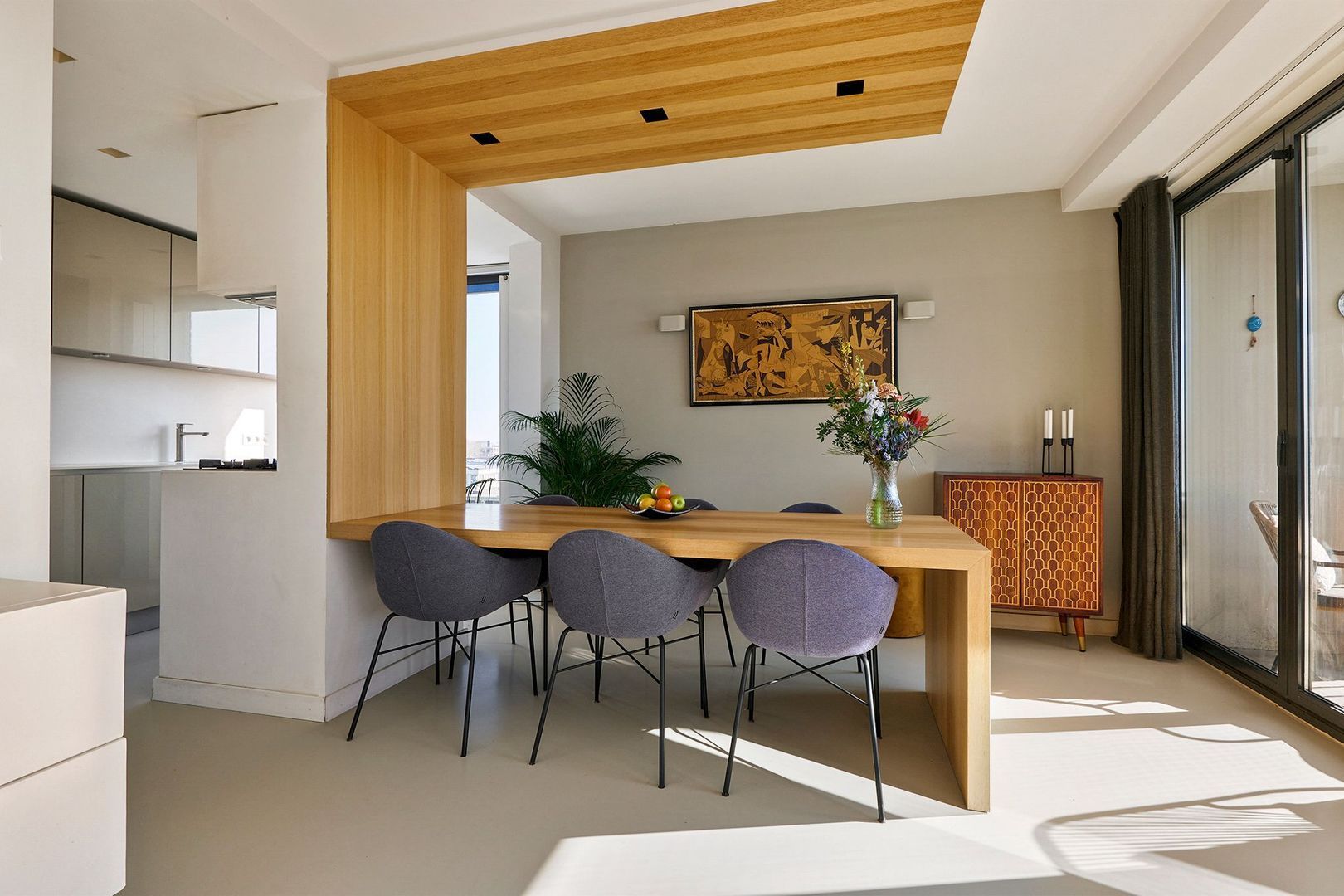 De royale living met open keuken beschikt over grote raampartijen wat uiteraard goede lichtinval geeft. Tevens geniet men hier van vrij uitzicht over groen en een deel van de stad. De living biedt met de harmonica pui toegang tot het balkon gelegen op het zuiden. Grenzend aan de keuken is aan een kleine muur op een speelse wijze een eettafel gerealiseerd. Aan de andere zijde van deze muur is het brede fornuis geplaatst.