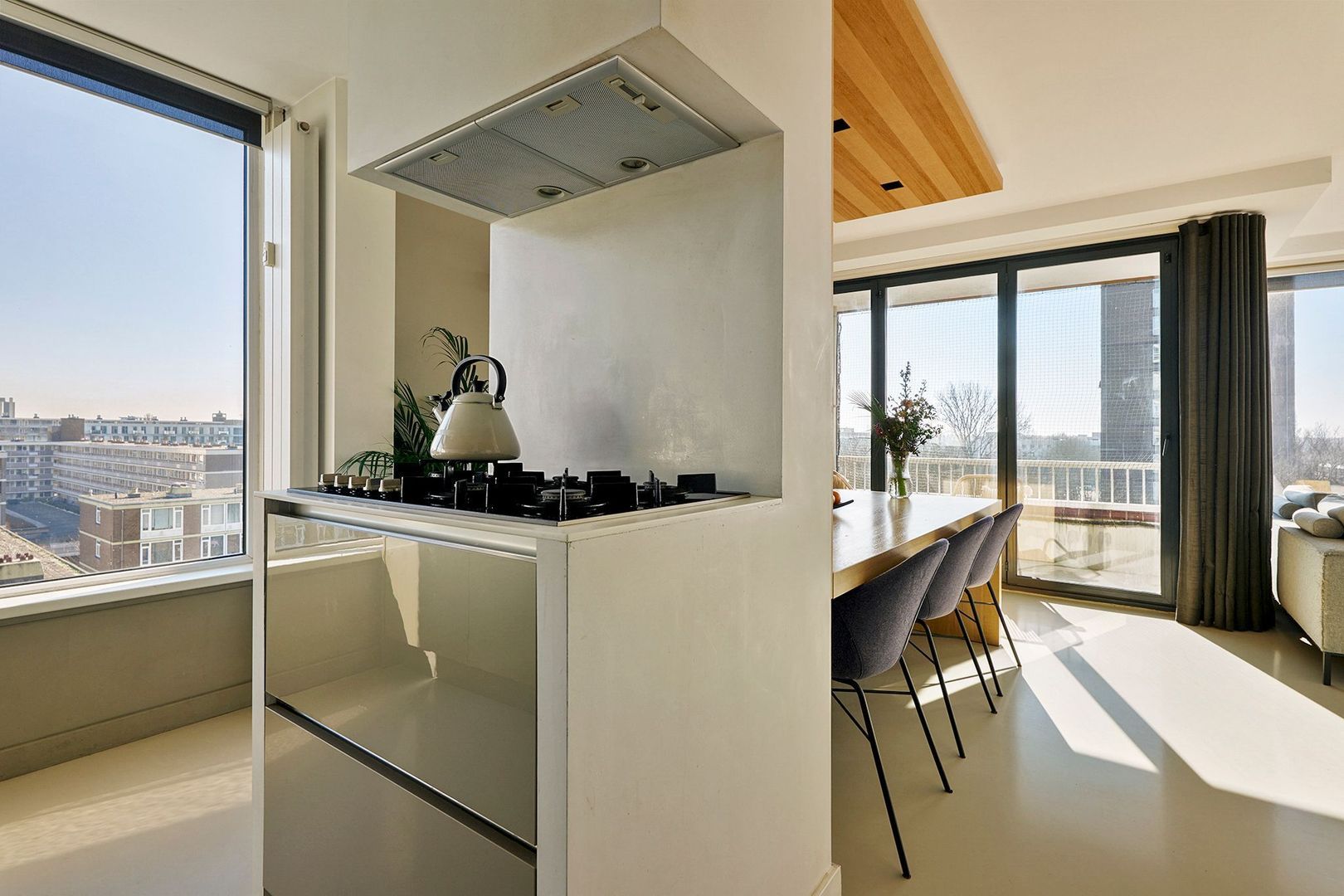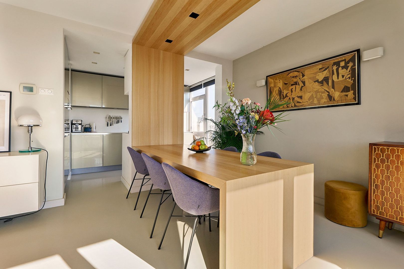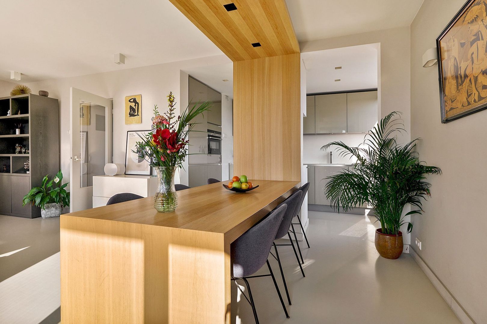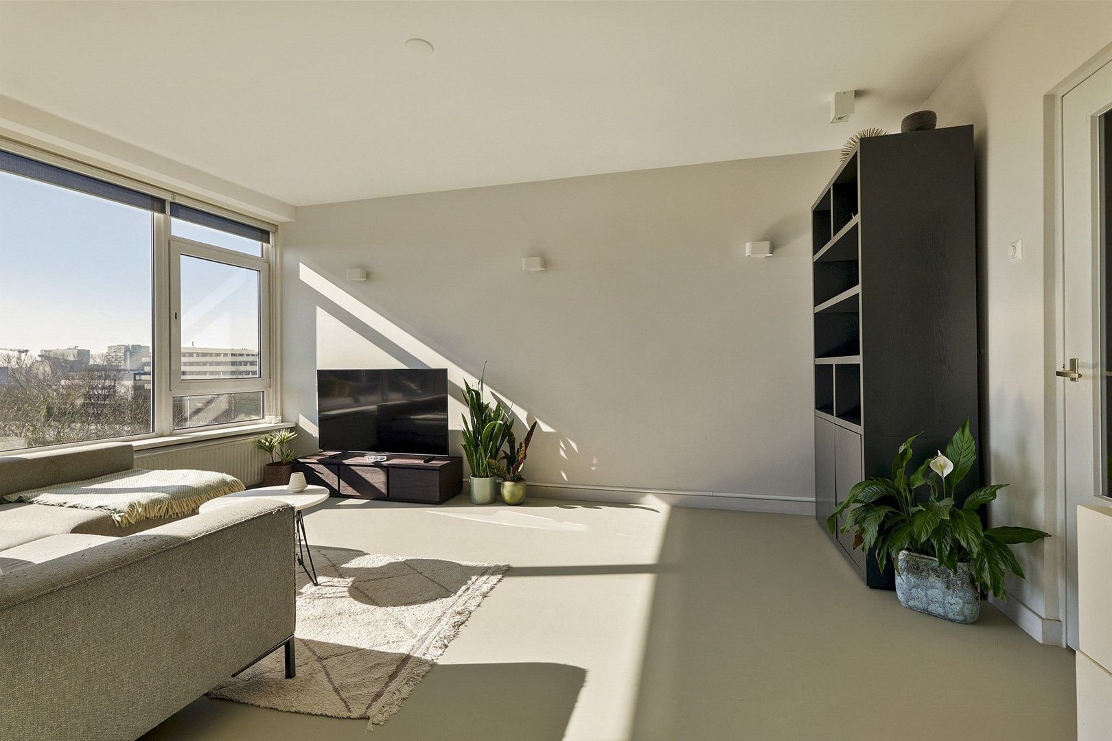 De royale living met open keuken beschikt over grote raampartijen wat uiteraard goede lichtinval geeft. Tevens geniet men hier van vrij uitzicht over groen en een deel van de stad. De living biedt met de harmonica pui toegang tot het balkon gelegen op het zuiden. Grenzend aan de keuken is aan een kleine muur op een speelse wijze een eettafel gerealiseerd. Aan de andere zijde van deze muur is het brede fornuis geplaatst.