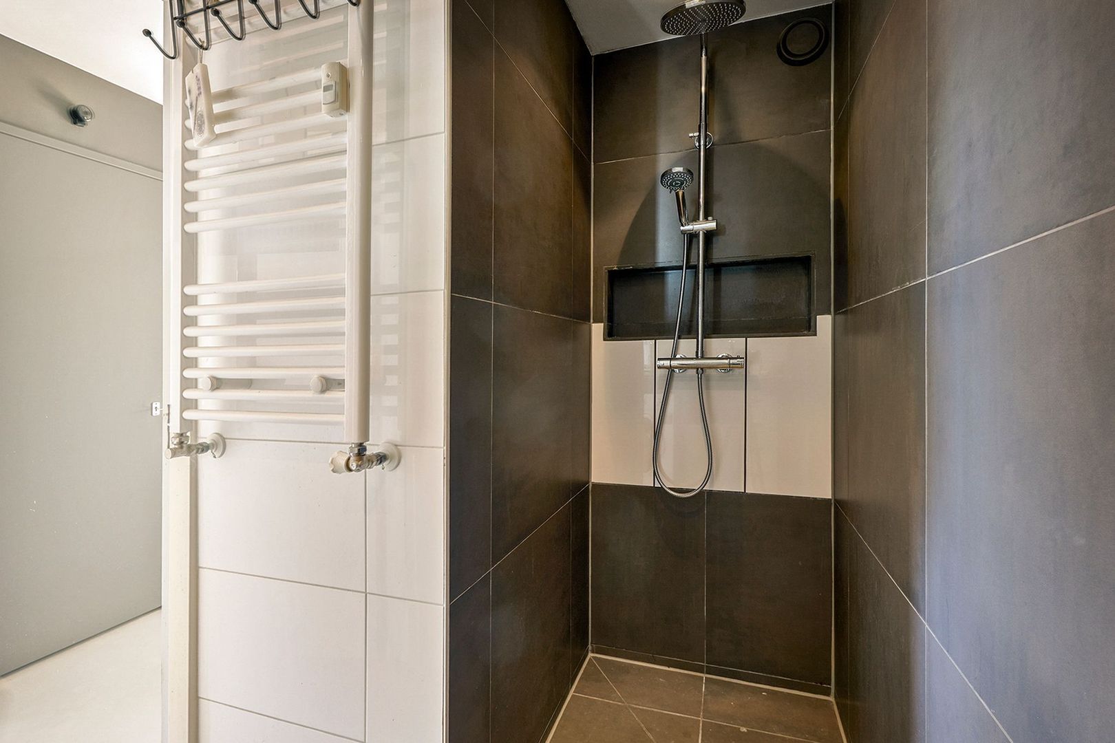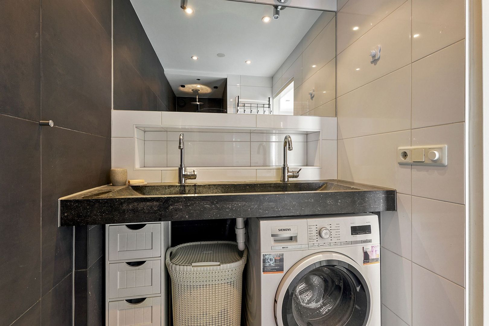 De badkamer is strak uitgevoerd met een antraciet vloer en wandtegel. De badkamer is voorzien van een ruime inloopdouche met zowel een regen als handdouche, een brede natuurstenen wastafel met twee kranen en een grote verwarmde spiegel met verlichting, een handdoekradiator en de wasmachine en drogeraansluiting. Het toilet is in een gelijke uitvoering.