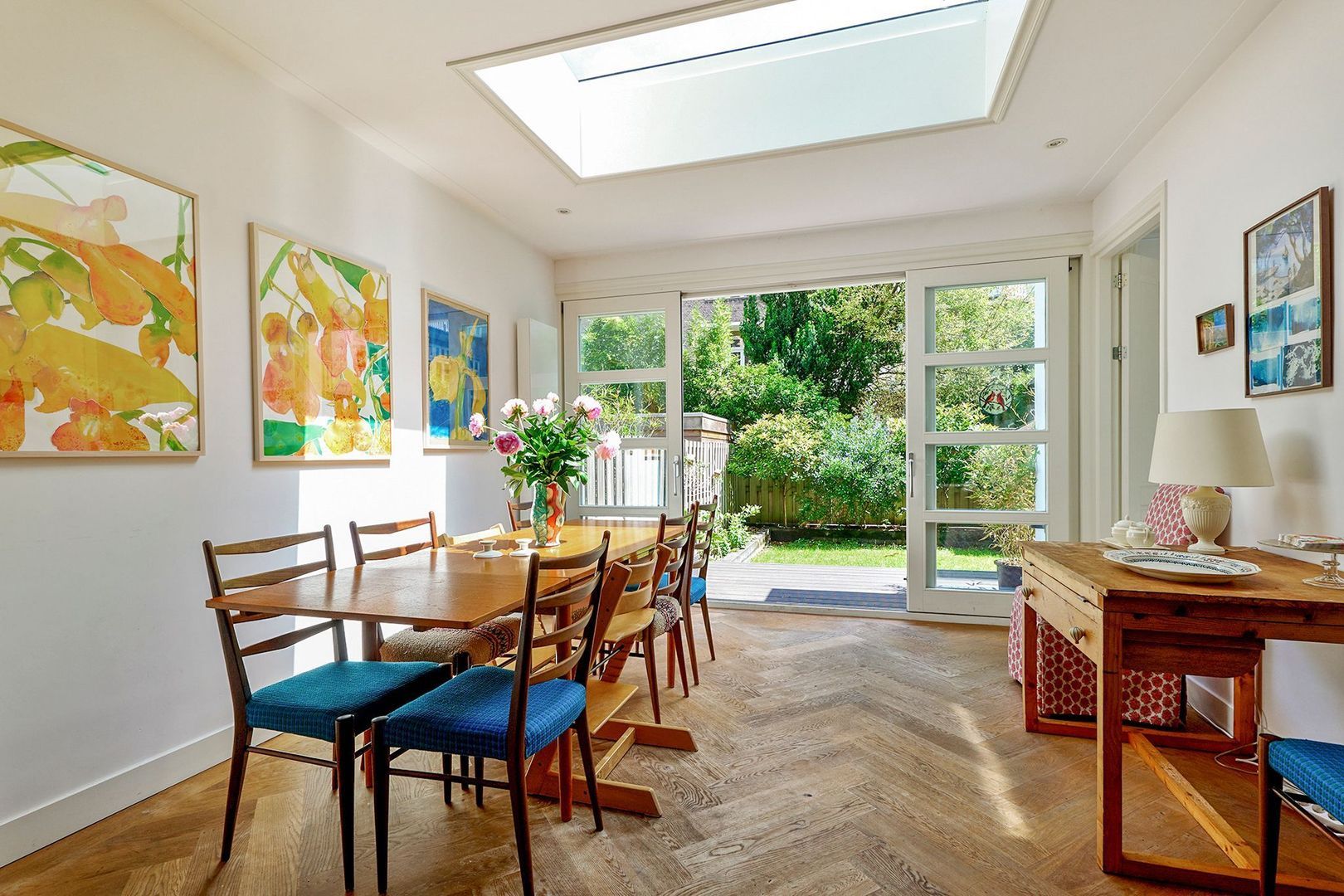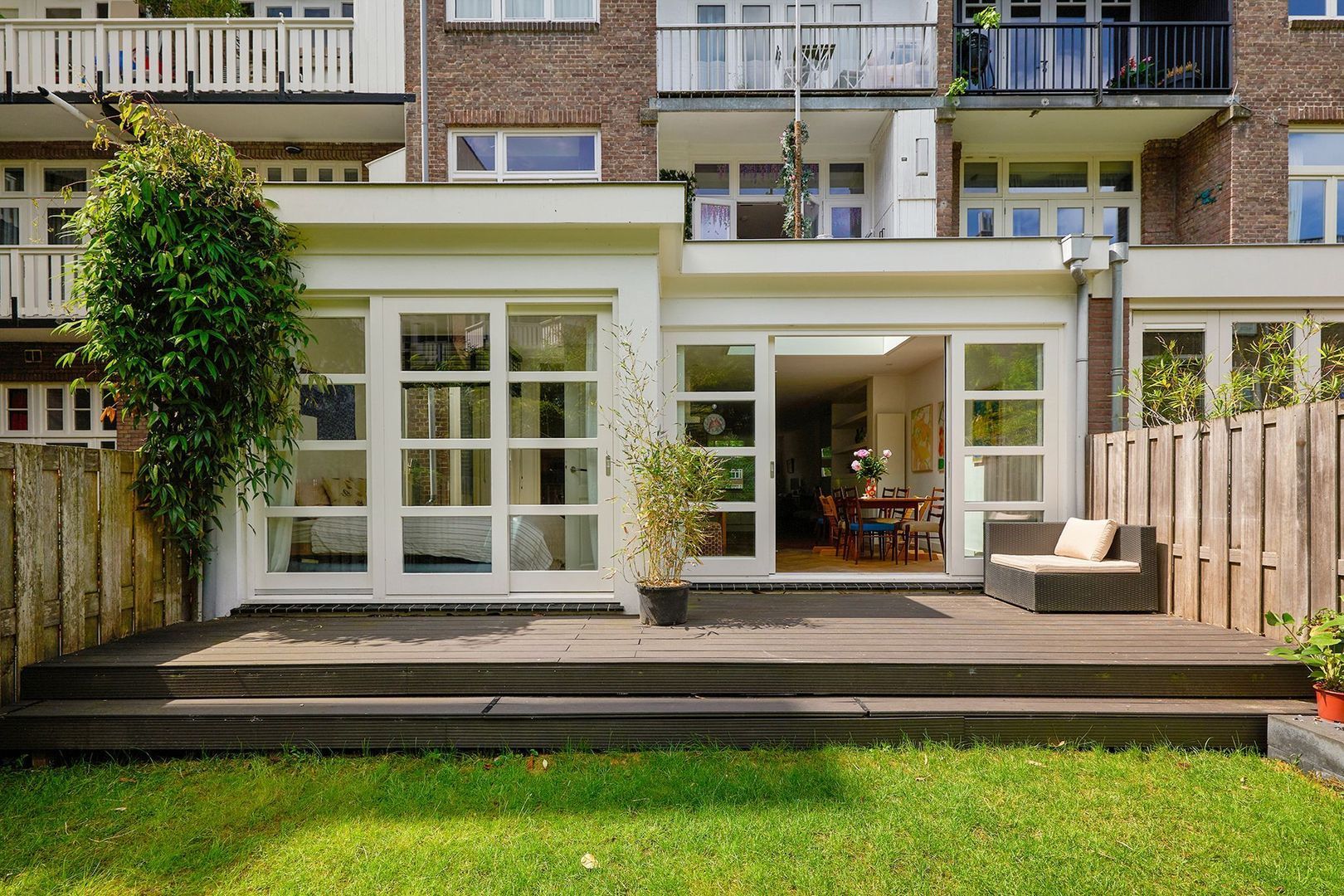 Aan de achterzijde van de woning is een fraaie uitbouw gerealiseerd met een royale lichtkoepel wat zorgt voor veel natuurlijk daglicht en een ruimte uitstraling in het eetgedeelte. Via de schuifpui aan de achterzijde is er toegang tot het woning brede terras, voorzien van houten vlonders welke aansluit op het lager gelegen gazon. De tuin van ca. 41m² op het oosten is goed onderhouden en biedt een heerlijke plek om te ontspannen.