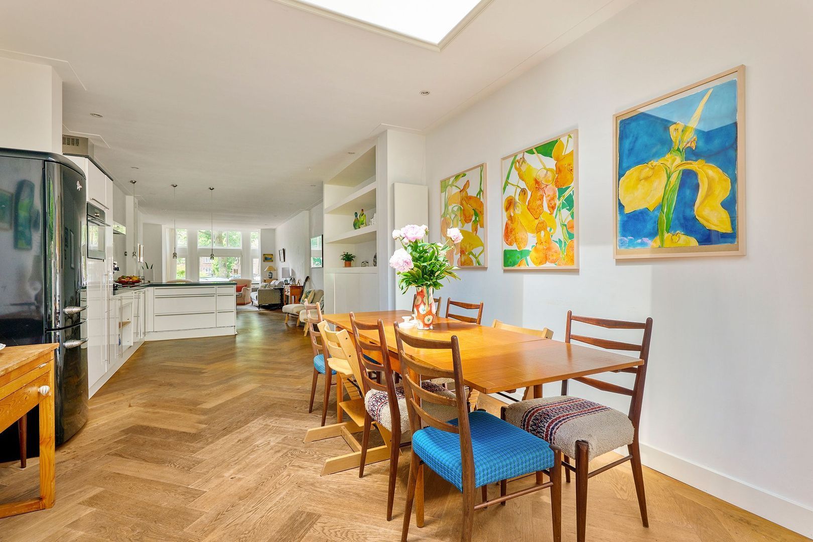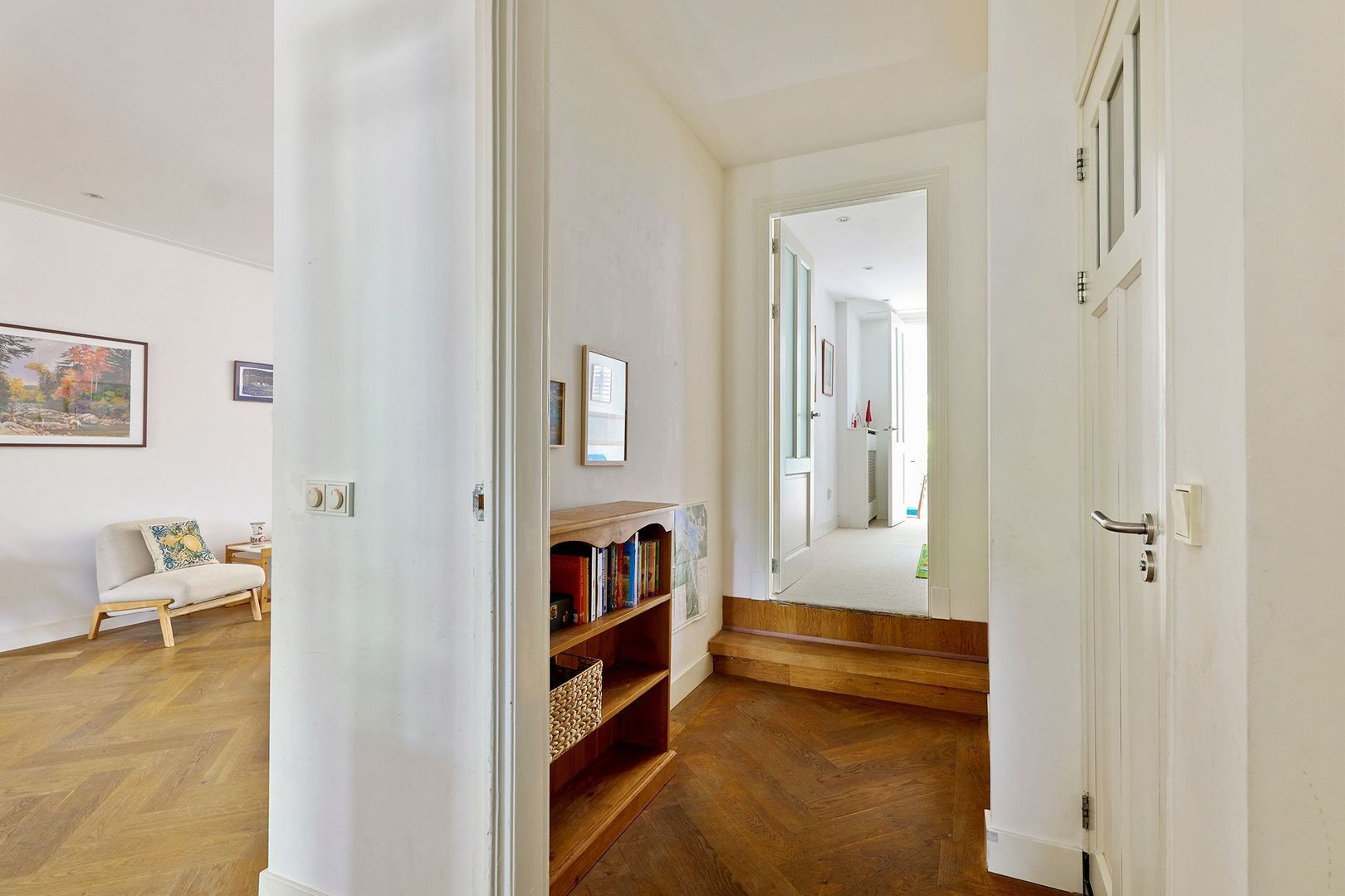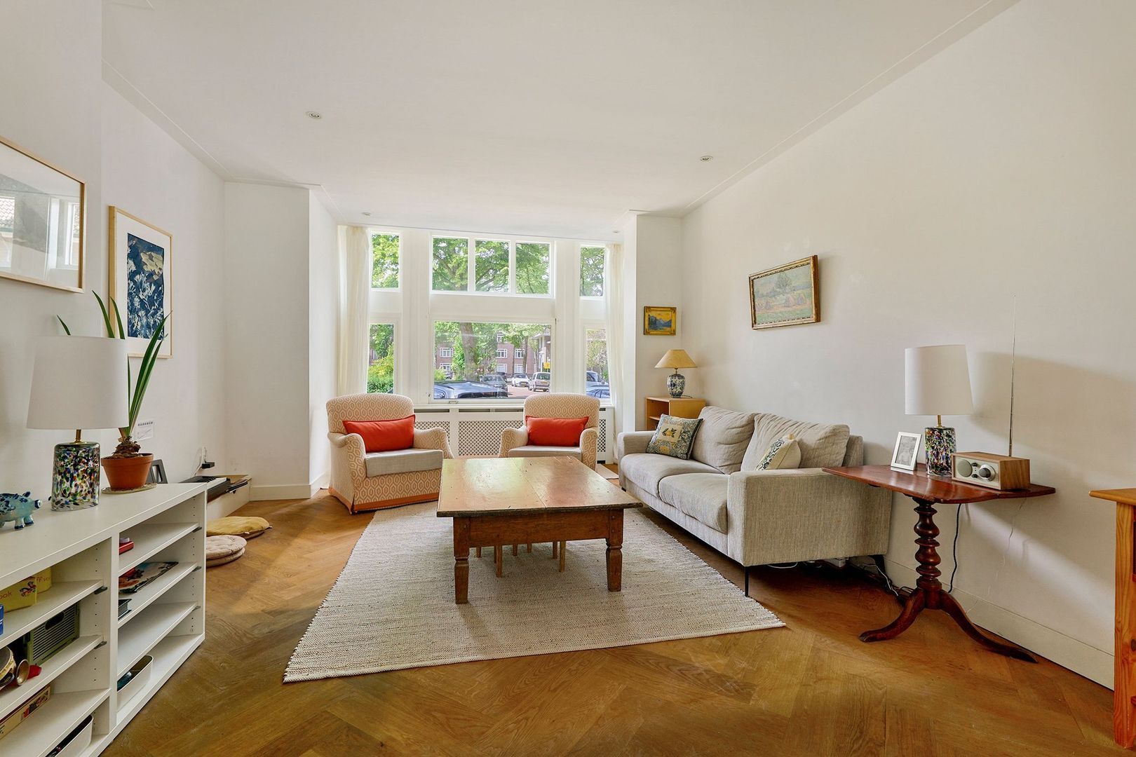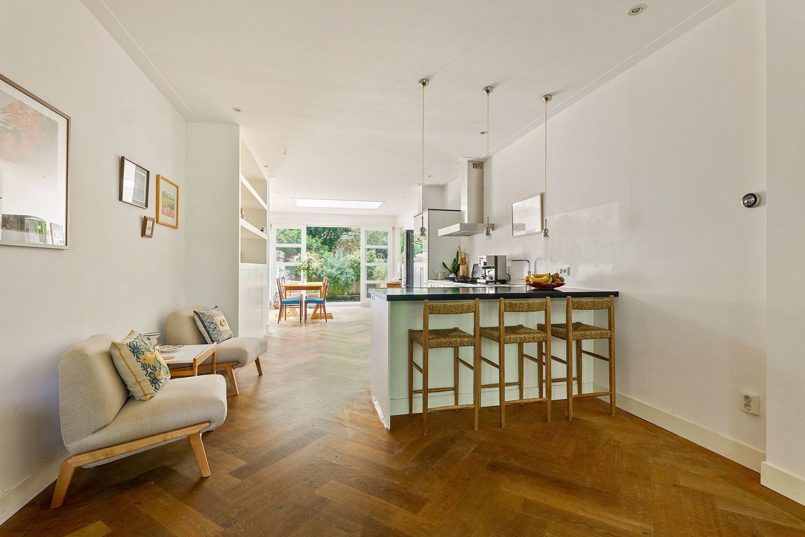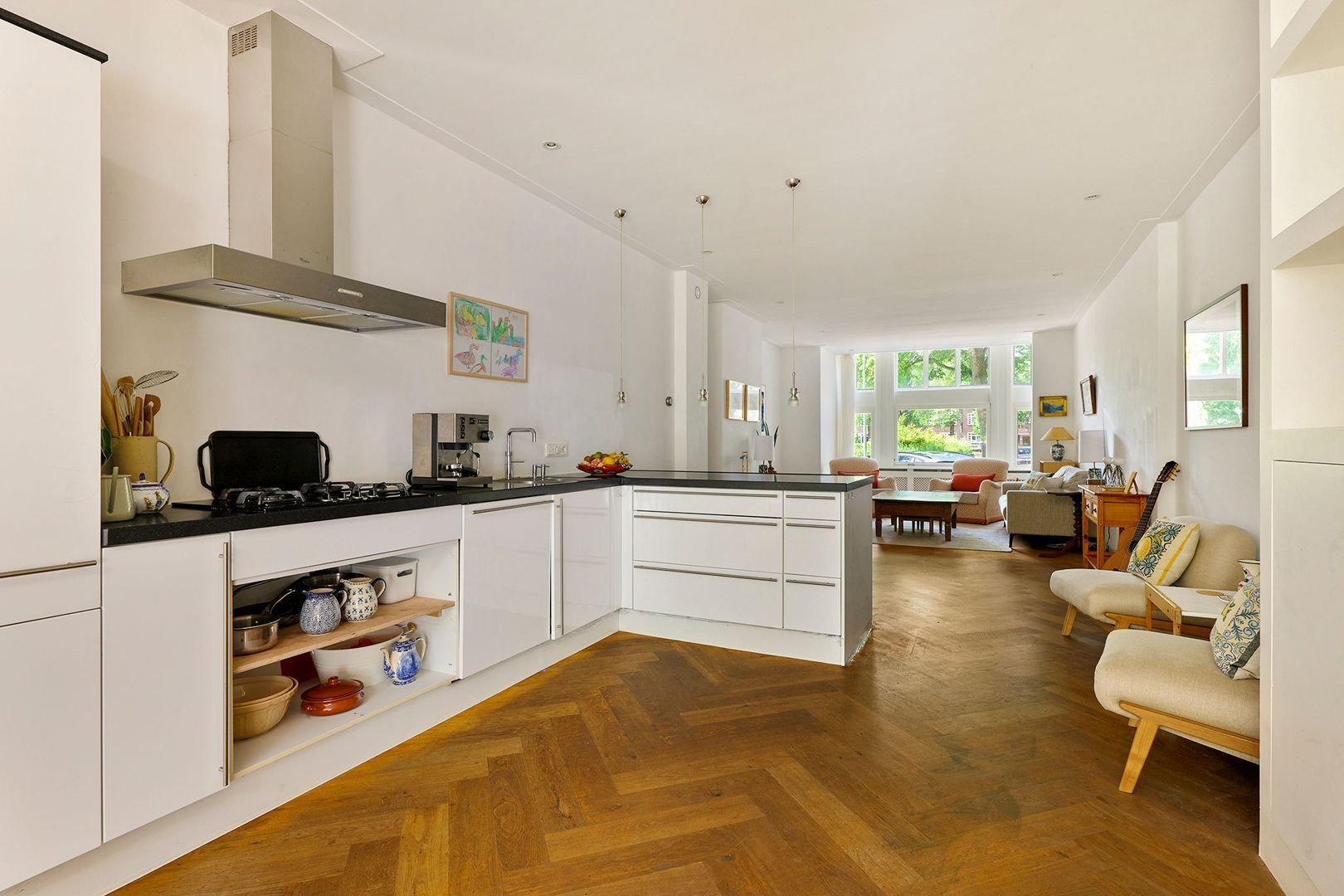 De royale woonkamer is onderverdeeld in een drietal ruimtes: een sfeervol zitgedeelte aan de voorzijde, de open keuken in het middendeel en een eetkamer aan de achterzijde. De zitkamer is voorzien van een erker met zicht op de straat en het tegenovergelegen plantsoen.