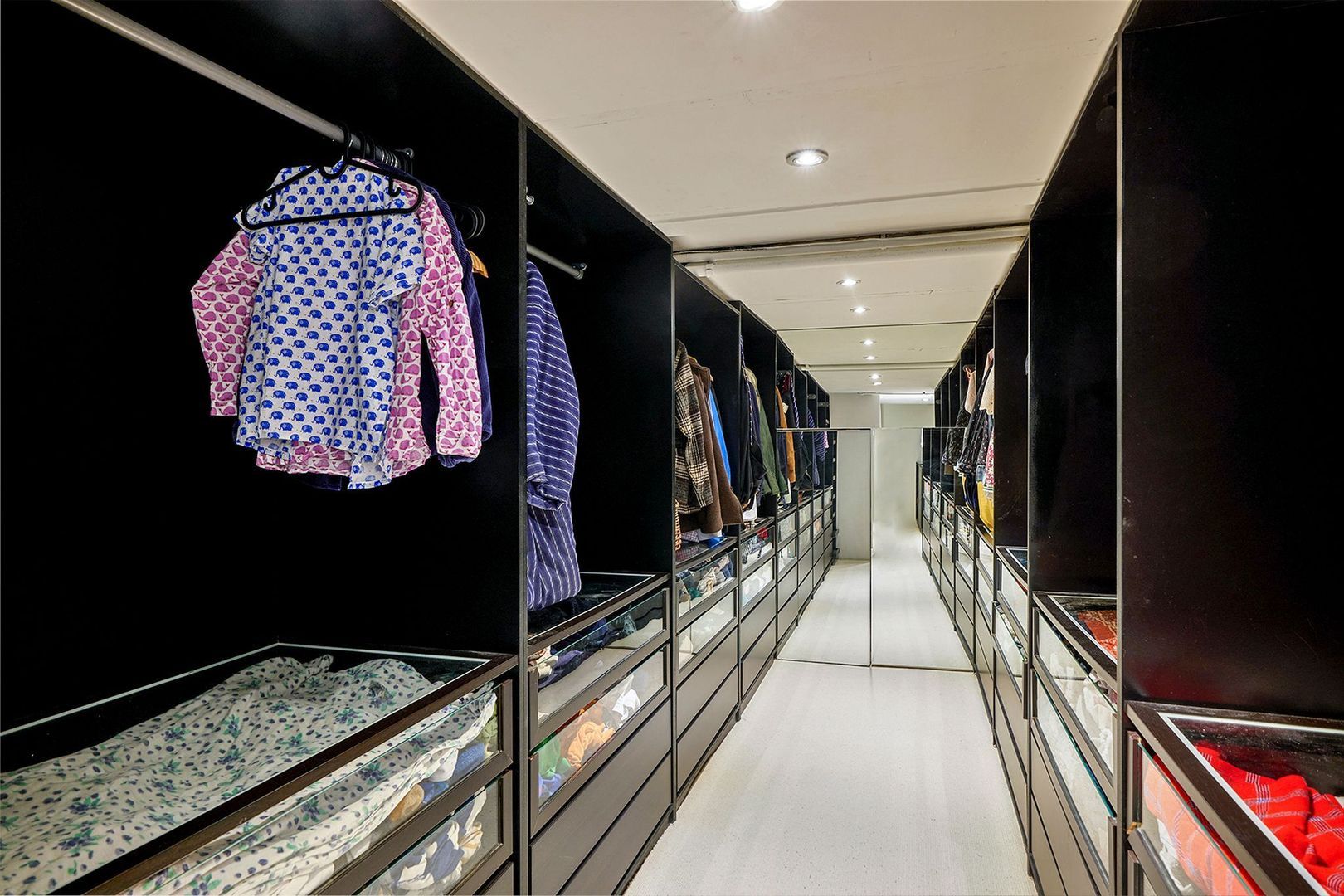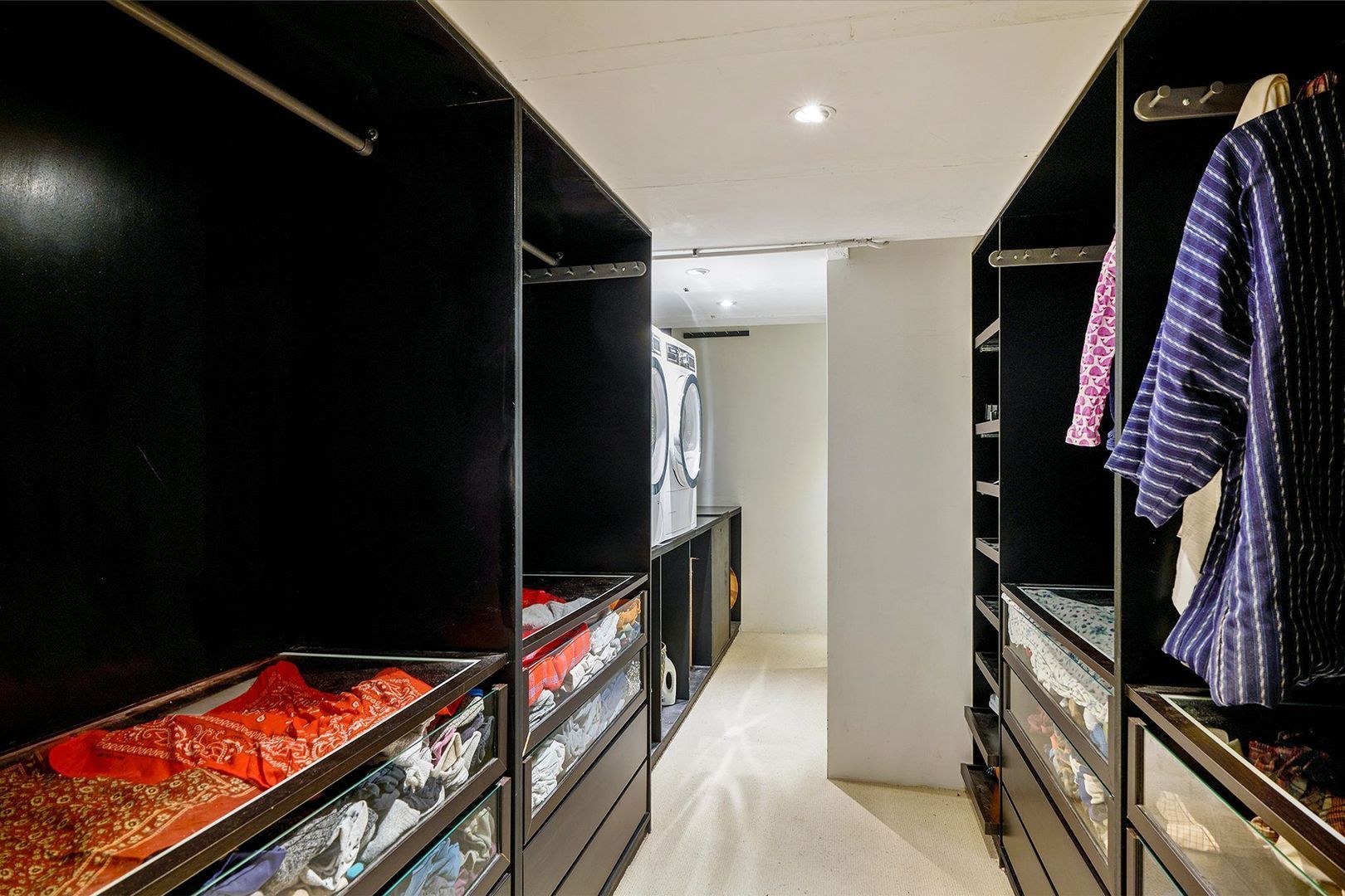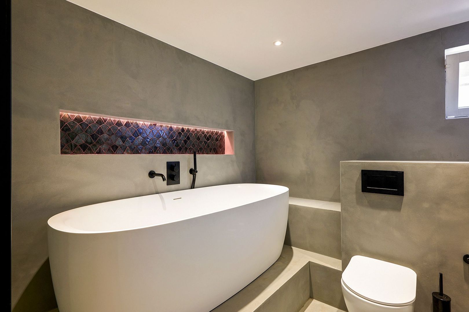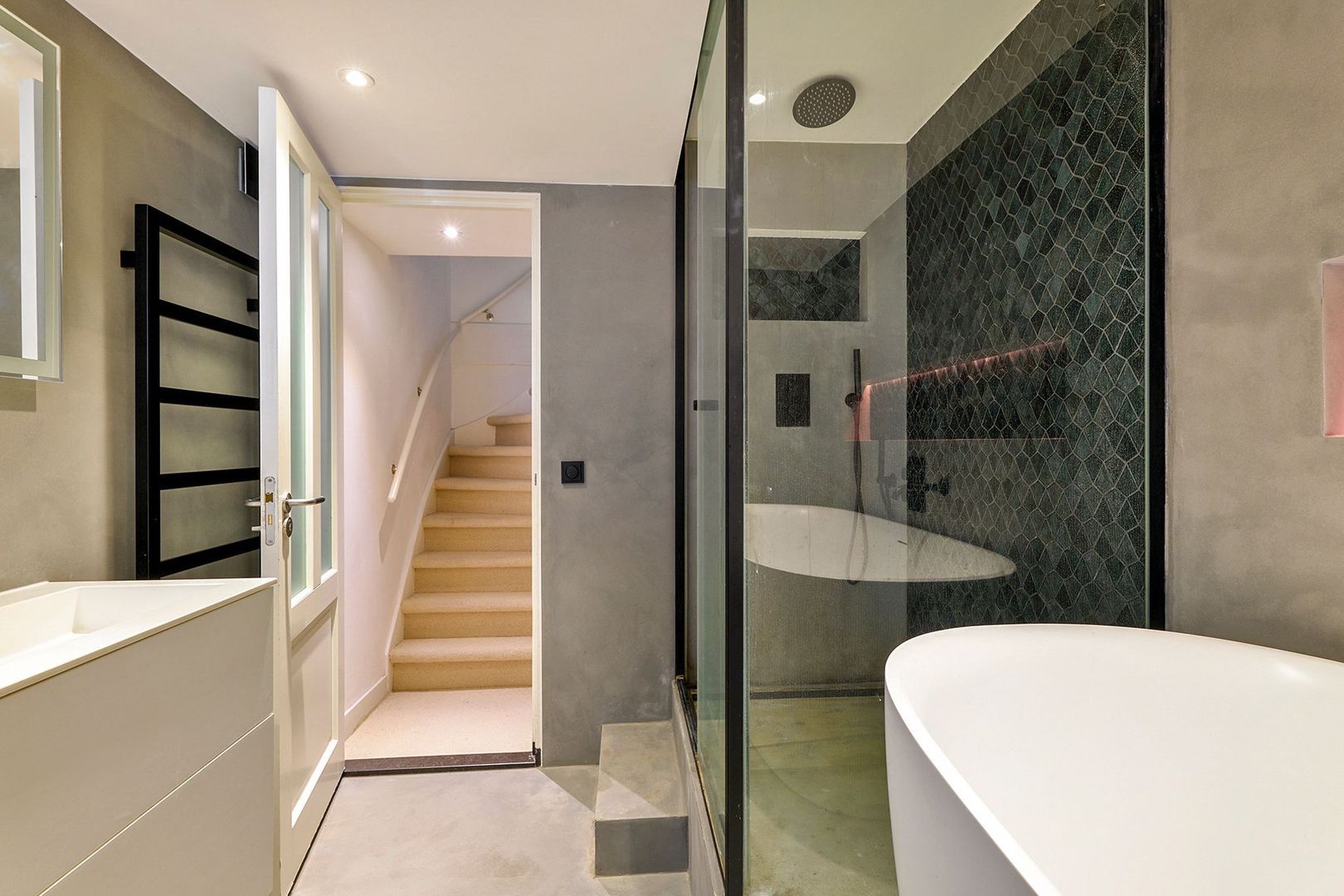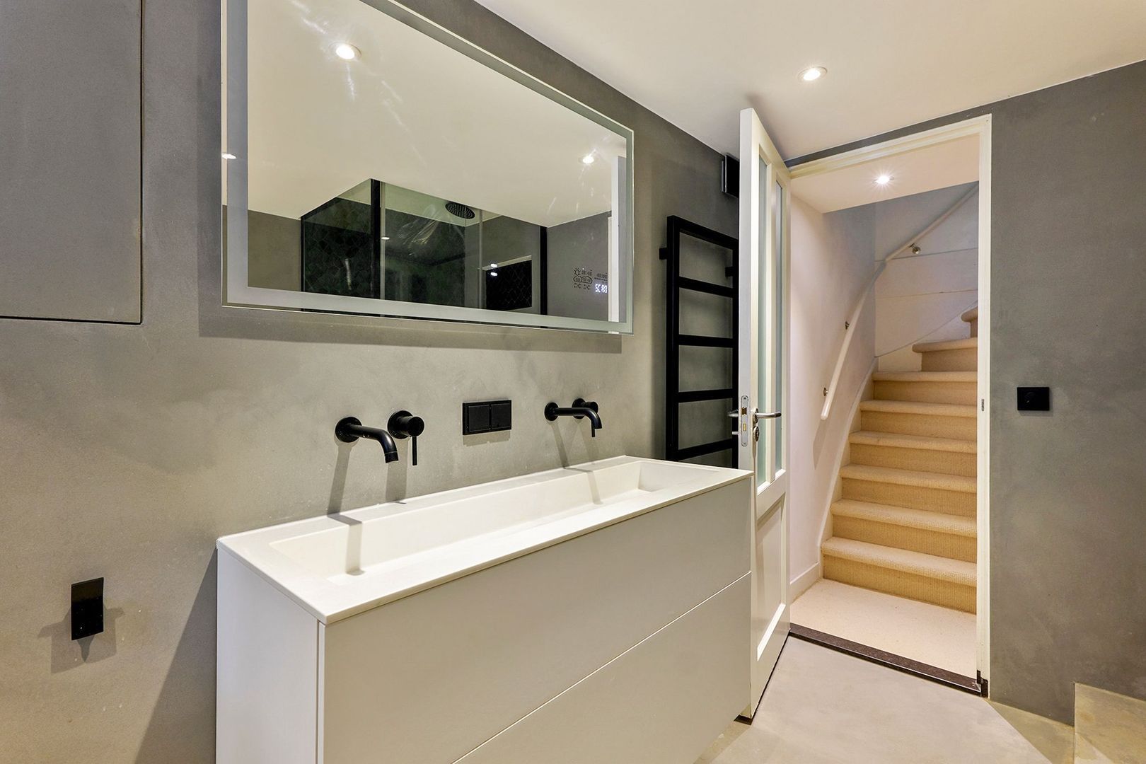 Via de centrale hal leidt een trap naar ondergelegen kelder, waar zich de ruime en moderne badkamer bevindt. Deze is uitgevoerd in een aardetint vloer en wand (grijs kleur) in combinatie met een modern betegelde douchewand in een groene kleurstelling. Voorts is de badkamer voorzien van een ruime douche met glazen ombouw en een regen- en handdouche, een ovaal ligbad, een zwevend toilet, ingebouwde zwarte kranen en een strak wit wastafelmeubel. De kelder voorziet nog in een riante walk-in-closet, extra bergruimte en een praktische wasruimte met aansluitingen voor wasmachine en droger.