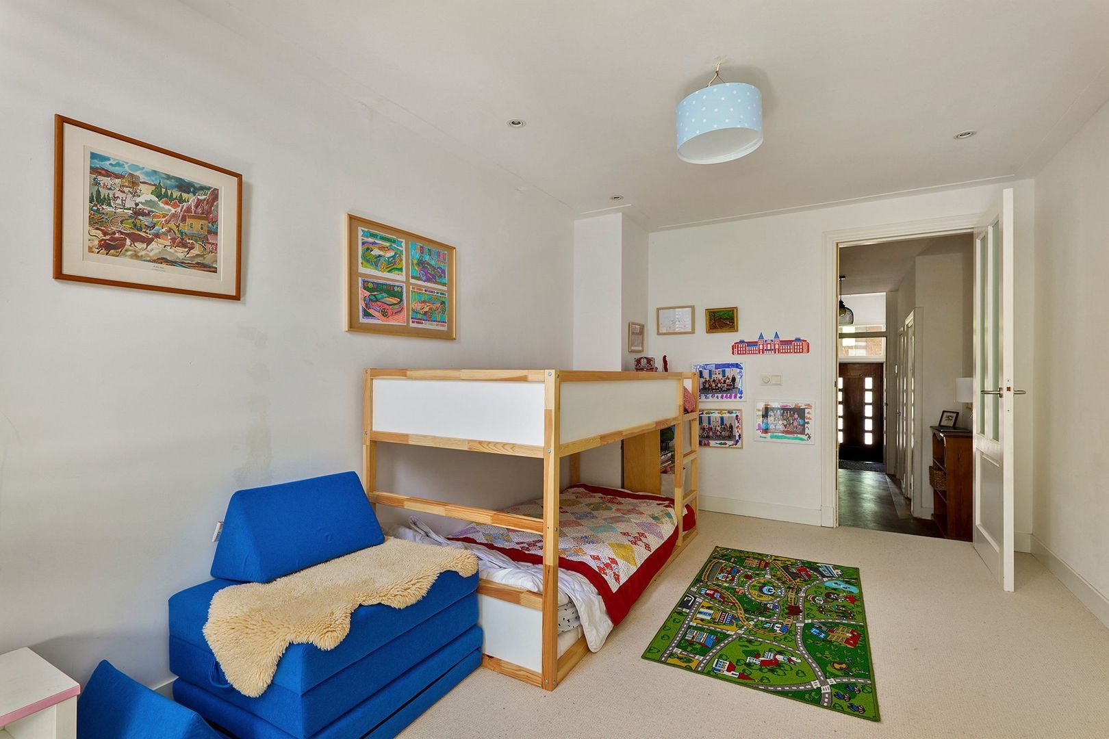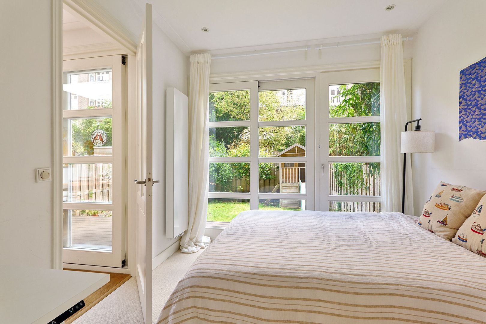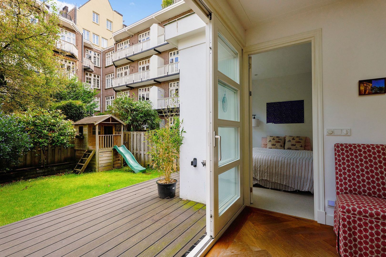 Vanuit de woonkamer is de hoofdslaapkamer bereikbaar. Ook deze kamer staat in verbinding met voornoemde tuin. Deze kamer geeft door middel van een open doorgang toegang tot een tweede slaapkamer in het midden van de verdieping, thans in gebruik als kinderkamer. Beide slaapkamers zijn eveneens bereikbaar via de hal.