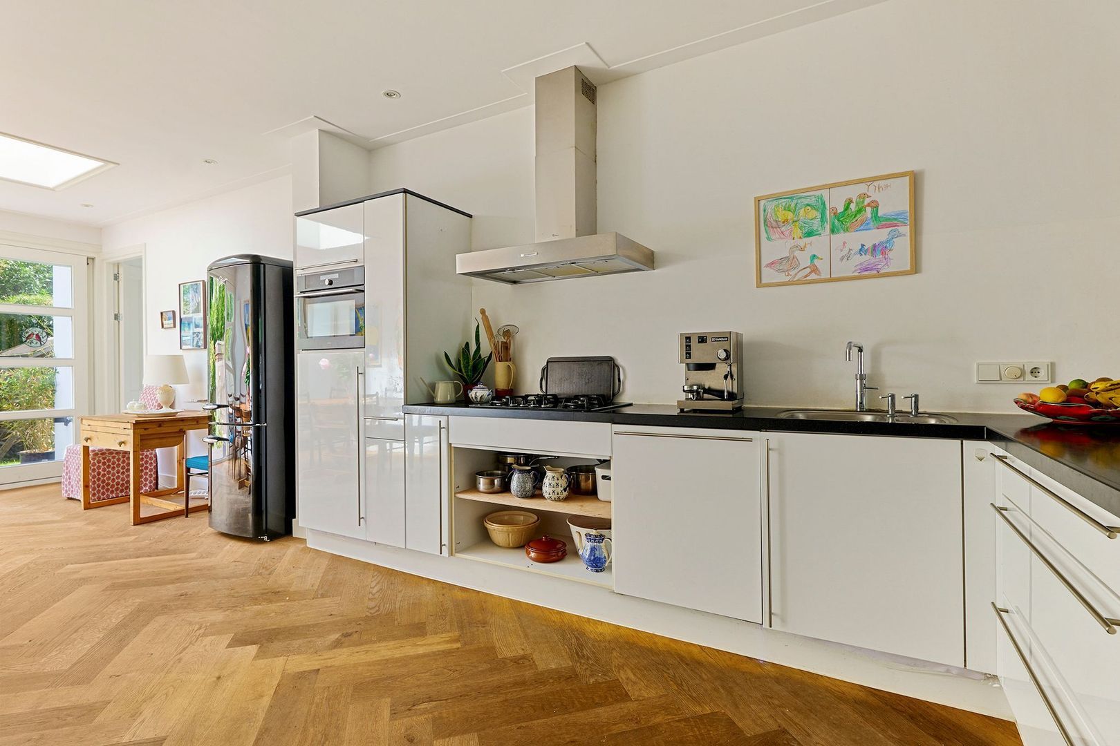 De open keuken heeft een L-opstelling wat het zit- en eetgedeelte ietwat van elkaar scheidt. De luxe keuken is uitgevoerd met hoogglans witte kasten en lades met een RVS greep in combinatie met een zwart natuurstenen werkblad. Deze keuken is volledig voorzien van hoogwaardige inbouwapparatuur waaronder een oven, koelkast, vaatwasser, Quooker en een 4-pits gasfornuis. Aan zitkamer zijde is een bar gecreëerd met zitruimte en zicht over de keuken en het eet gedeelte.