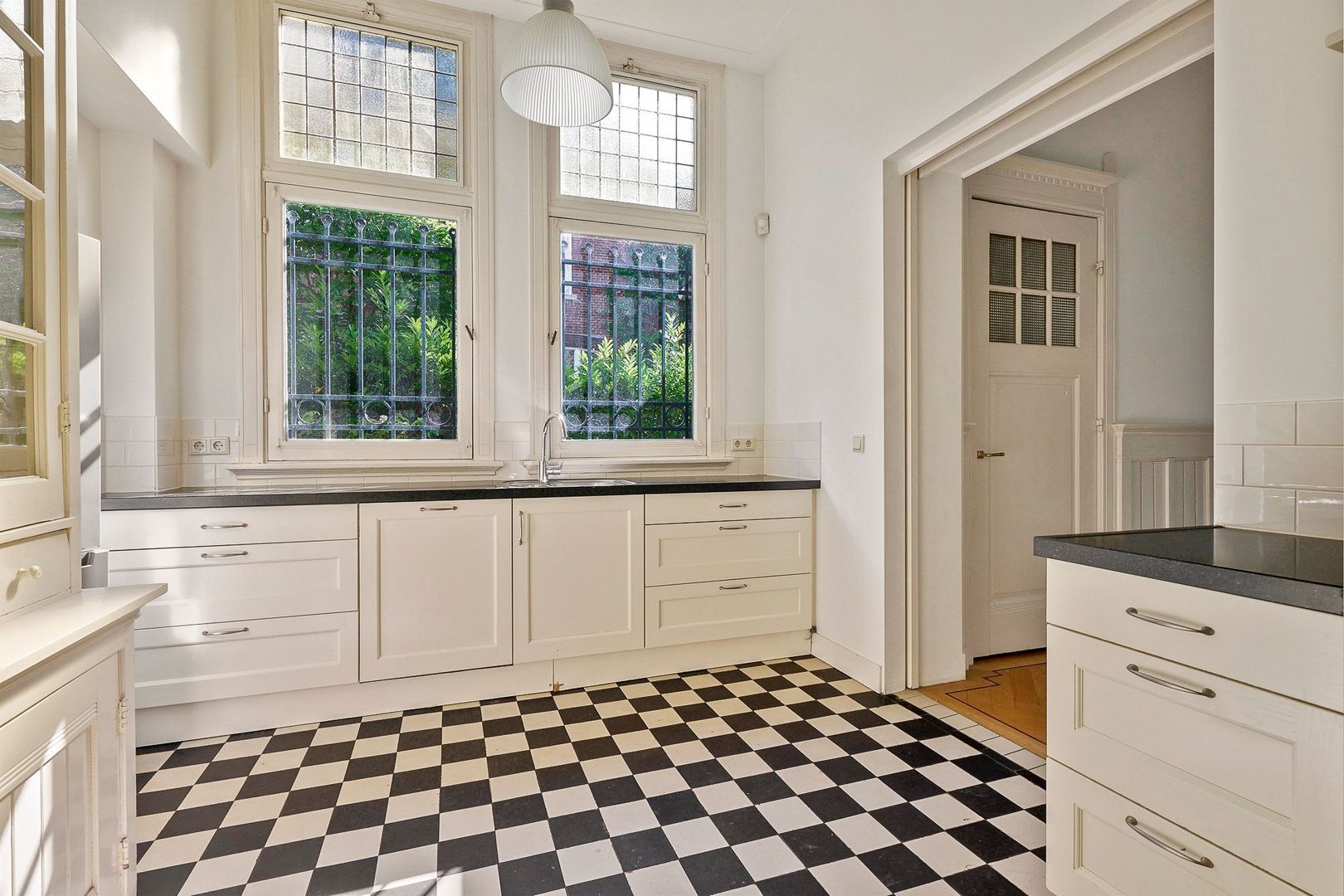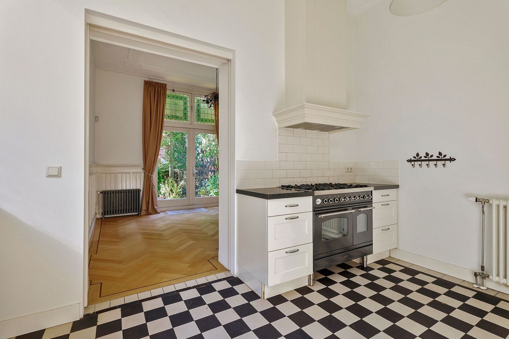 In het midden van de begane grond is de keuken gesitueerd, bereikbaar vanuit de centrale hal maar ook via de serre. Deze is naar believen afsluitbaar door schuifdeuren. Evenals de hal heeft de keuken nog de originele zwart/wit tegelvloer en aan de muur het Bellenbord. Deze ruime keuken is uitgevoerd met off white kasten en lades in combinatie met een donker gemêleerd natuurstenen werkblad. Voorts beschikt de keuken over diverse inbouwapparatuur met in het bijzonder vermeld het brede 6-pits Boretti fornuis met dubbele oven. Leuk detail is de originele vaste servieskast.