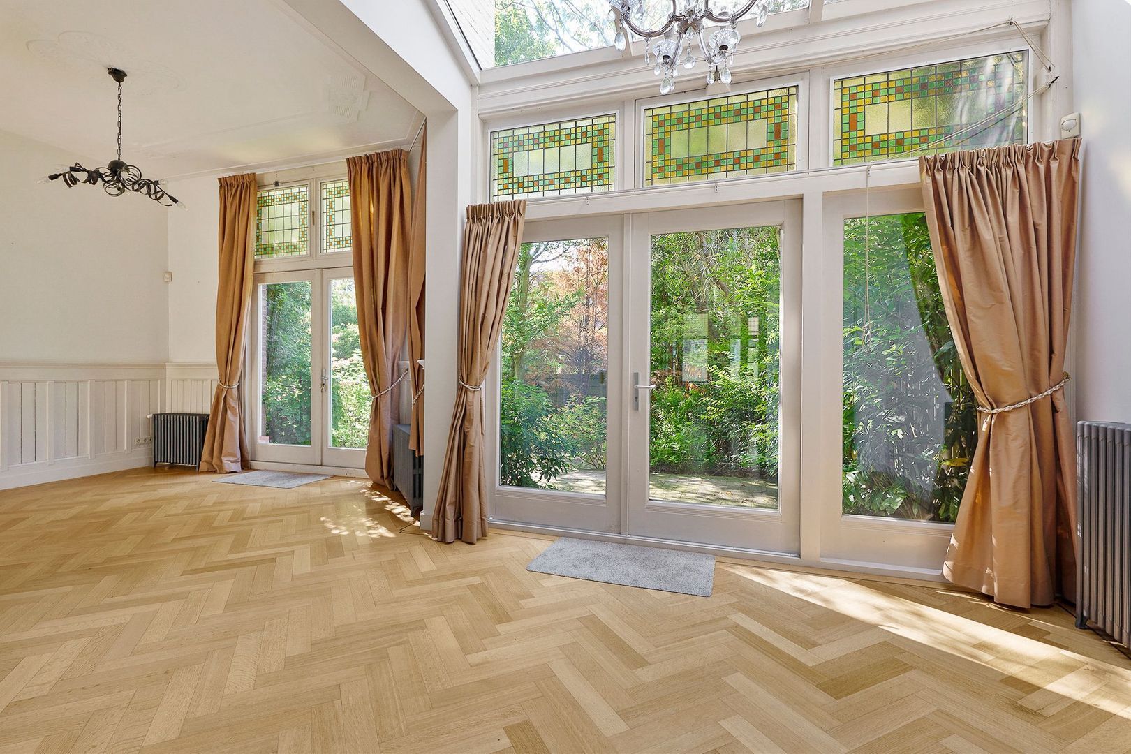 Via de eigen entree met marmeren tochtportaal biedt de fraaie glazen tussendeur toegang tot de ruime hal met originele tegelvloer. Vanuit hier is ieder vertrek toegankelijk en bevindt zich hier nog een goede trapkast, het separate toilet en de trap naar de 1e verdieping. De prachtige woonkamer beslaat een drieluik aan ruimtes; een sfeervolle zitkamer aan de voorzijde, een ruime eetkamer in het middendeel en een prachtige serre aan de achterzijde. De zitkamer is uitgevoerd met hoge raampartijen, een gashaard en en-suite deuren naar de eetkamer. Aan weerszijden van de en-suite deuren bevinden zich twee goede inbouwkasten. De eetkamer is voorzien van een diepe schouw en en-suite deuren met glas in lood bovenramen naar de aangrenzende serre. Deze brede serre is deels voorzien van dakramen wat de gehele begane grond van extra daglicht voorziet. Ook deze ruimte beschikt over een originele schouw en tweemaal openslaande deuren naar de tuin.