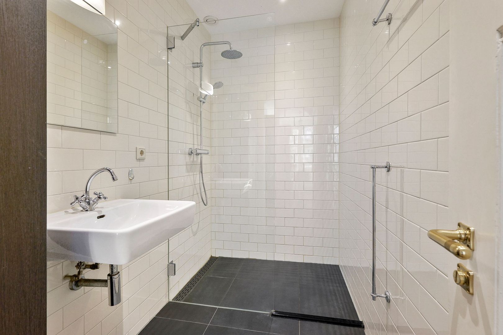 De serre biedt nog toegang tot een ruime berging waar zich de c.v. opstelling en wasmachineaansluiting bevinden. Via deze berging is de eerste badkamer te bereiken welke is uitgevoerd met een donkere vloer en een lichte wand en is voorzien van een douchecabine en een wastafel. Naast de entree tot de badkamer is er een extra deur naar de zijtuin.