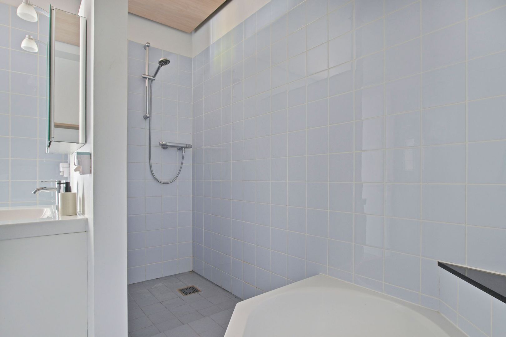 In het midden van het appartement zijn de sanitaire ruimtes te vinden. De ruime badkamer is uitgevoerd met een lichtgrijze vloer en een lichtblauwe wand in combinatie met een houten plafond met inbouwverlichting. Voorts voorziet de badkamer in een ligbad, toilet, inloopdouche, wastafelmeubel en een handdoekradiator. Via de extra toegang is de c.v. / wasruimte te bereiken.