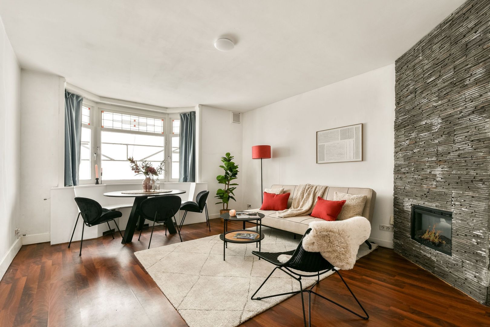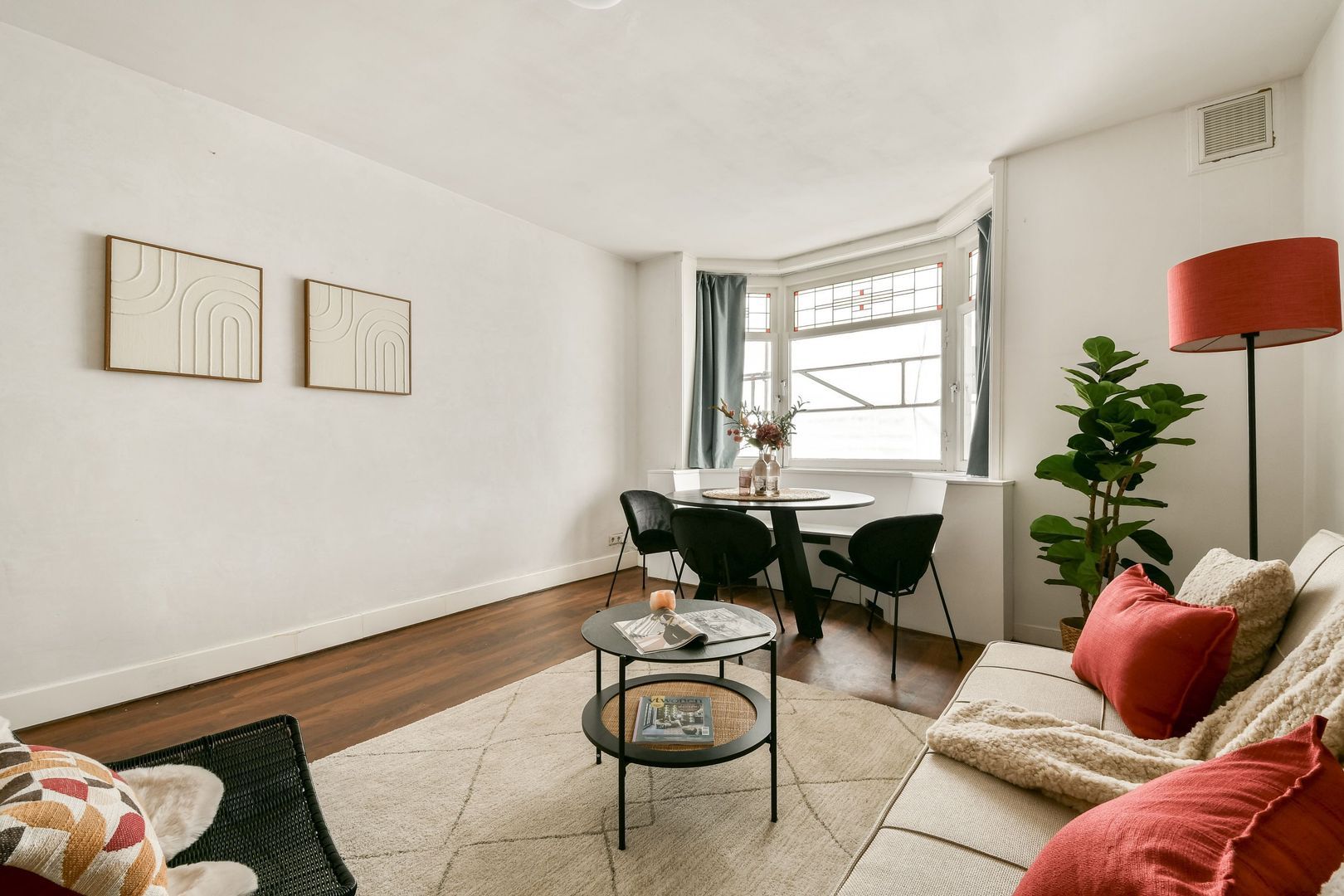 Lichte woonkamer met erker en zicht op de Schinkel;