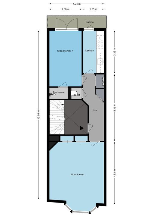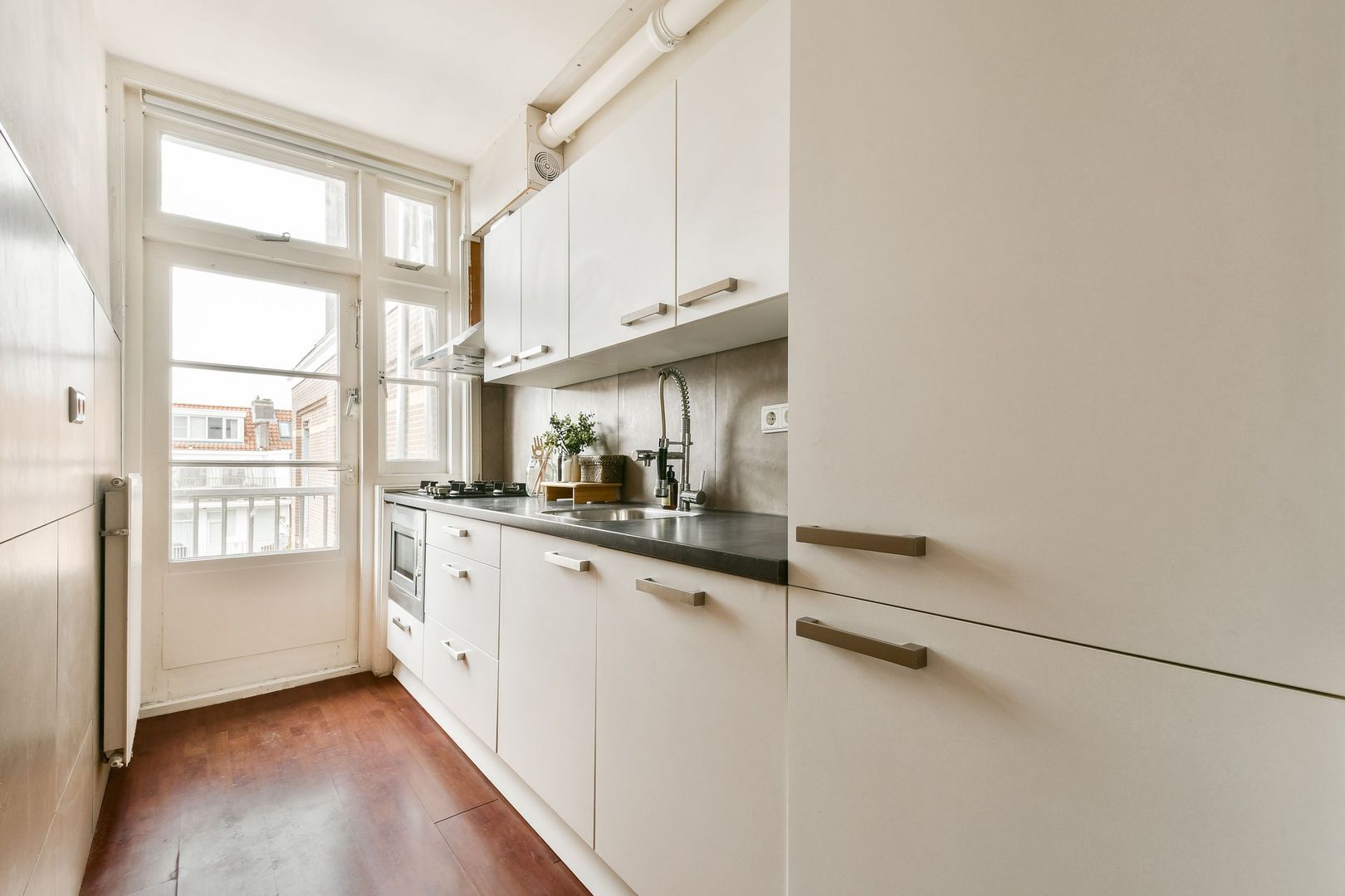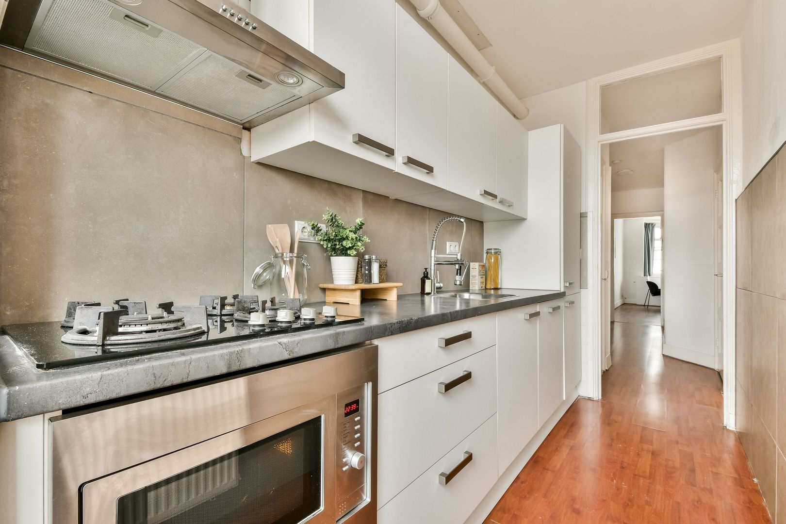De dichte keuken ligt aan de achterzijde, is voorzien van de c.v. ketel en geeft toegang tot het woningbreed balkon van 4,5m². De keuken is uitgevoerd met mat witte kasten in combinatie met een grijs gemêleerd werkblad.