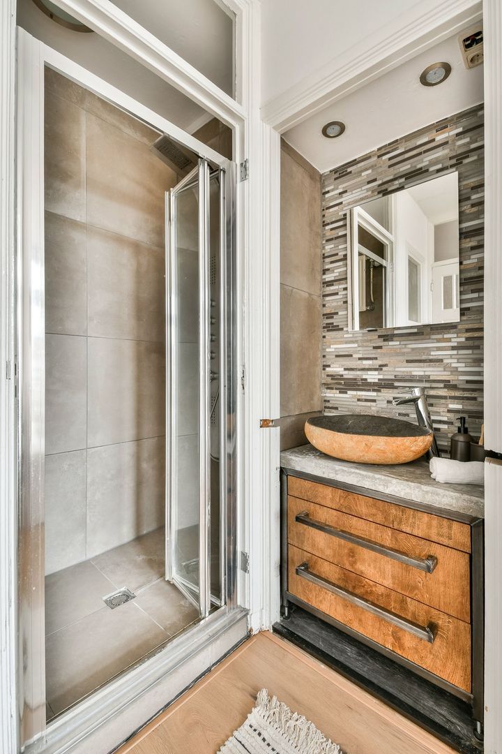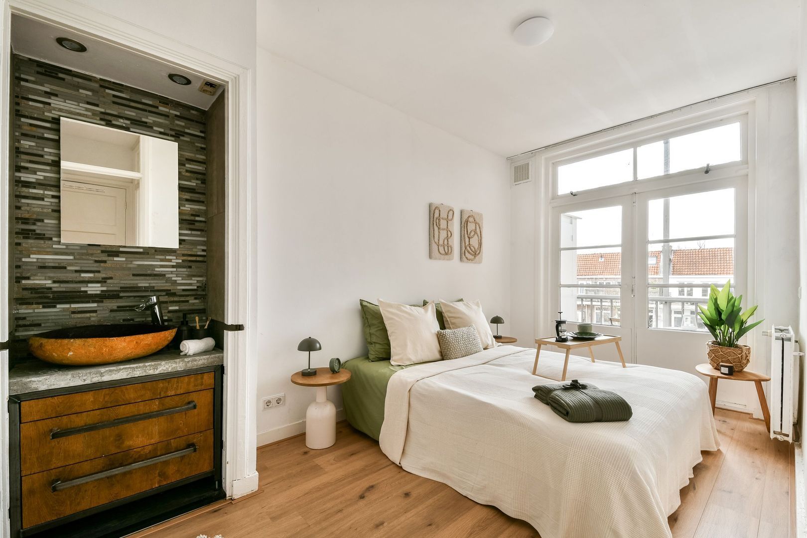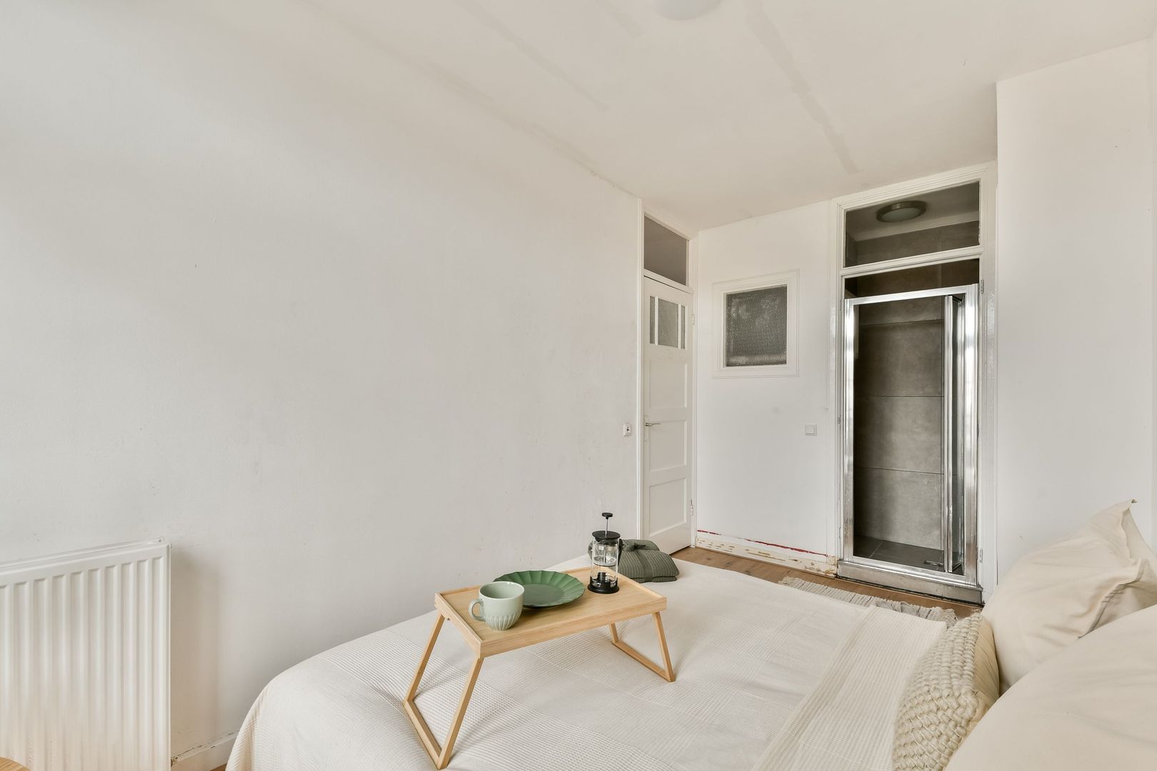 Naast de keuken is de prettige slaapkamer gesitueerd, tevens met toegang tot het balkon middels openslaande deuren en voorzien van een wastafelmeubel met waskom en spiegel. Vanuit de slaapkamer is de douche te bereiken via de harmonicadeur. Vanuit de hal is het separate toilet toegankelijk waartegenover nog twee inbouwkasten zijn gesitueerd.