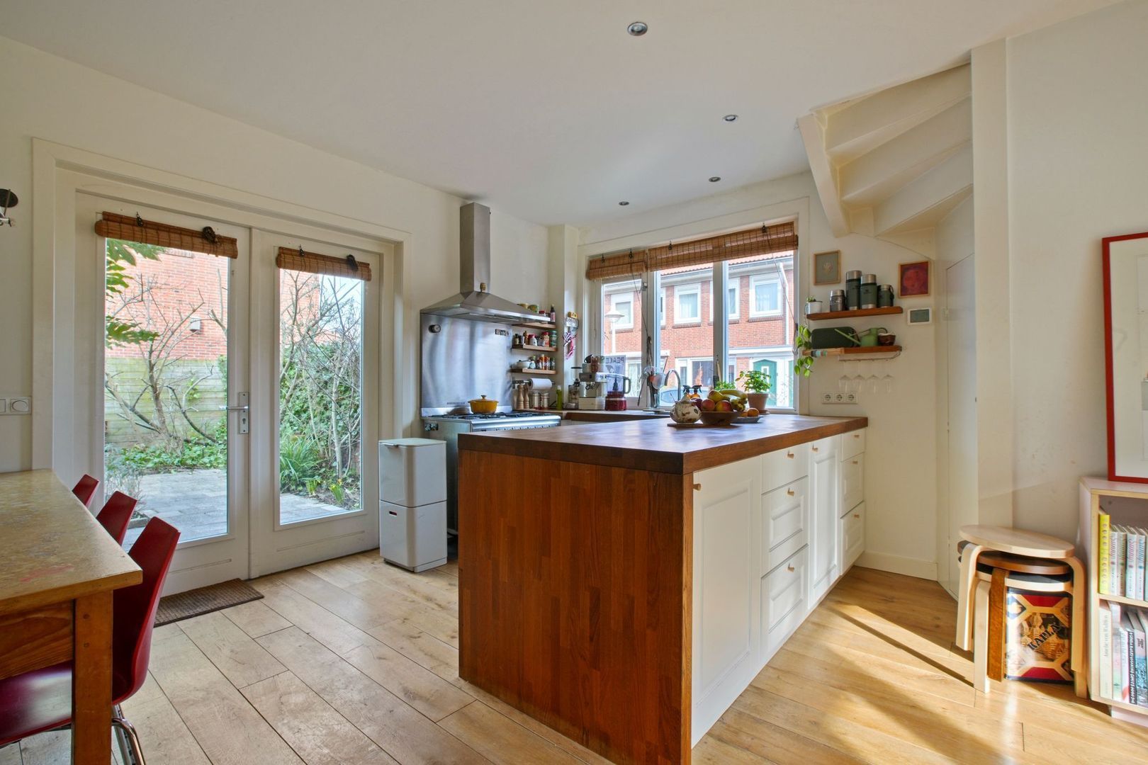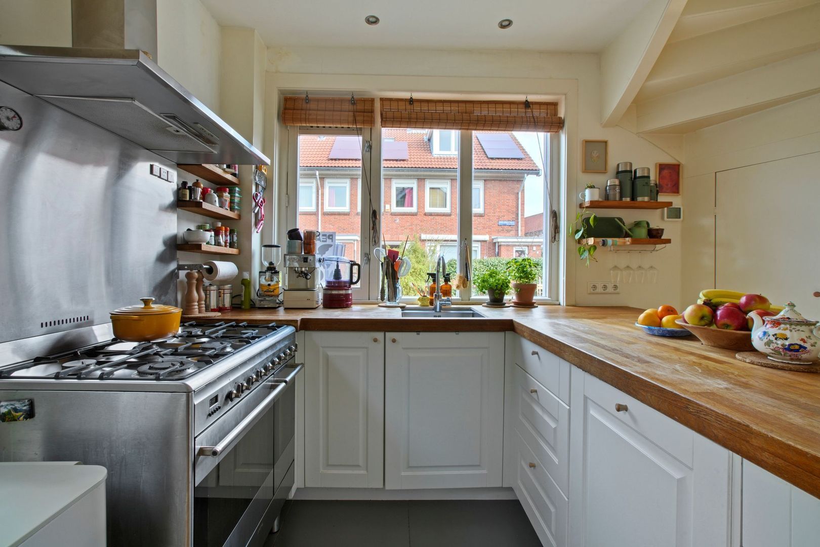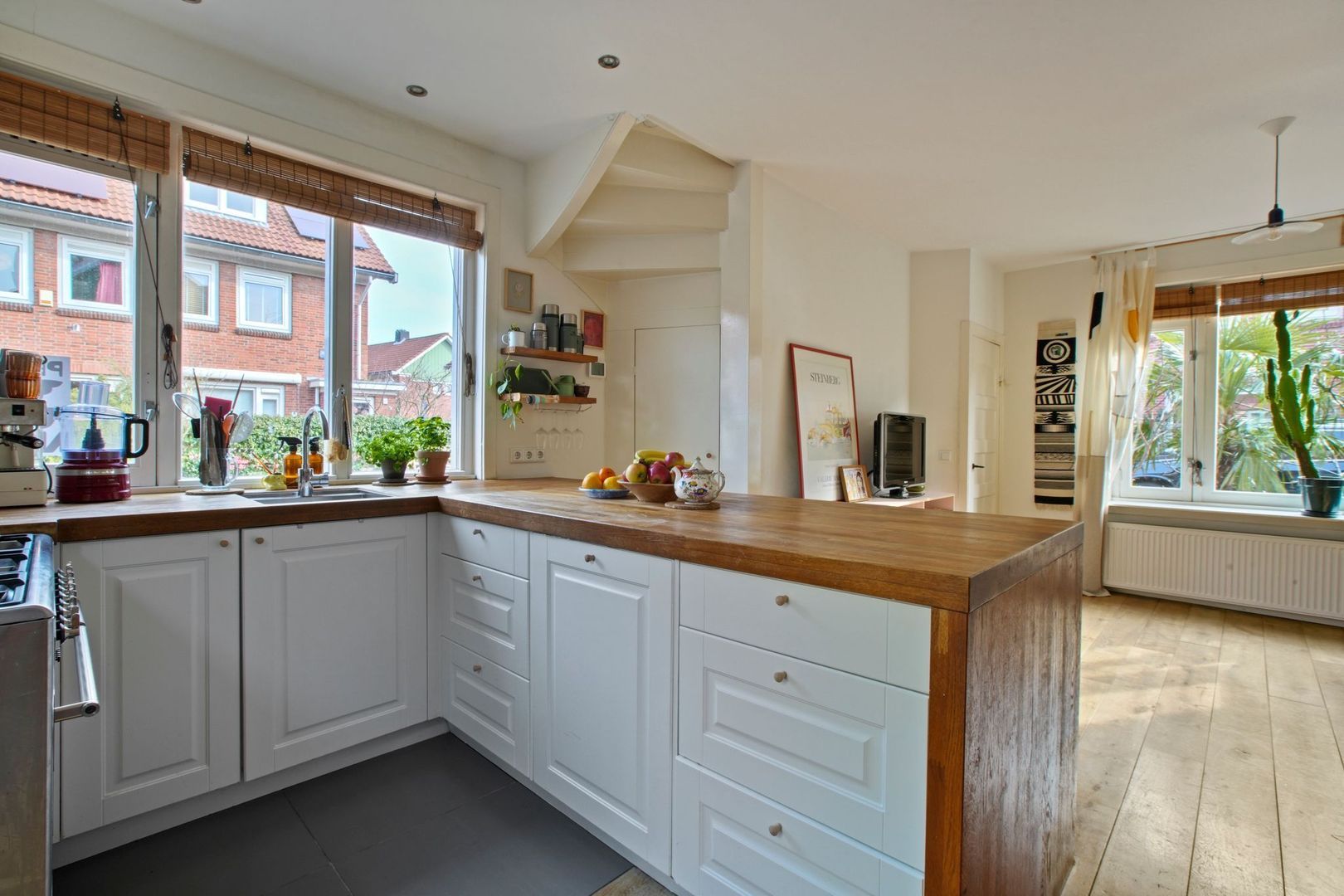 De grote open keuken vormt het hart van de woning en is uitgevoerd in een frisse witte kleurstelling met een warm houten werkblad. De keuken beschikt over inbouwapparatuur, waaronder een vaatwasser en koelkast. Dankzij de vele kastjes is er meer dan voldoende opbergruimte. De open opstelling maakt het een echte woonkeuken. Naast de keuken bevindt zich onder de trap nog een praktische extra bergkast.