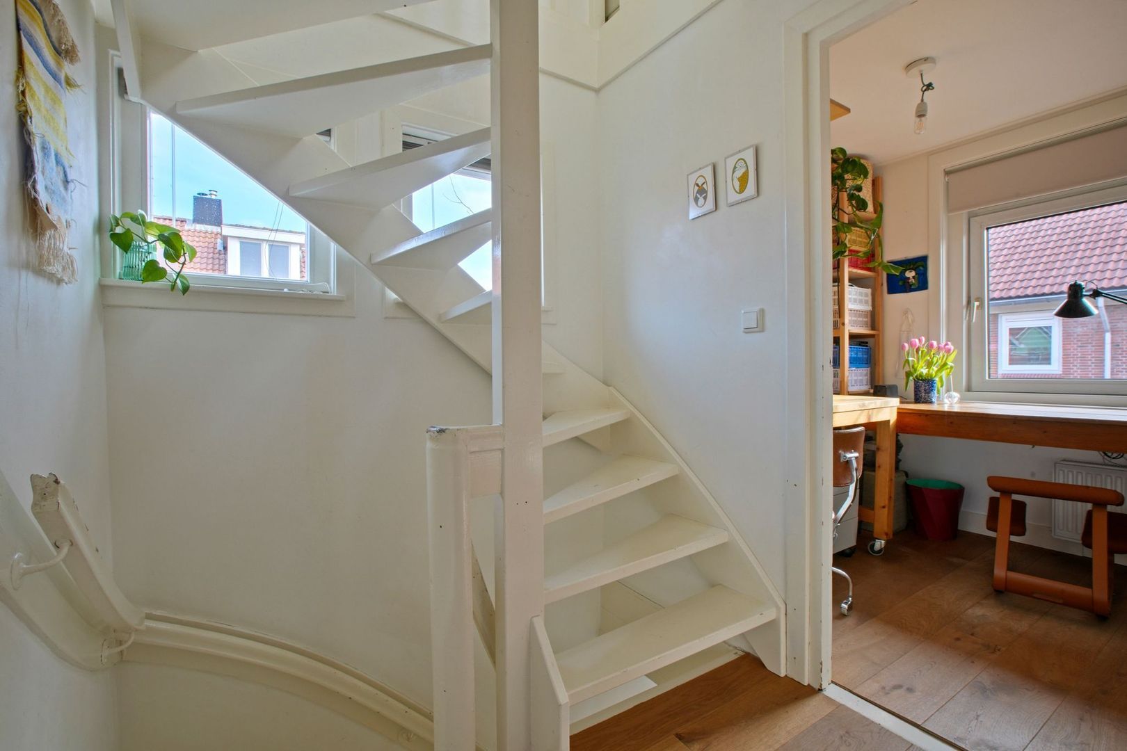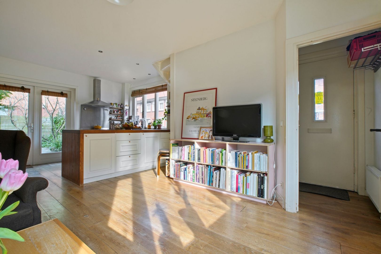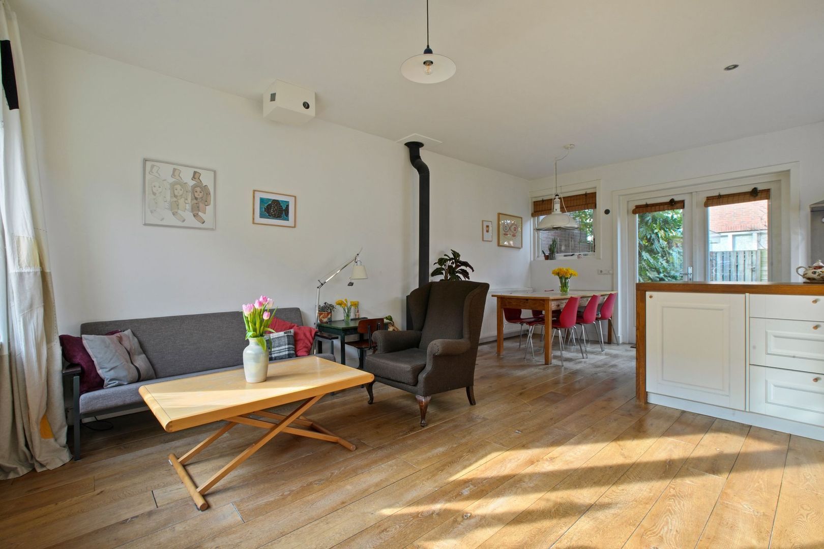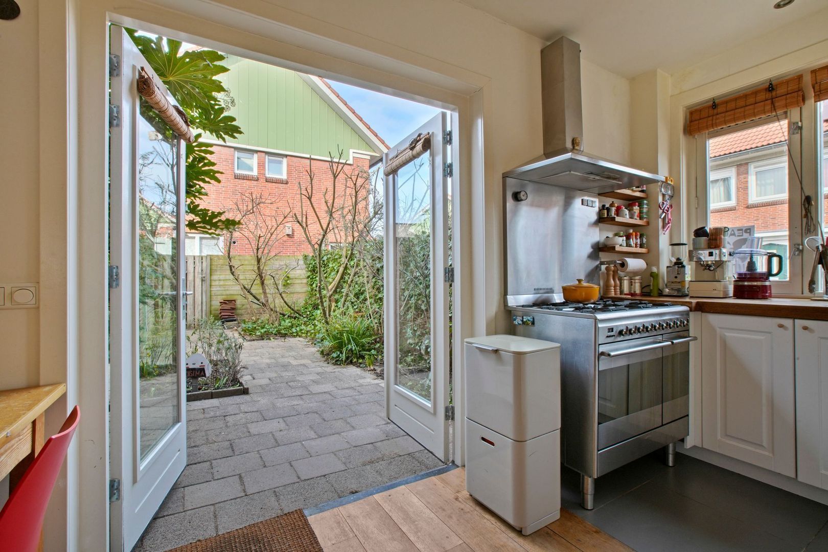 De grote open keuken vormt het hart van de woning en is uitgevoerd in een frisse witte kleurstelling met een warm houten werkblad. De keuken beschikt over inbouwapparatuur, waaronder een vaatwasser en koelkast. Dankzij de vele kastjes is er meer dan voldoende opbergruimte. De open opstelling maakt het een echte woonkeuken. Naast de keuken bevindt zich onder de trap nog een praktische extra bergkast.