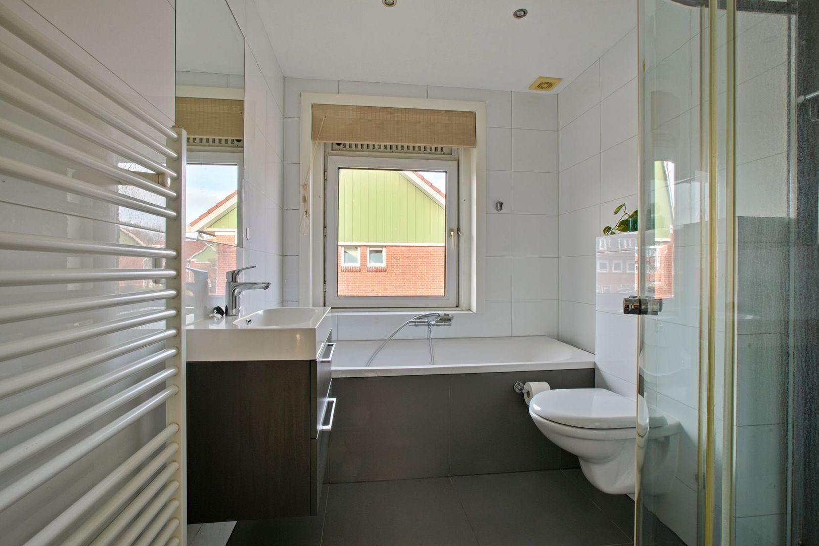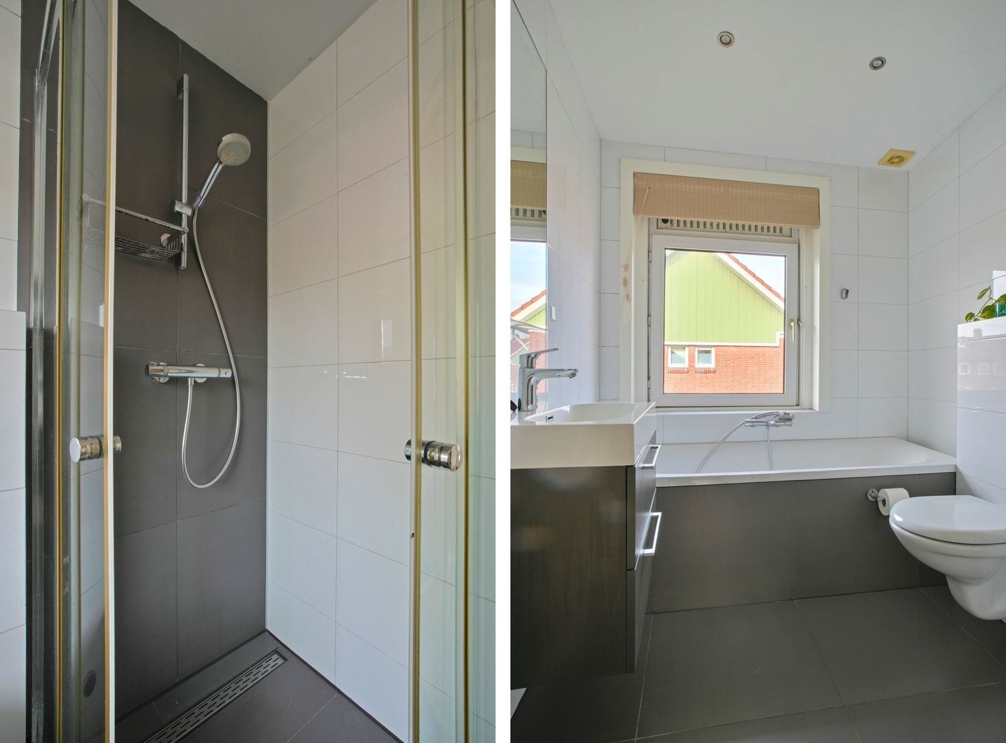 De lichte en royale badkamer is uitgevoerd met een grijze vloertegel en witte wandtegels. De badkamer beschikt over een douche, ligbad, toilet en een wastafelmeubel.