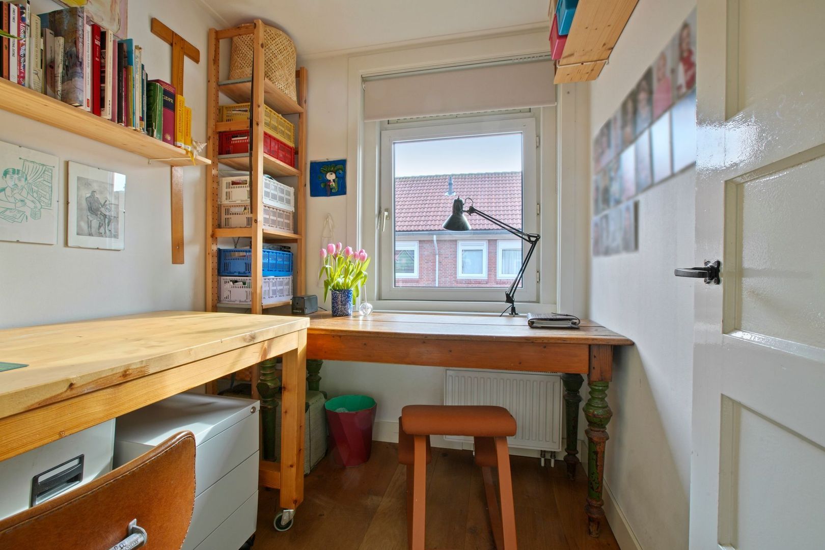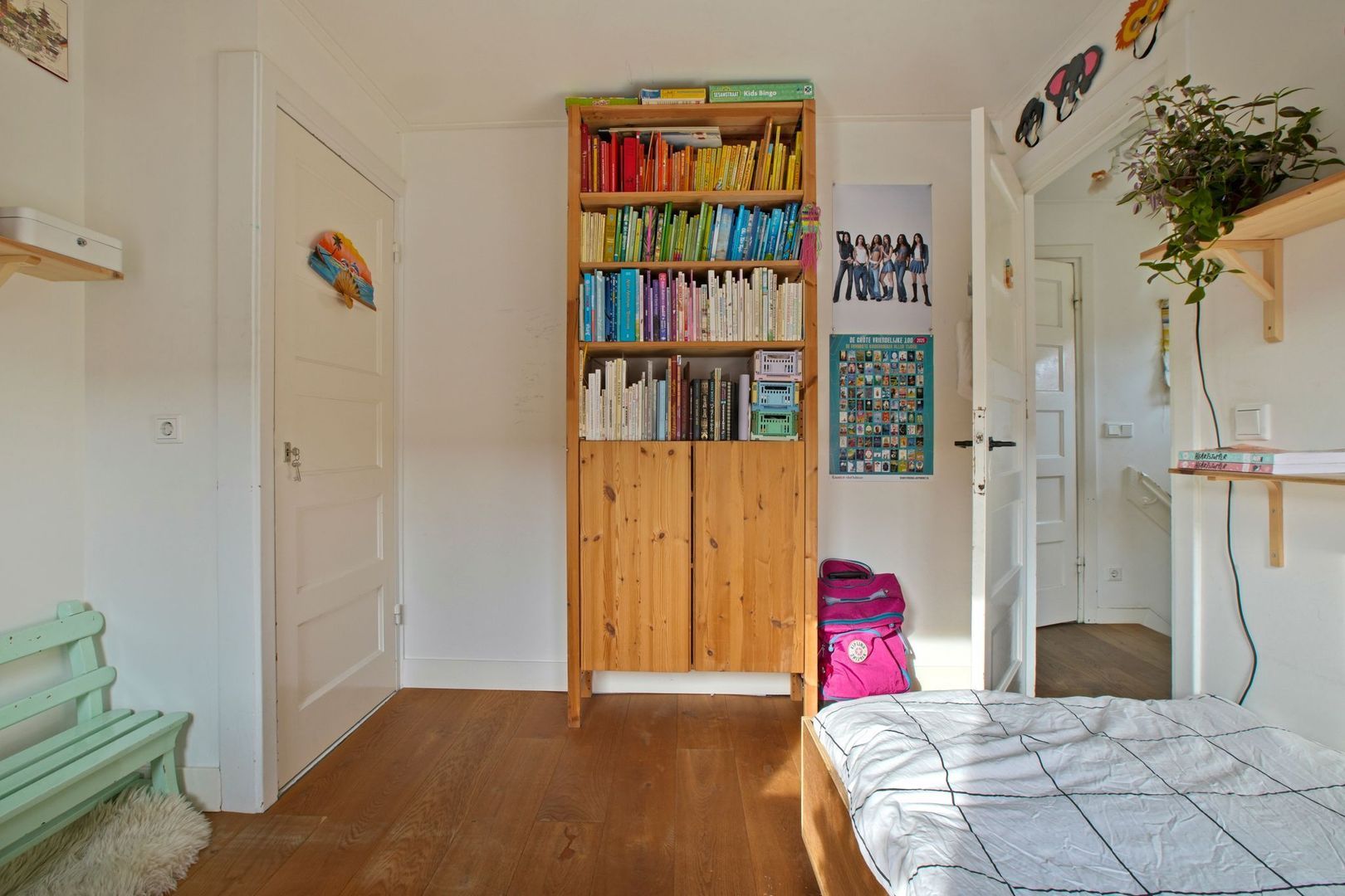Via de witte trap in de hal bereik je de eerste verdieping. Hier bevinden zich twee volwaardige slaapkamers, een werk-/baby kamer en de badkamer. De slaapkamer aan de voorzijde ligt naast de werk-/baby kamer. De tweede ruime slaapkamer bevindt zich aan de achterzijde. Beide slaapkamers bieden voldoende ruimte voor een tweepersoonsbed en een garderobekast.
