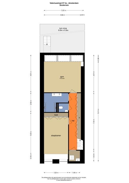 Een tweede houten trap in de hal op de begane grond leidt naar het volwaardige souterrain. De lange gang geeft toegang tot alle ruimtes en is over de gehele lengte voorzien van op maat gemaakte plafondhoge kledingkasten. Beide slaapkamers zijn ruim van formaat en uitgevoerd met gelijke houten kasten. Opvallend zijn de sierlijke ronde ‘hoeken” van de kast in de kamer aan de achterzijde, thans in gebruik als gym en met prachtige ramen over de volle breedte van het pand, met zicht op de tuin.