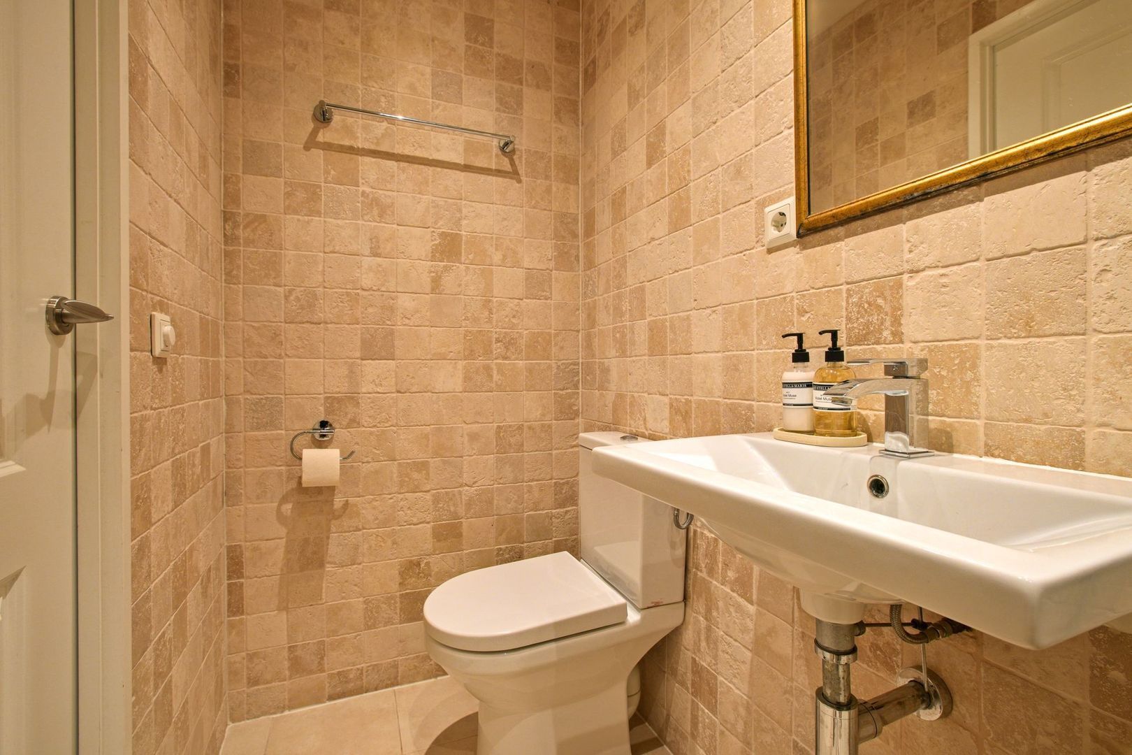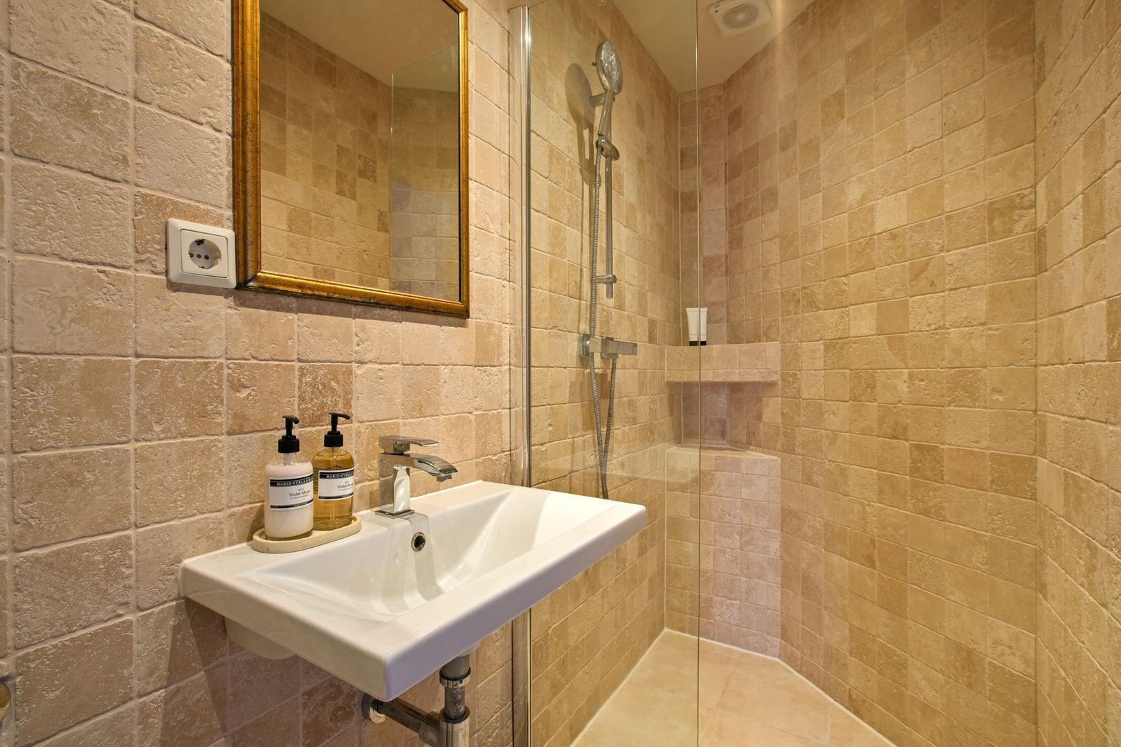 In het midden van de woning bevindt zich de badkamer. De badkamer is uitgevoerd met een lichte vloertegel en een gemêleerde natuurstenen zandkleurige wandtegel en biedt een inloopdouche, wastafel en het toilet. Naast de badkamer ligt een ruime berging met de meterkast en goede extra bergruimte.