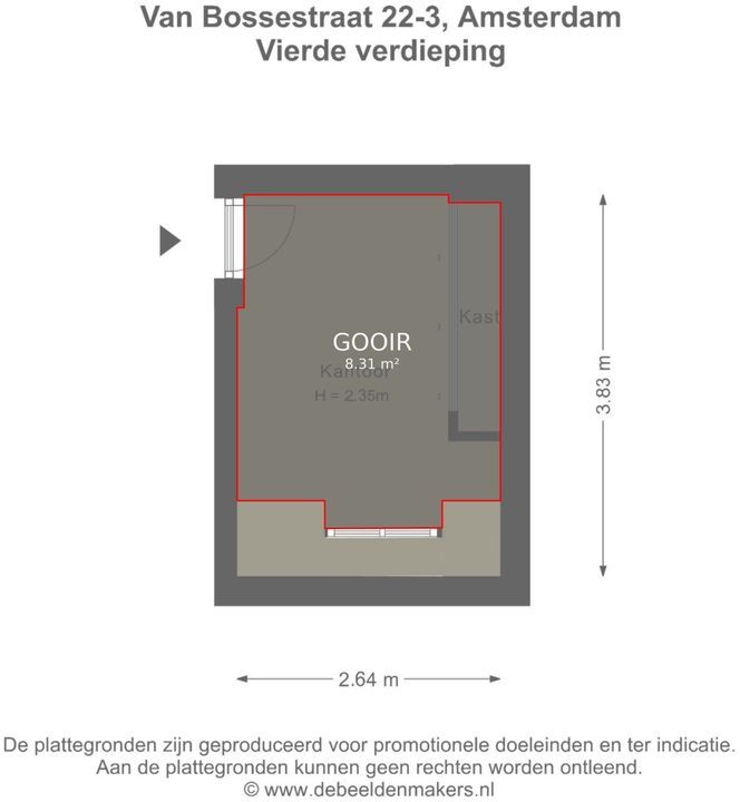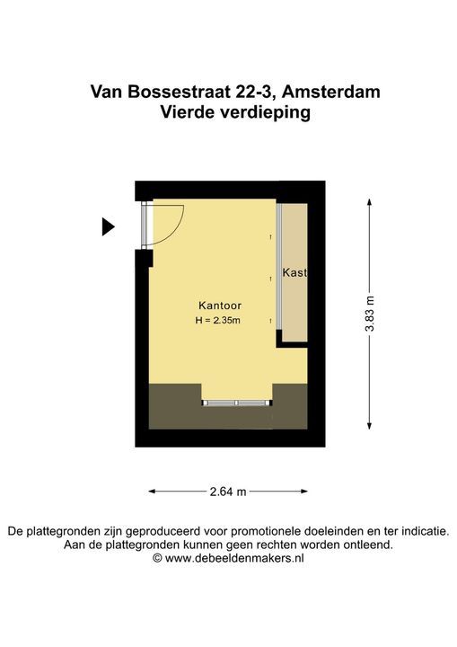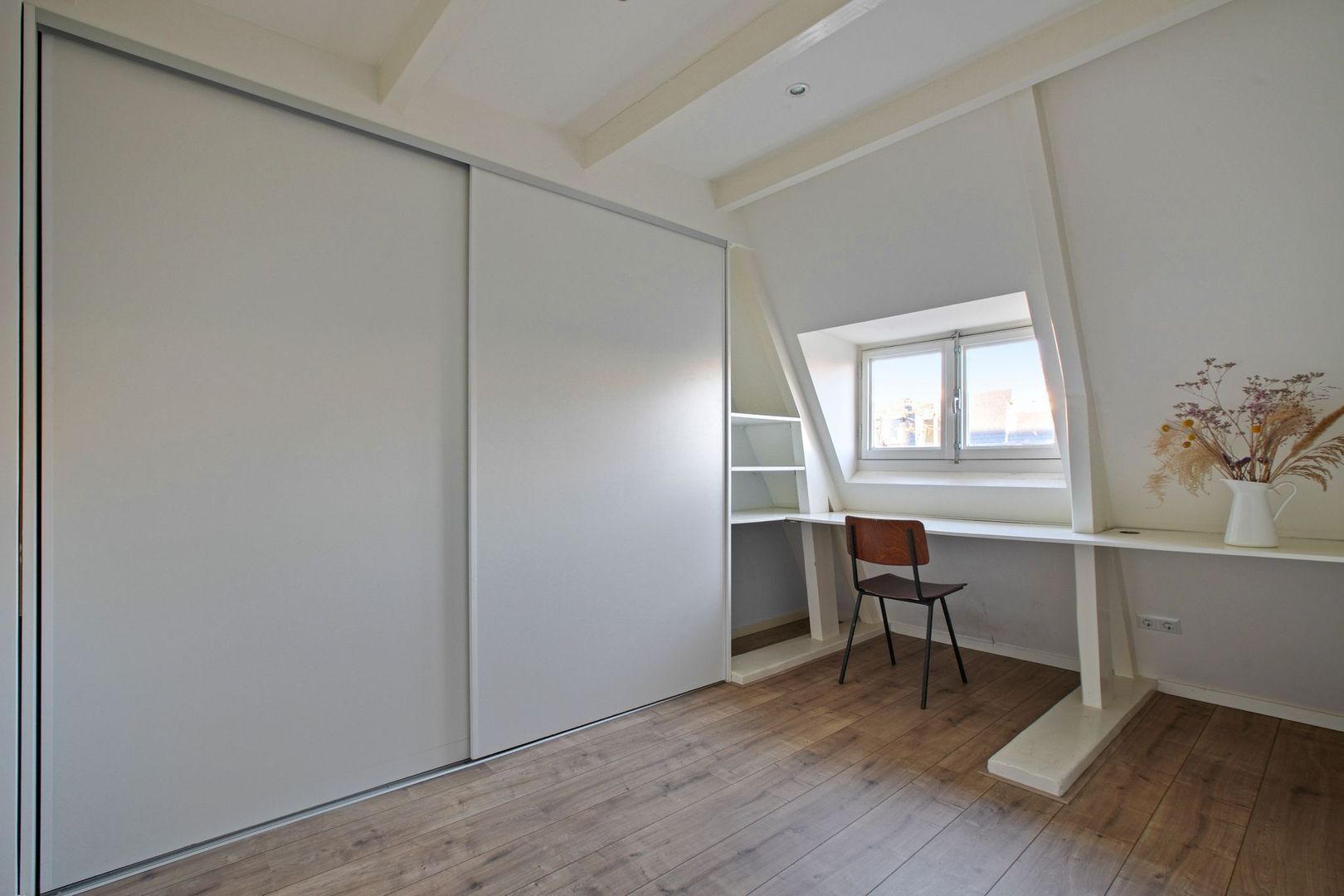 Via het gemeenschappelijke trappenhuis is de externe zolderkamer, die zich direct op de verdieping boven de woning bevindt, te bereiken. Deze kamer van 9m² is netjes afgewerkt, met een ingebouwde kast met schuifdeuren en een ingebouwd bureau, en kan perfect dienen als werk-/ of logeerkamer.