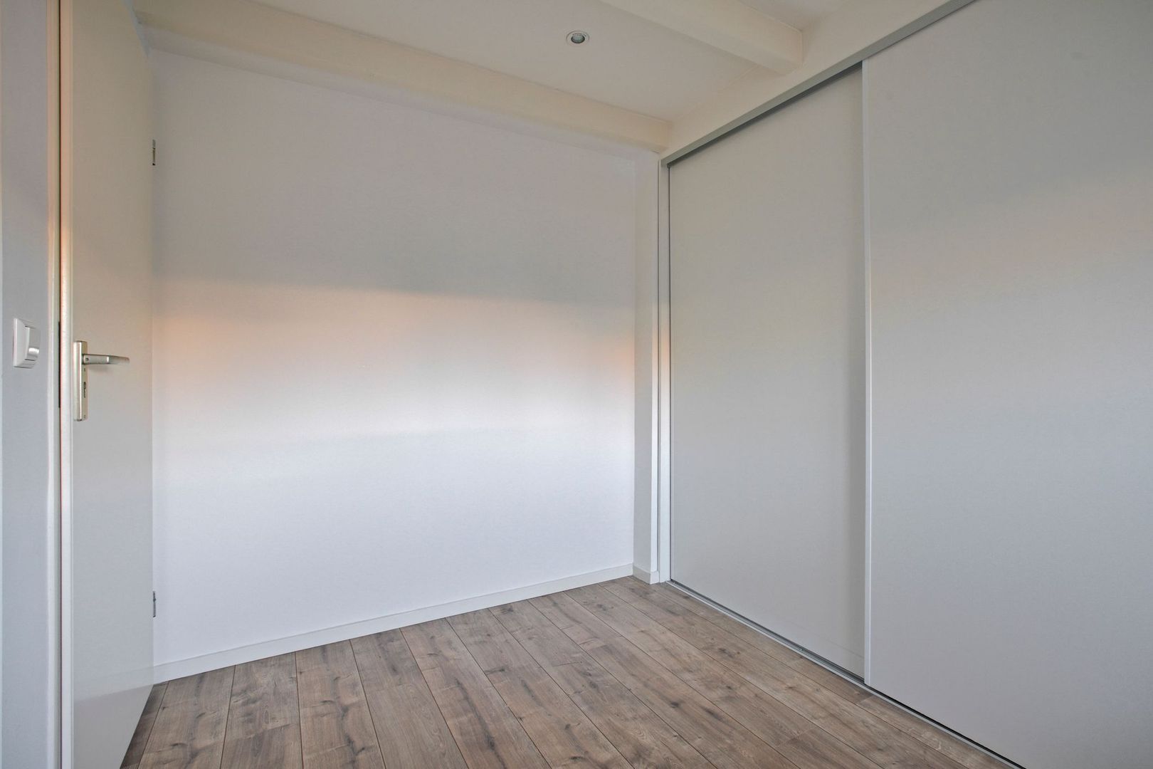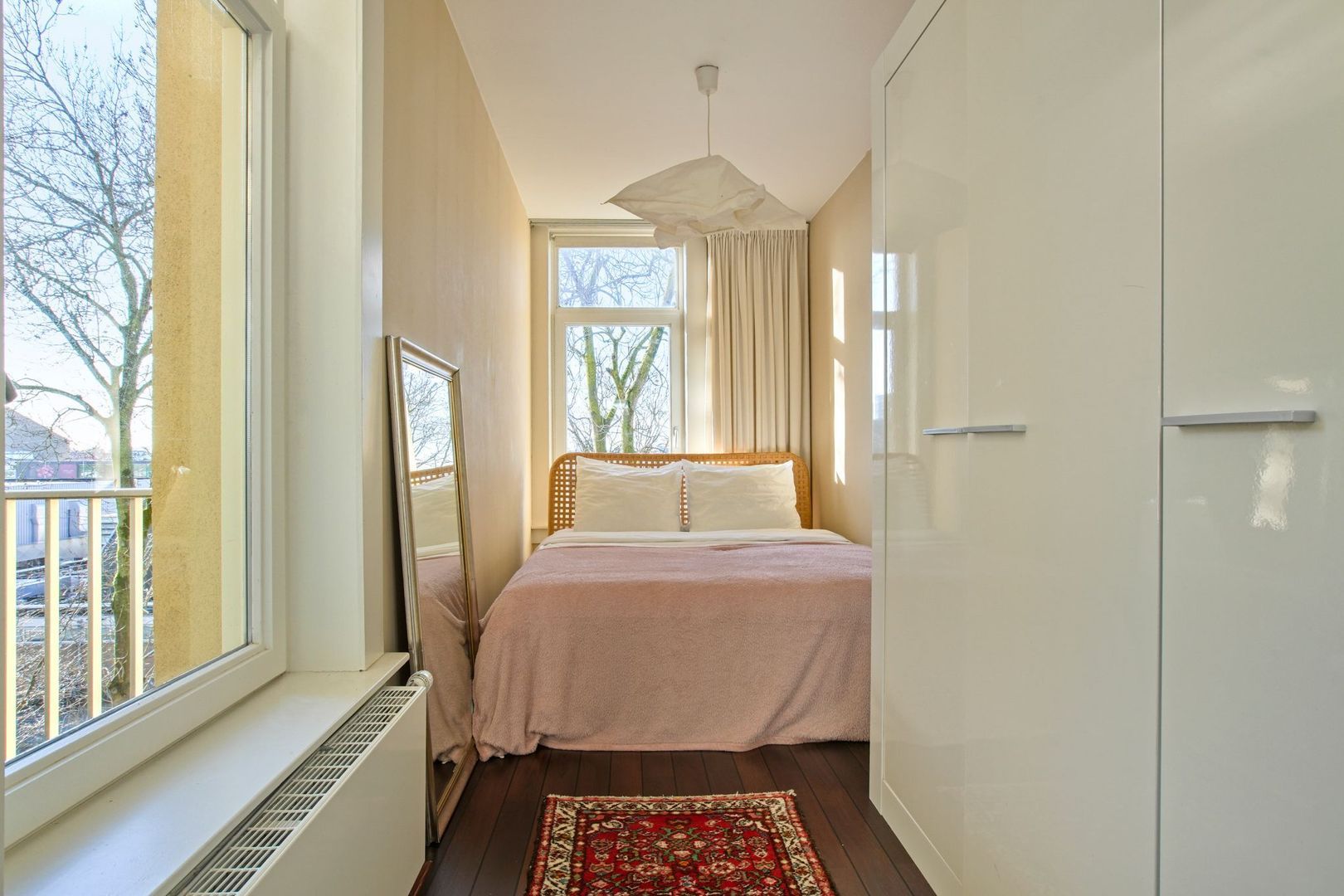 Aan de achterzijde van het appartement is de ruime slaapkamer gesitueerd. Door het goede formaat is er plaats voor zowel een tweepersoonsbed als een goede kledingkast. Prettig detail zijn de ramen aan twee zijdes wat ook deze kamer van een goede lichtinval voorziet.