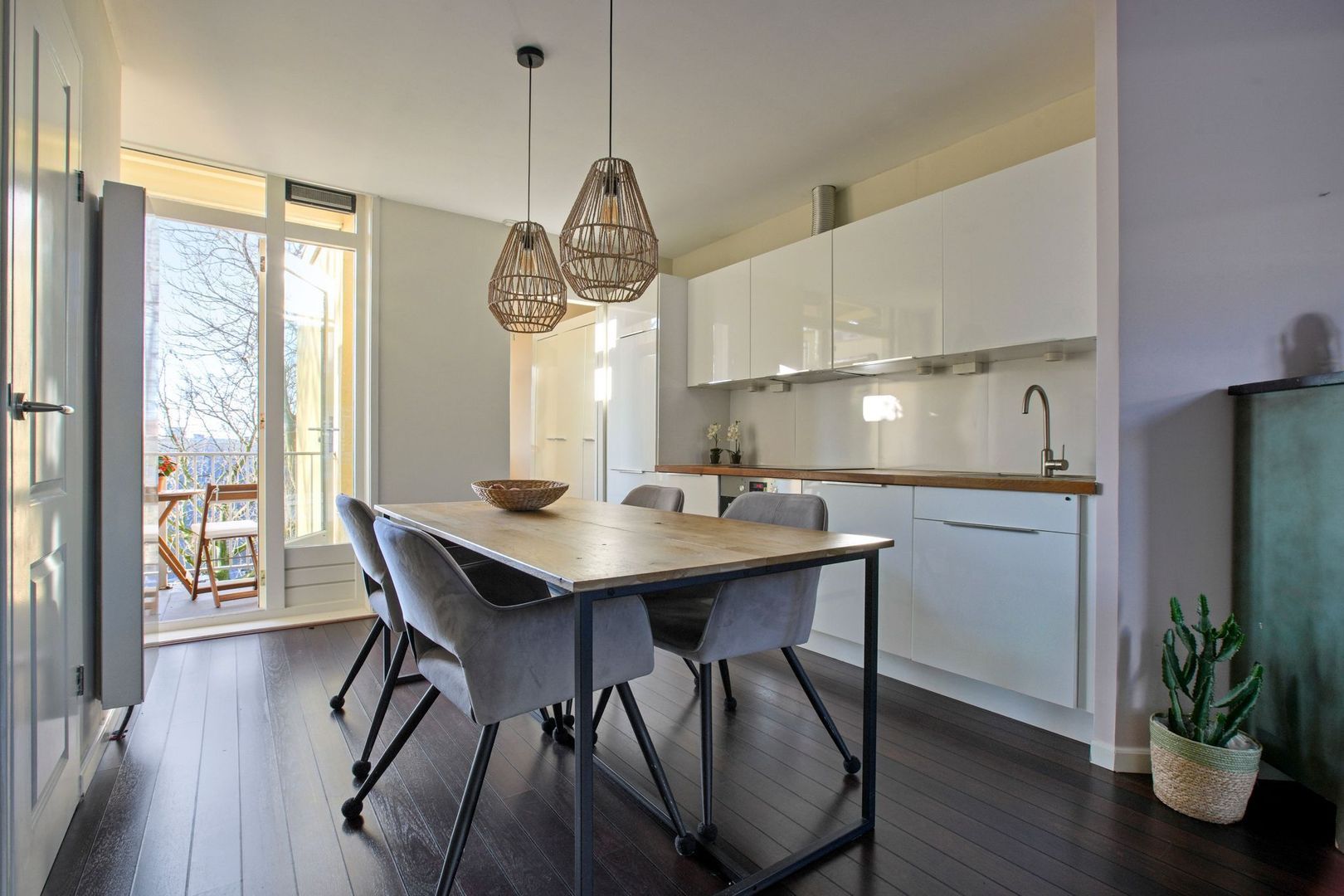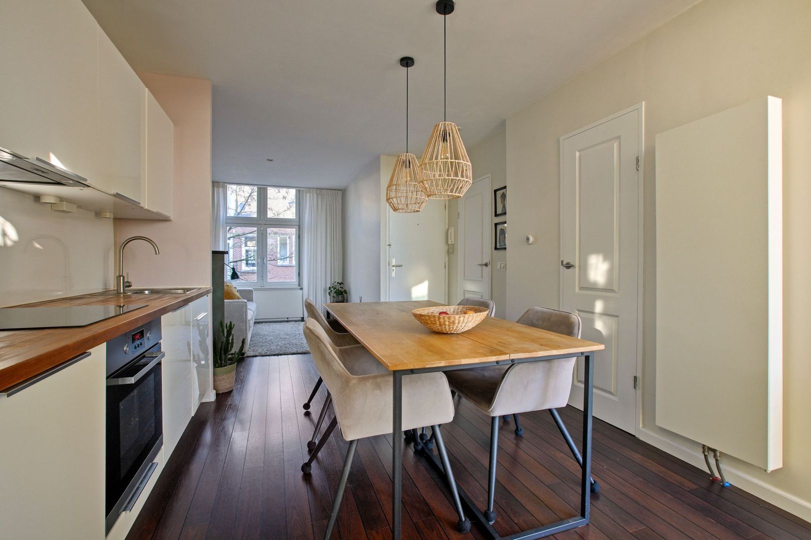 Via de entree op de begane grond leidt het ruime en lichte gemeenschappelijke trappenhuis naar het appartement op de derde verdieping waarbij je direct in de leefruimte binnenkomt. Aan de voorzijde is de gezellige zithoek te vinden die naadloos overloopt in de open keuken met plek voor een grote eettafel. De keuken is uitgevoerd met witte kasten en lades met een RVS greep in combinatie met een houten werkblad. Voorts is de keuken voorzien van diverse inbouwapparatuur. De wasmachine is tevens fraai weggewerkt in een van de keukenkasten. Vanuit de keuken biedt de brede deur toegang tot het beschut gelegen balkon van 3m². Met de ligging op het zuidwesten en het verre zicht is het hier heerlijk relaxen na een drukke werkdag.