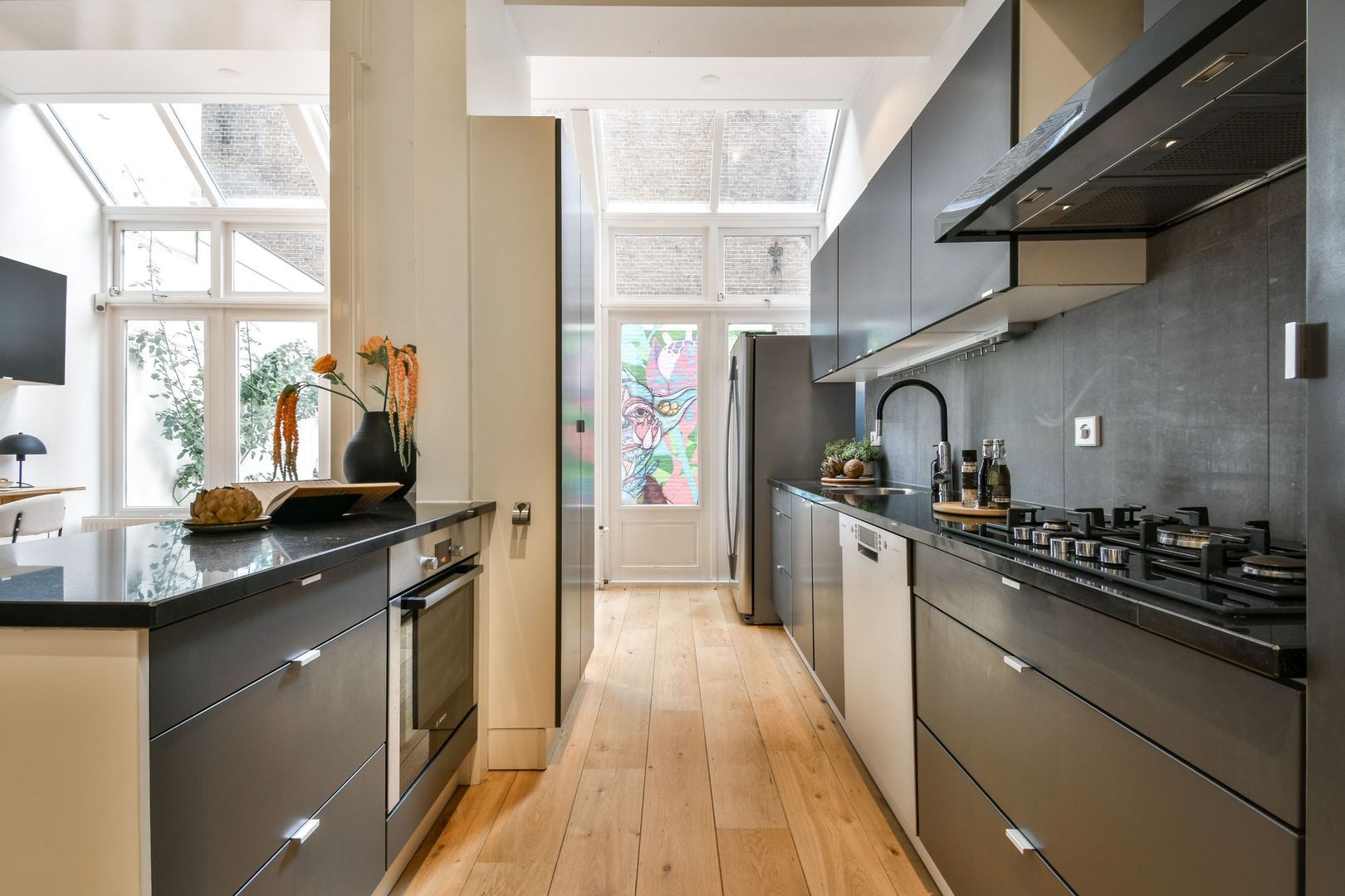 De woonkeuken is uitgevoerd in een tijdloos antraciet-wit kleurenschema met een donker natuurstenen werkblad. De keuken is uitgerust met hoogwaardige inbouwapparatuur, waaronder een opvallende hoge wijnklimaatkast. Een charmant detail vormt het glas-in-loodvenster tussen de keuken en de hal, dat zorgt voor extra licht en karakter.