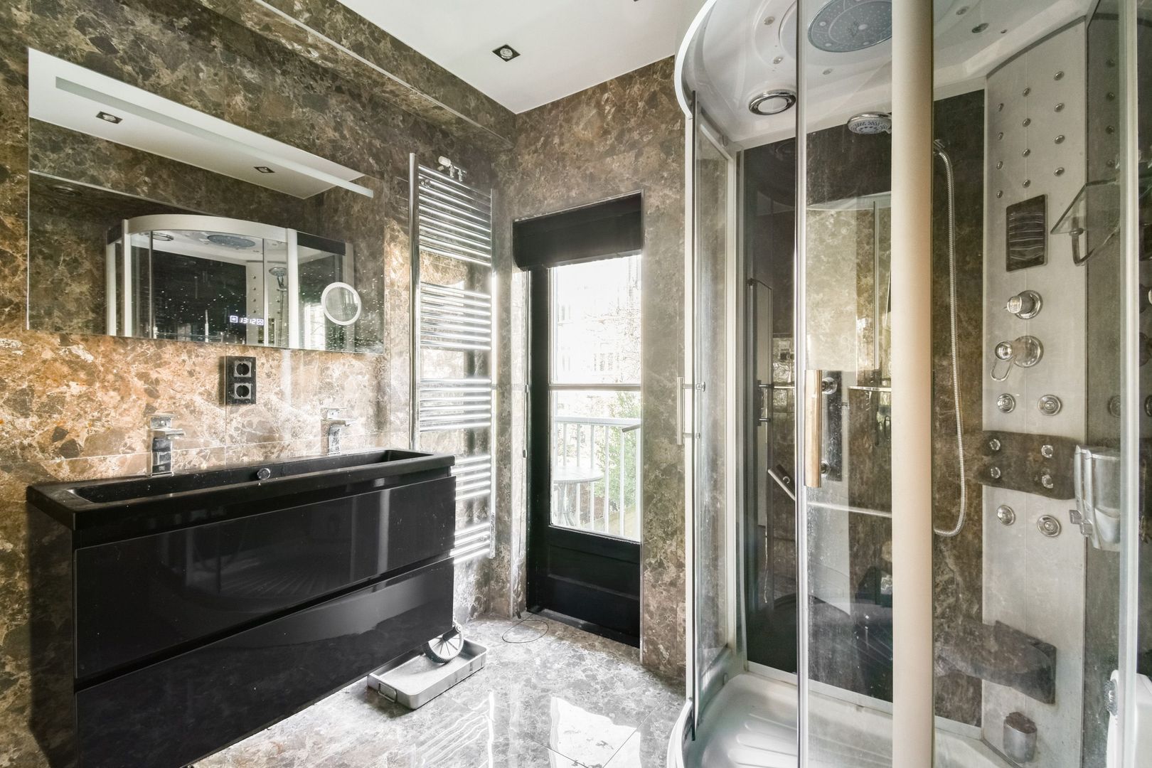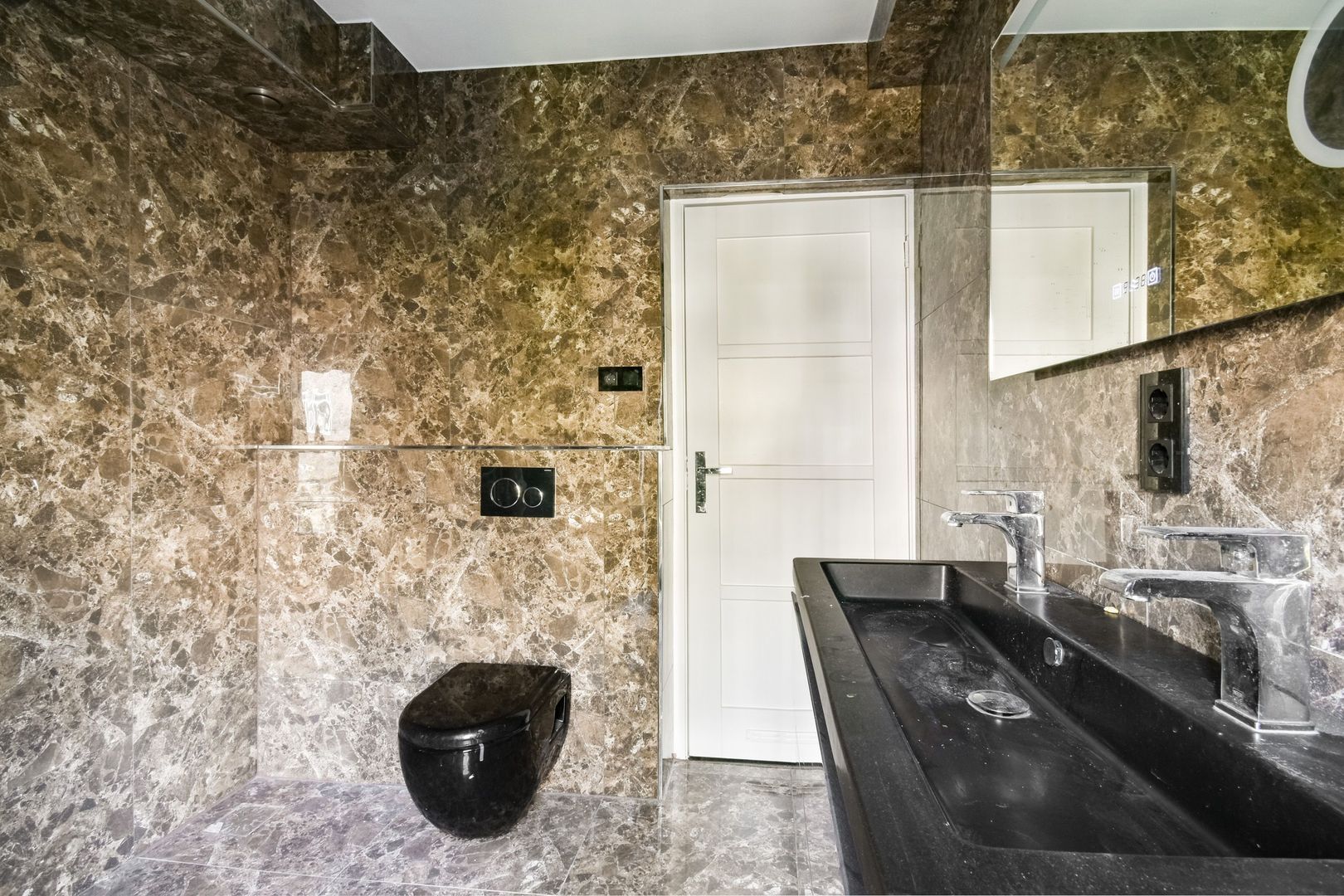 Naast de slaapkamer is de ruime badkamer gelegen, deze is uitgevoerd met een aardetint vloer- en wandtegel en heeft tevens toegang tot voornoemd balkon. De badkamer beschikt over een douchecabine met massage/stoomfunctie, toilet, hoogglans zwart wastafelmeubel met twee kranen en een handdoekradiator. Naast de badkamer en toegankelijk vanuit de hal is nog een separaat toilet gesitueerd, voorzien van de wasmachineaansluiting en de c.v. opstelling.