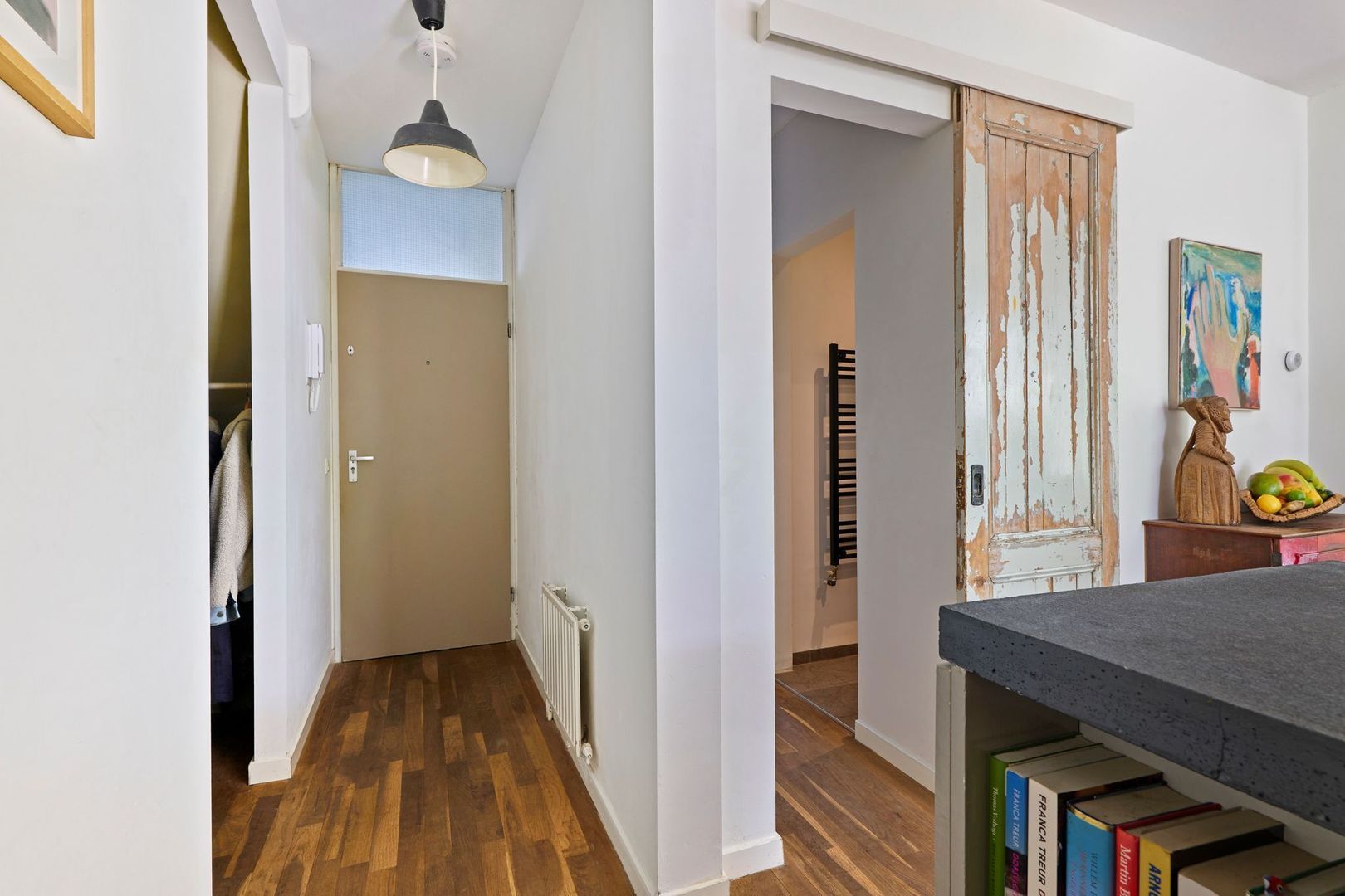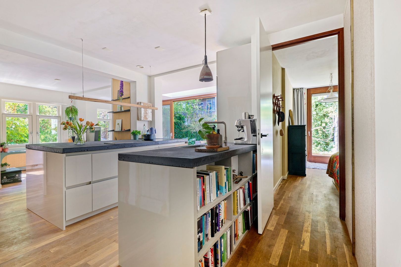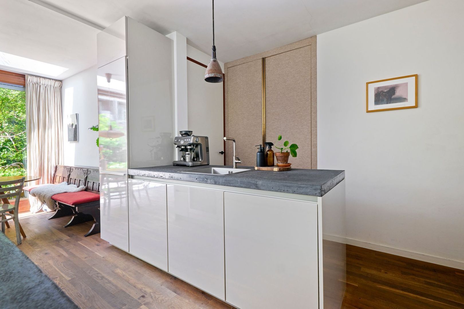 Tegenover de keuken, tenslotte, is nog een op maat gemaakte brede kast te vinden waarin de wasmachine/drogeraansluiting is geplaatst.