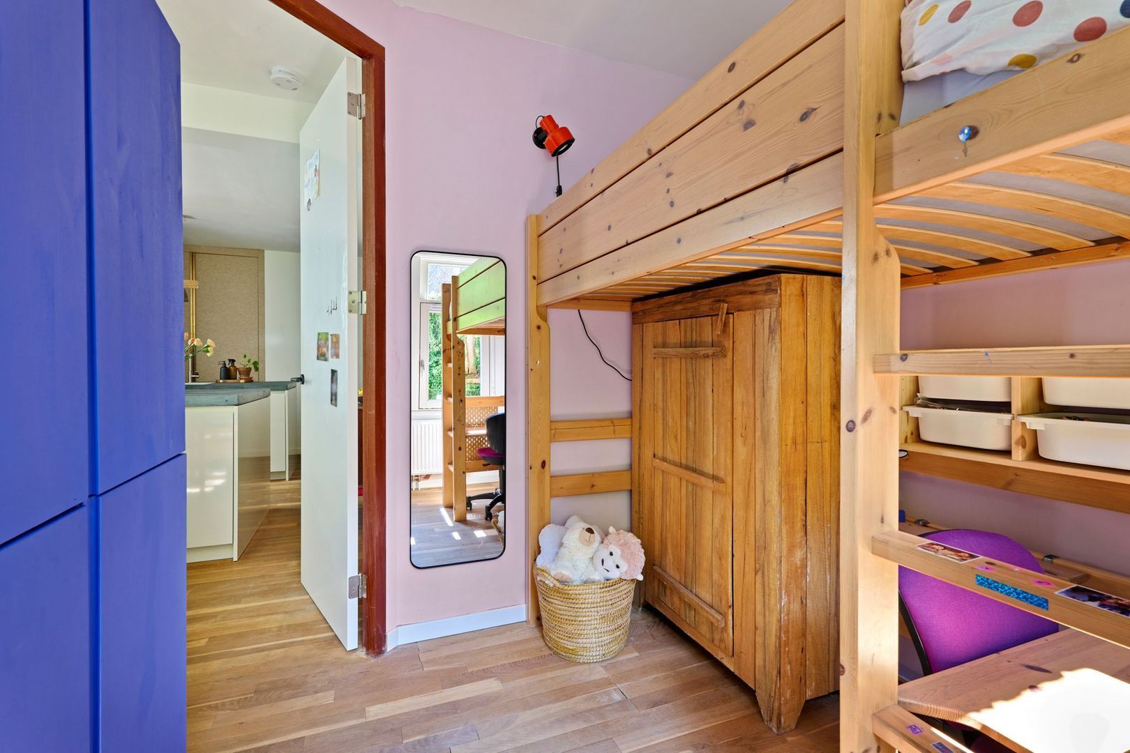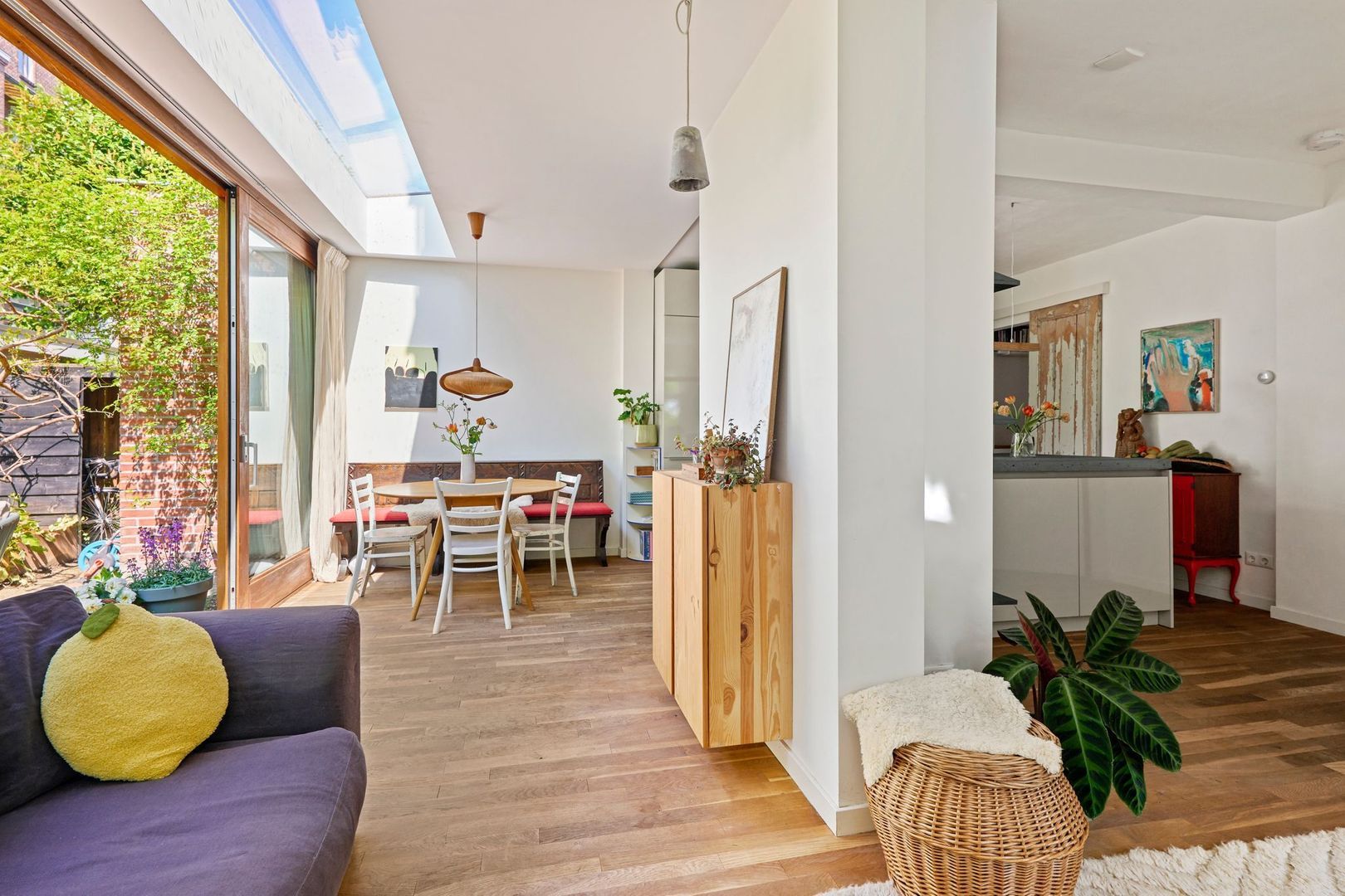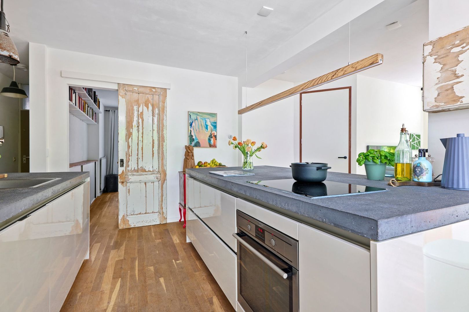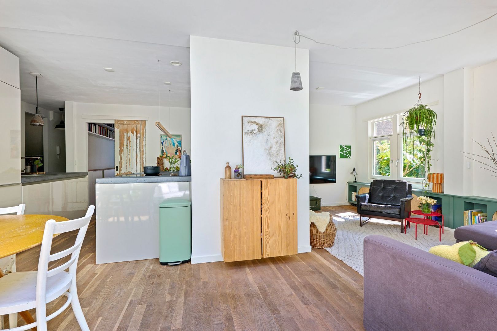 Tegenover de keuken, tenslotte, is nog een op maat gemaakte brede kast te vinden waarin de wasmachine/drogeraansluiting is geplaatst.
