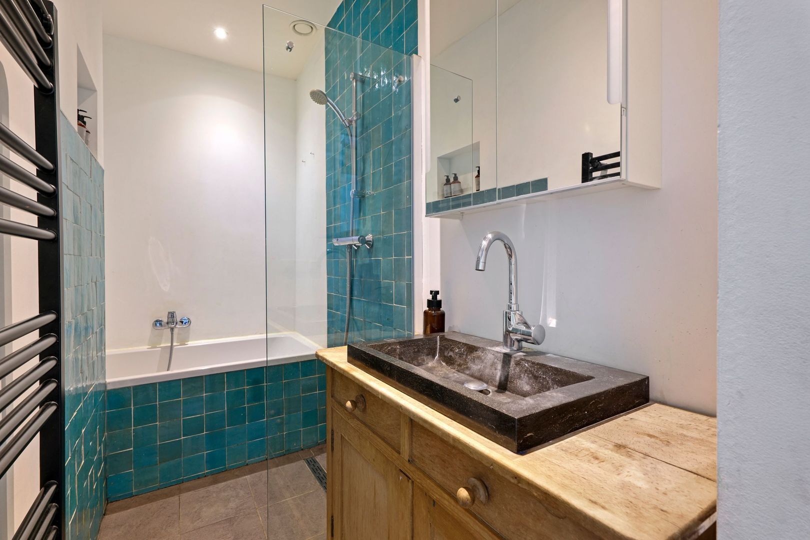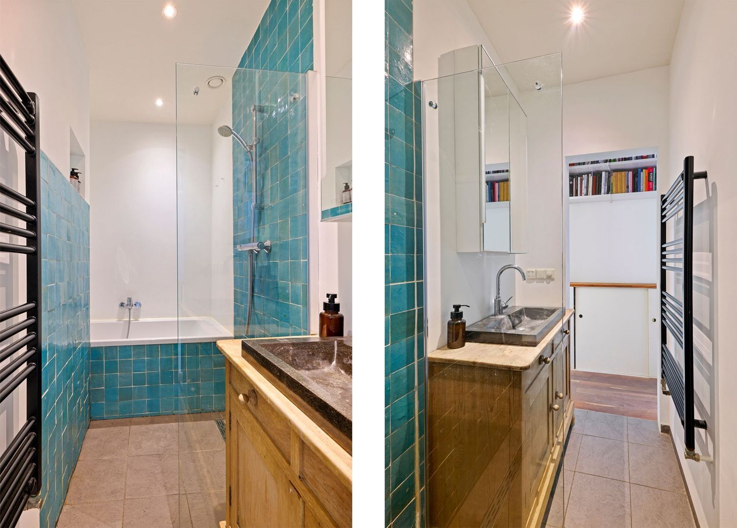 Aan de voorzijde van de woning is de hoofdslaapkamer gesitueerd, deze is voorzien van een ruime inbouwkast en een en-suite badkamer. De badkamer beschikt over een grijze vloertegel en een witte wand in combinatie met een gedeeltelijk groen betegelde wand. Voorts is de badkamer uitgevoerd met een ligbad, inloopdouche, handdoekradiator en een houten wastafelmeubel met een antraciet natuurstenen wastafel.