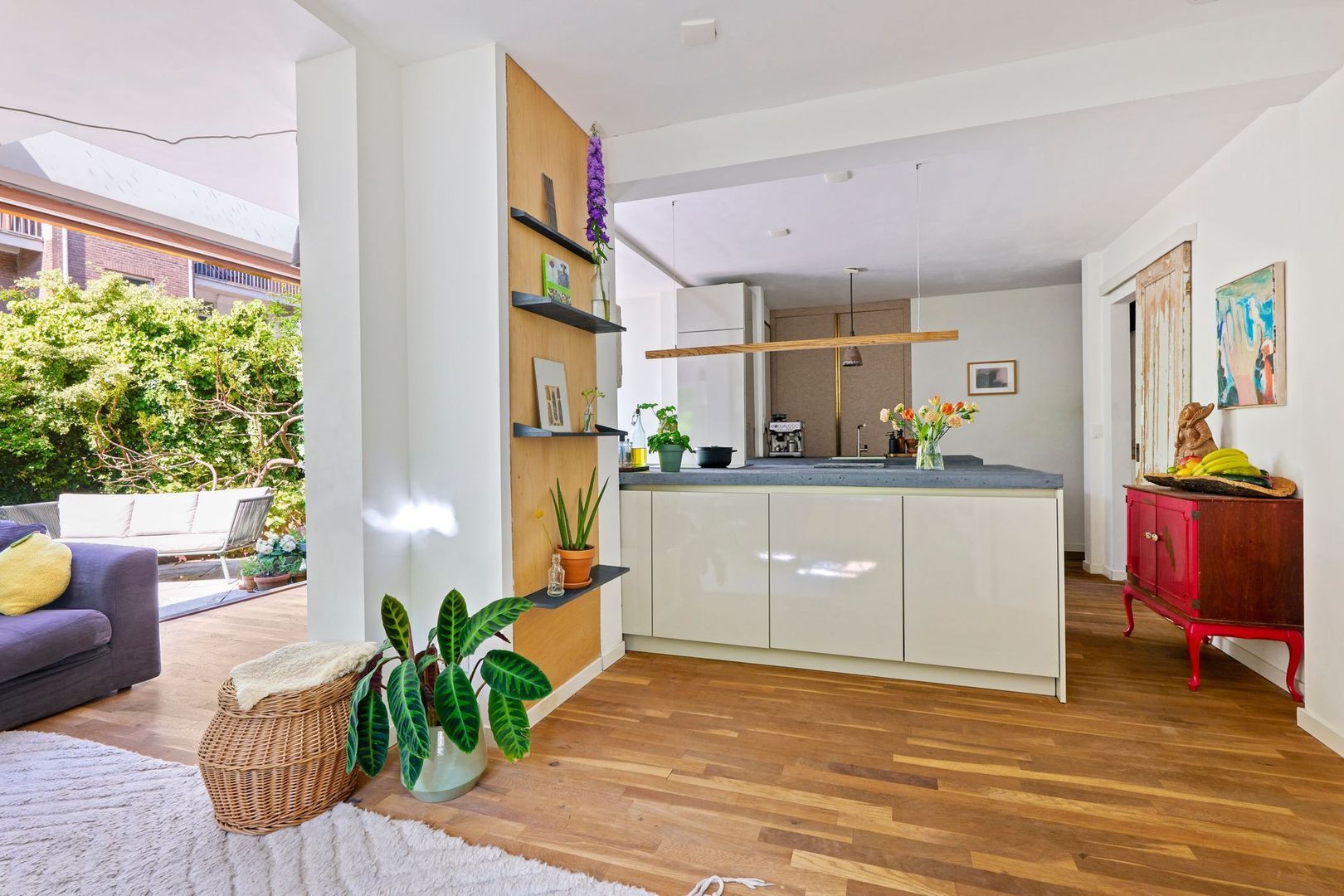 Via de gemeenschappelijke entree leidt de centrale hal naar de entree van dit appartement. De eigen hal met garderobe en separaat toilet geeft toegang tot de gezellige open living. Deze ruimte beschikt over zijramen en een brede schuifpui die naadloos aansluit op de achtertuin. De moderne woonkeuken is uitgevoerd met een kookeiland en een tegenover gelegen spoeleiland, beide voorzien van greeploze kasten en lades in een beige kleurstelling in combinatie met een robuust betonnen werkblad. Voorts is de keuken voorzien van diverse inbouwapparatuur. Leuk detail is de halfhoge boekenwand aan de halzijde. De woonkeuken loopt direct over in de gezellige zitkamer. Hier is plaats voor een mooie grote lounge evenals een werk- of speelhoek. Tevens is er genoeg ruimte voor een eettafel direct naast de keuken.